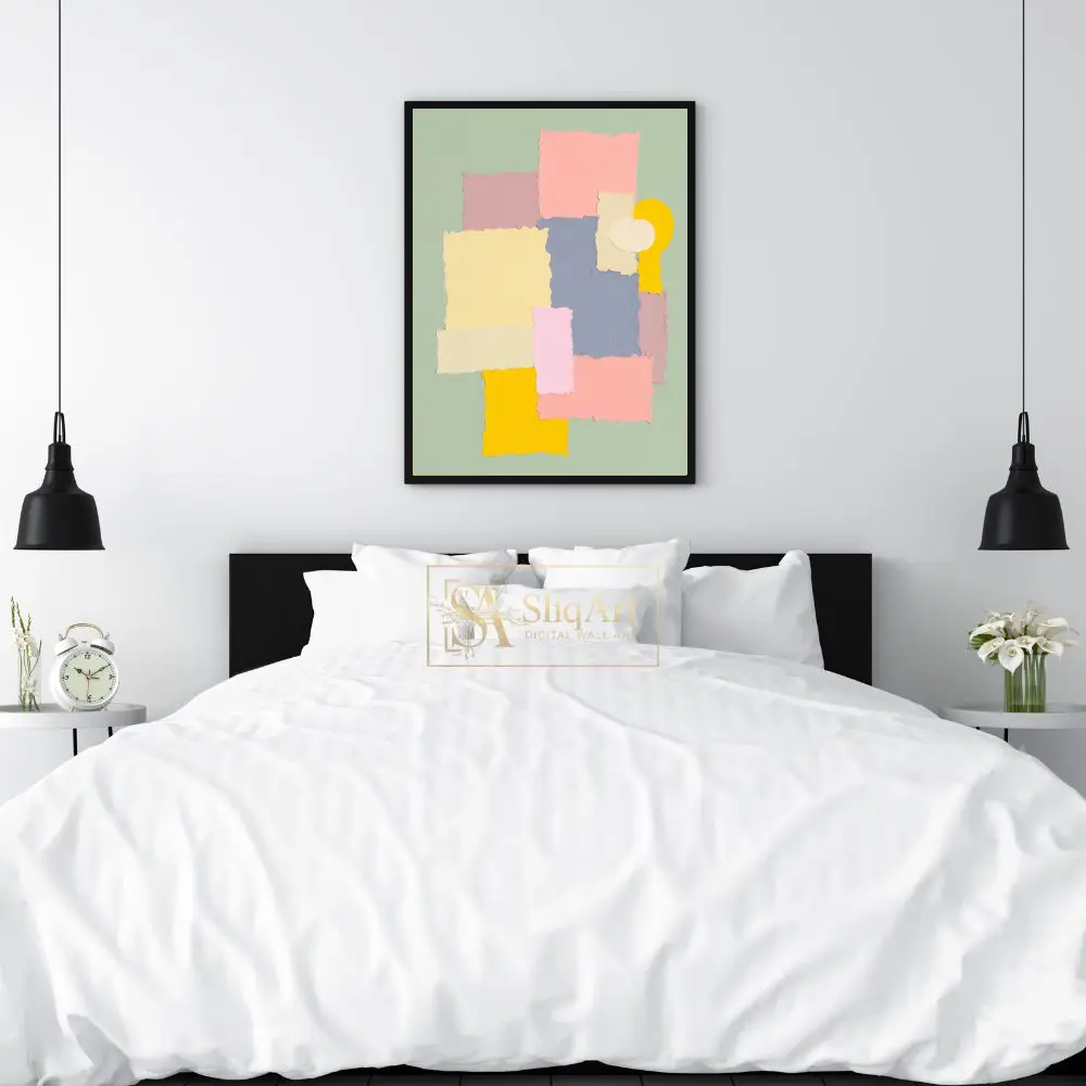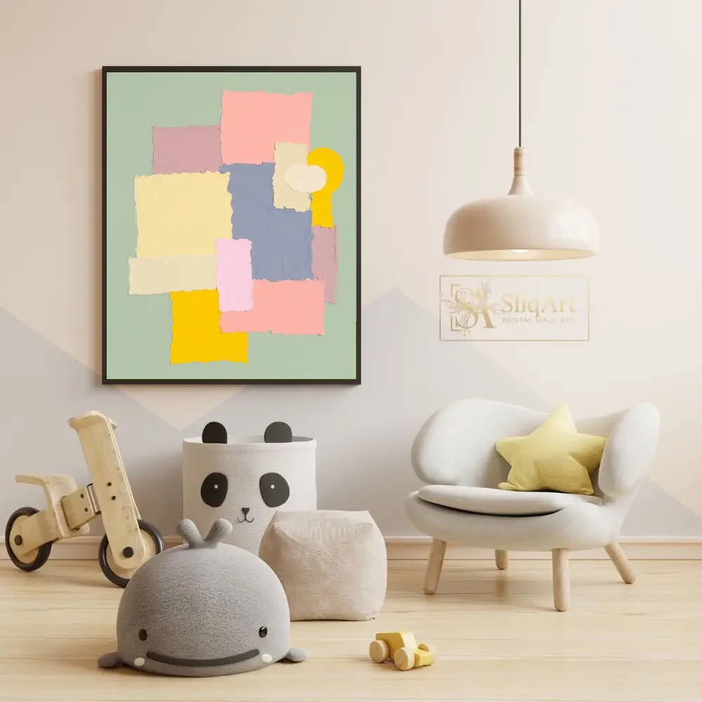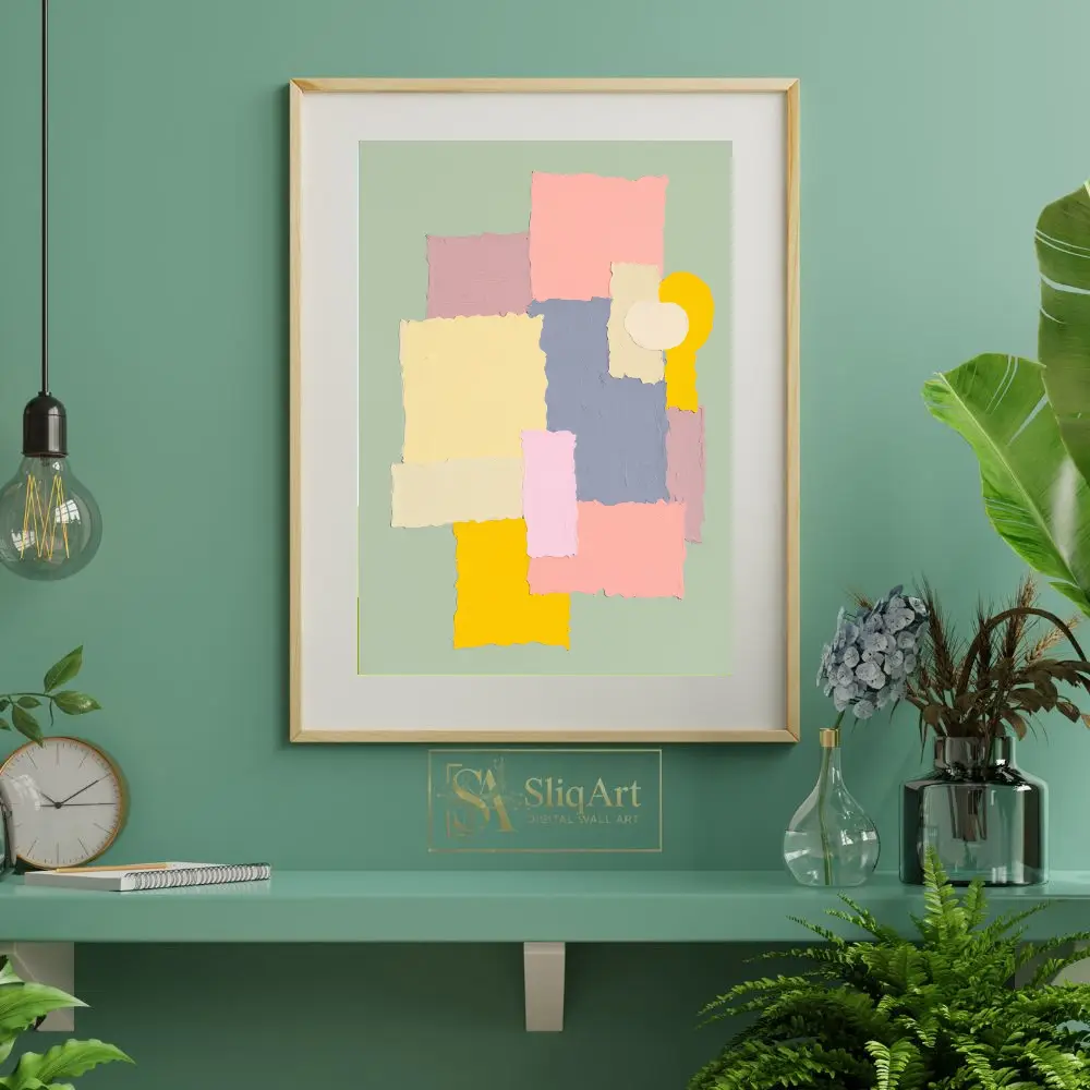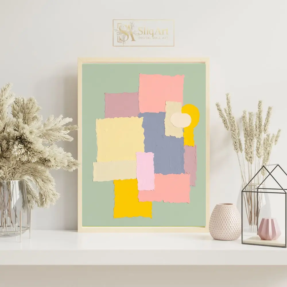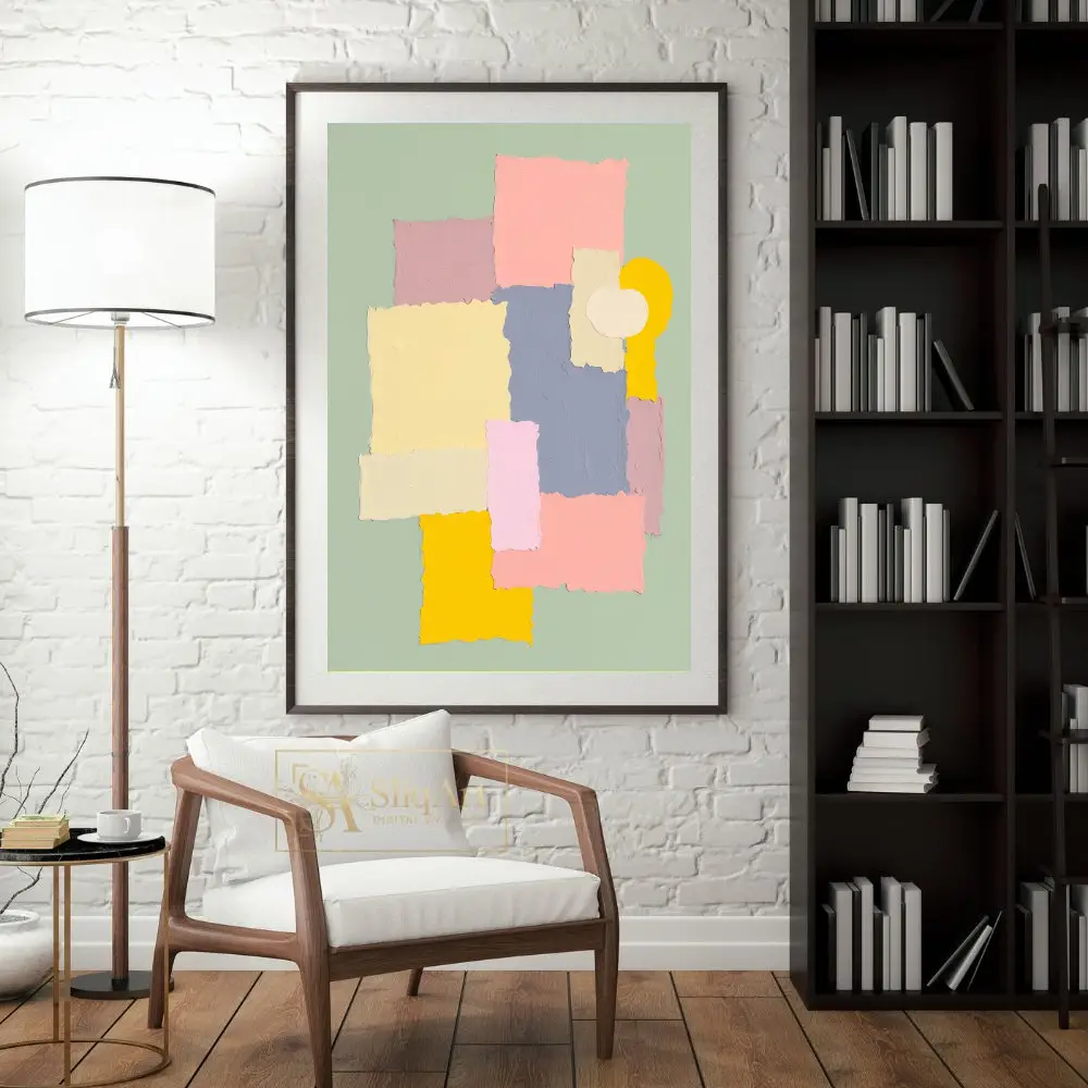 Utilizing a heavy impasto technique, the thick paint creates tangible depth and deckled edges that mimic the look of torn paper collages. Set against a calming sage green background, the layers of dusty pink, lemon yellow, lavender, and cream create a harmonious visual rhythm. Perfect for those who appreciate the intersection of minimalist geometry and rich, tactile craftsmanship.