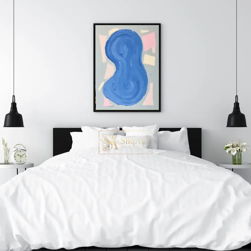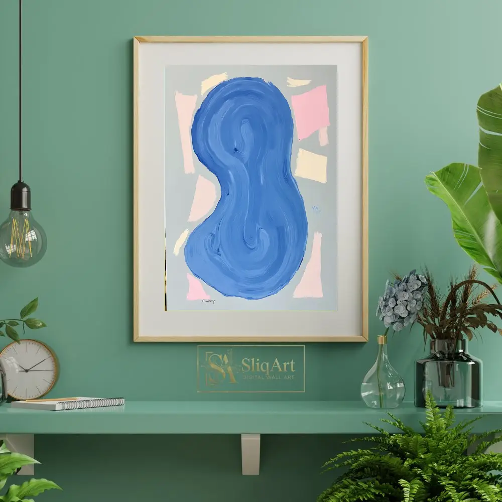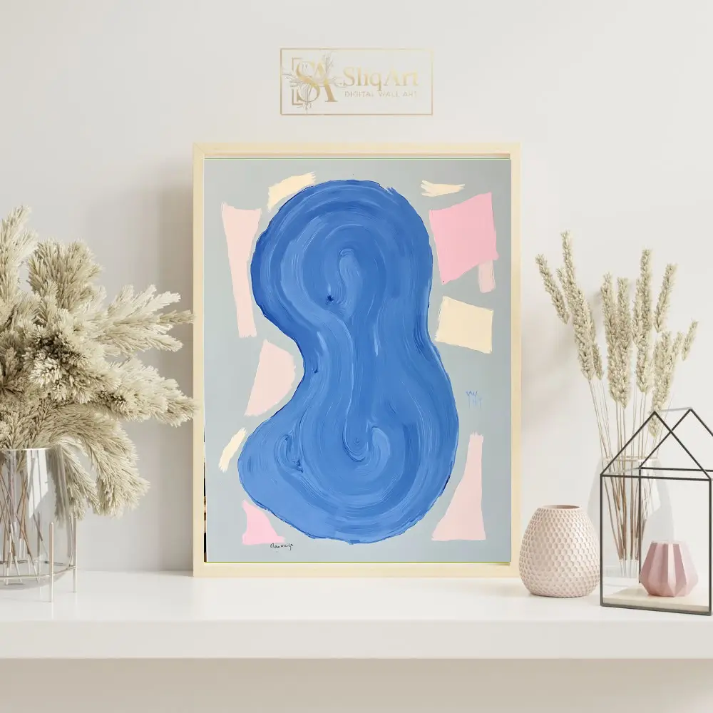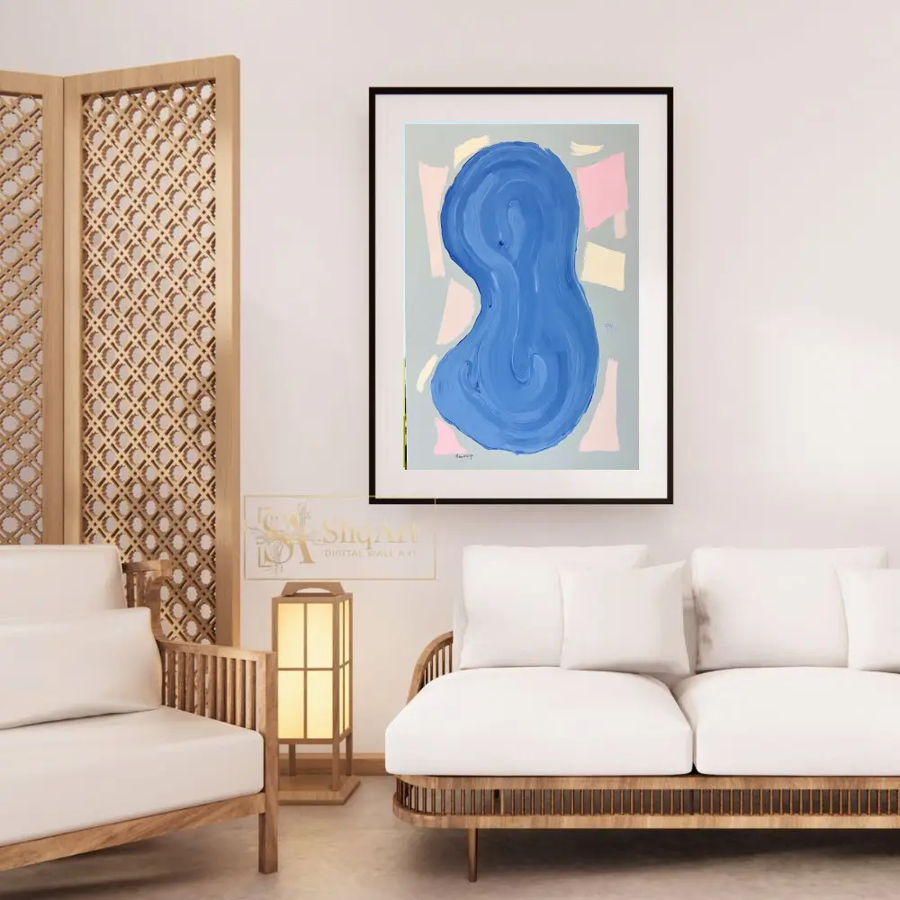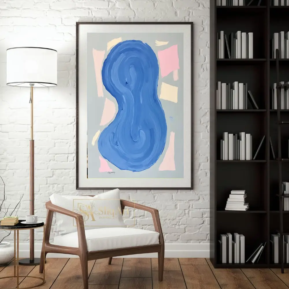 Transform your living space with ‘Azure Flow,’ a stunning contemporary abstract piece. The composition is centered around a large, organic blue form with visible, sweeping brushstrokes that create a sense of fluid motion.
