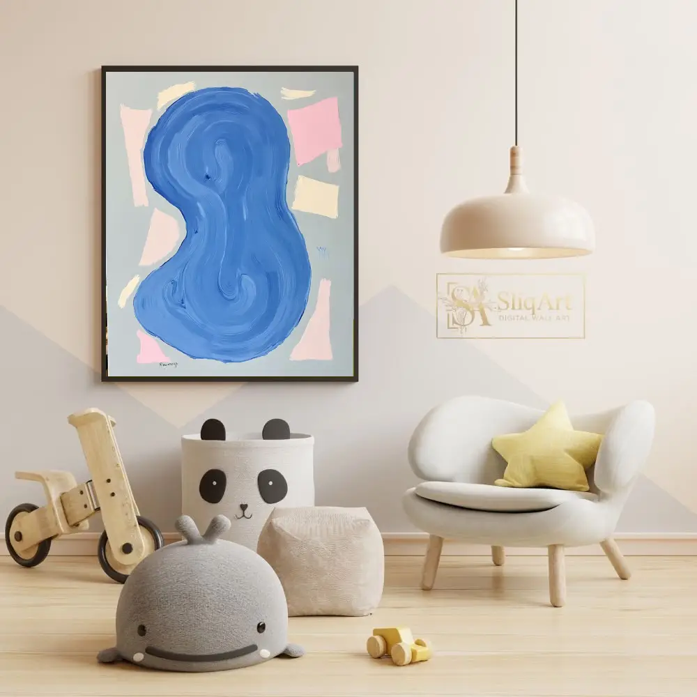 This bold central figure is harmoniously balanced by a scattering of soft pastel pink and cream geometric shapes and expressive marks, all set against a calming, light grey-blue background. The interplay of bold color and delicate pastels makes this artwork a versatile and sophisticated addition to any modern interior.