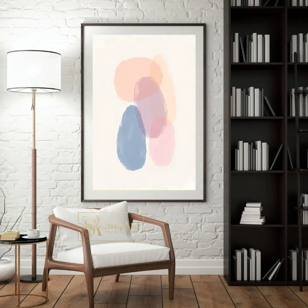 Elevate your interior with this serene minimalist abstract art piece. Featuring a collection of soft, overlapping watercolor shapes in a palette of muted blue, dusty rose, and peach, this artwork evokes a sense of calm and balance.