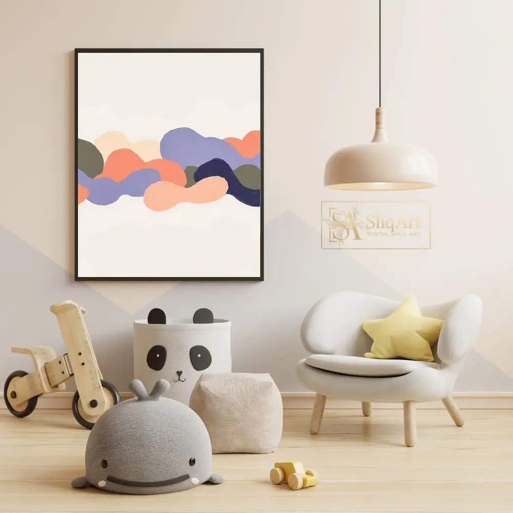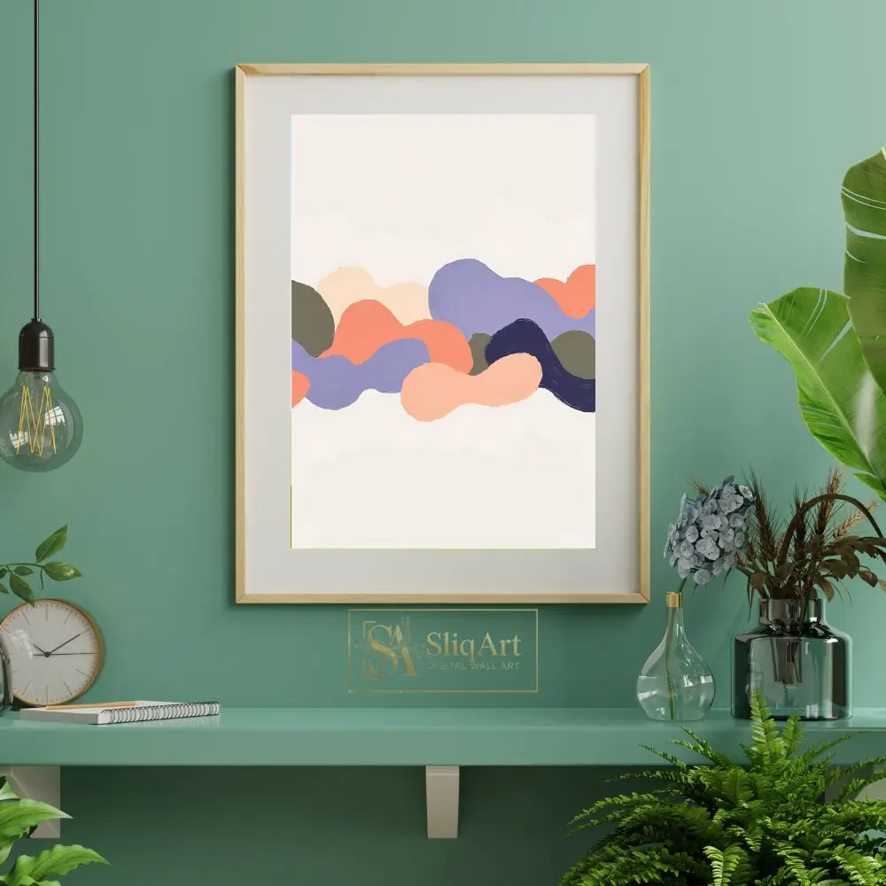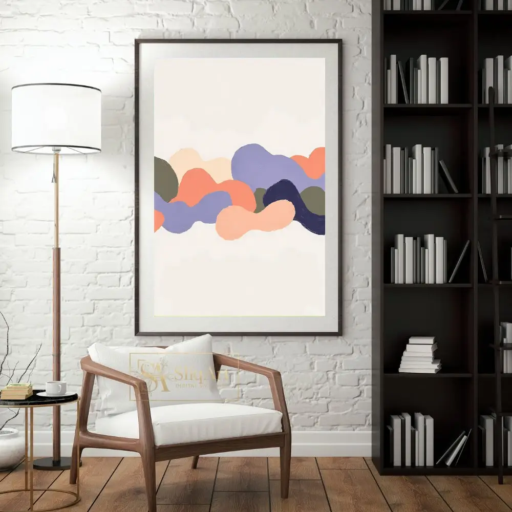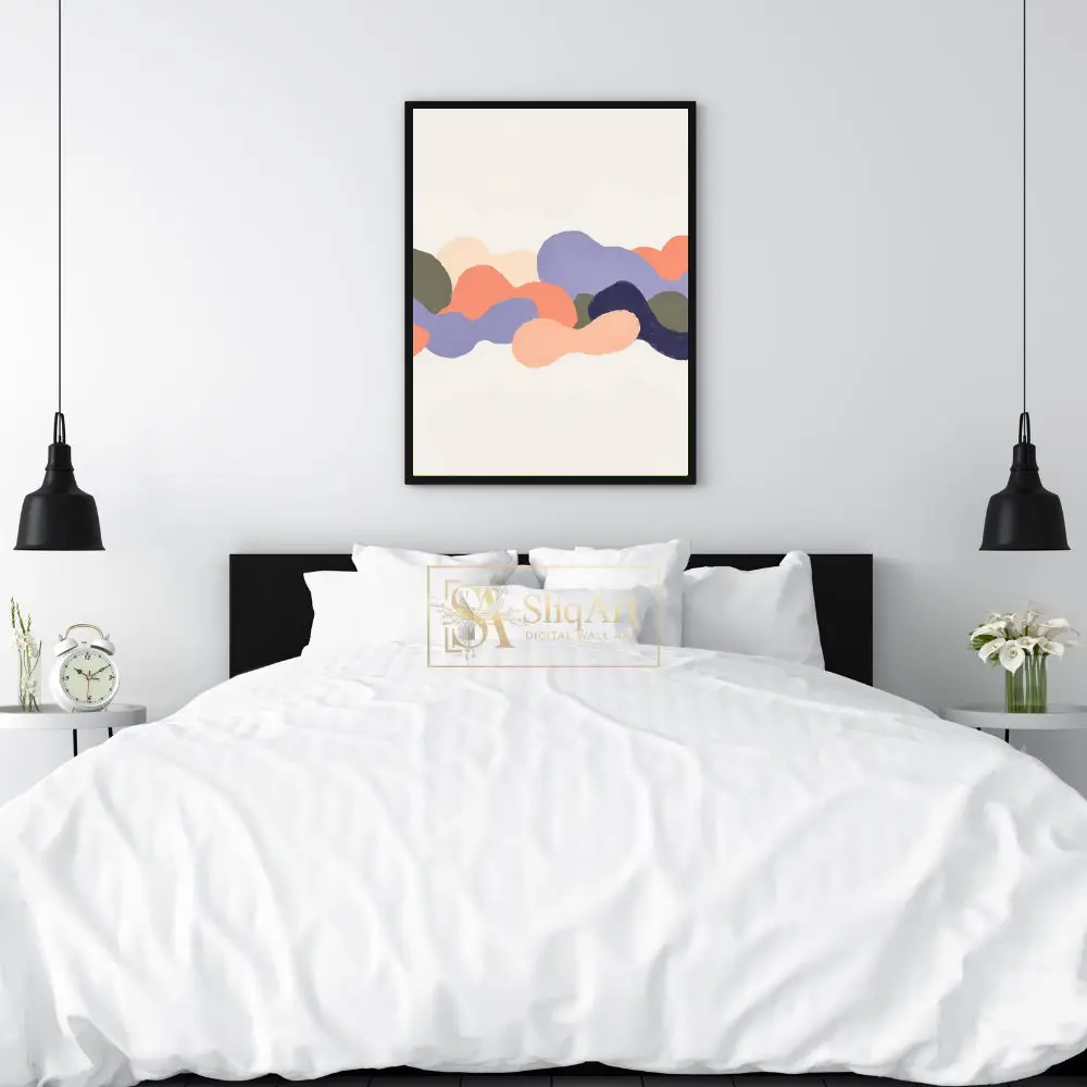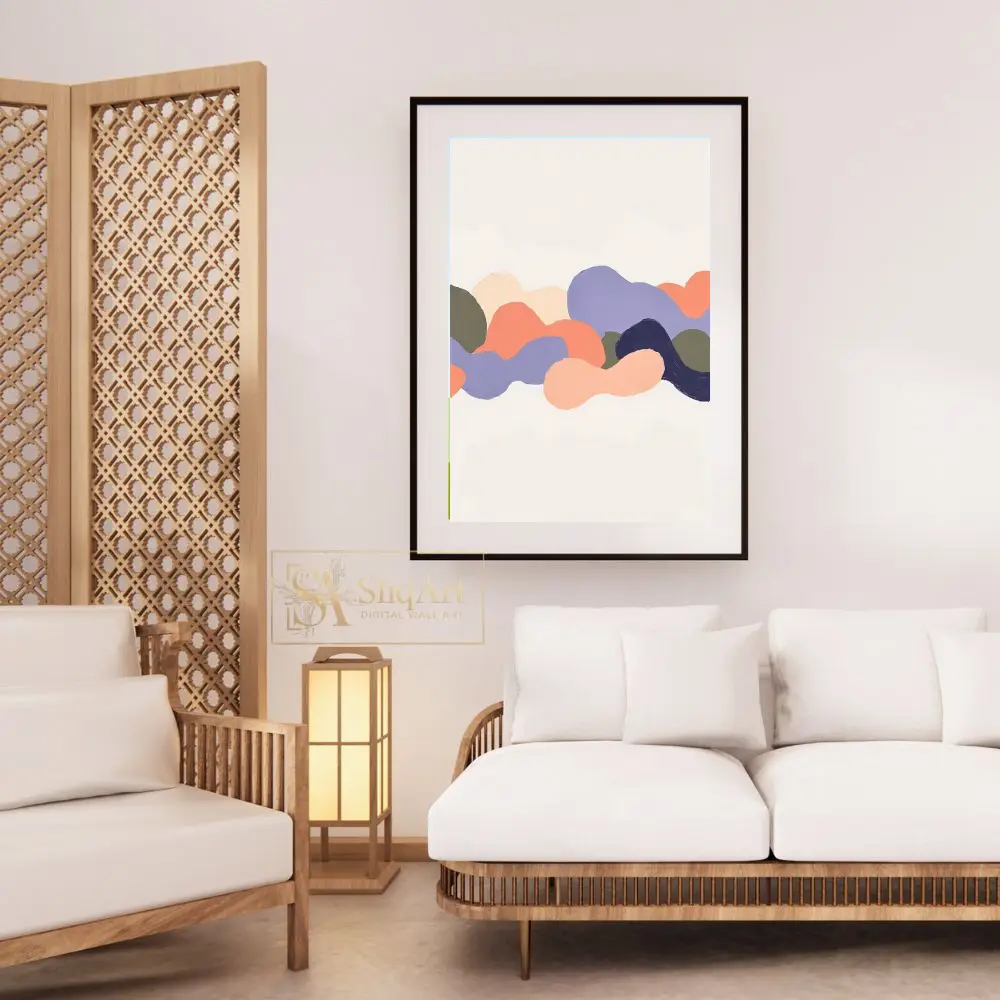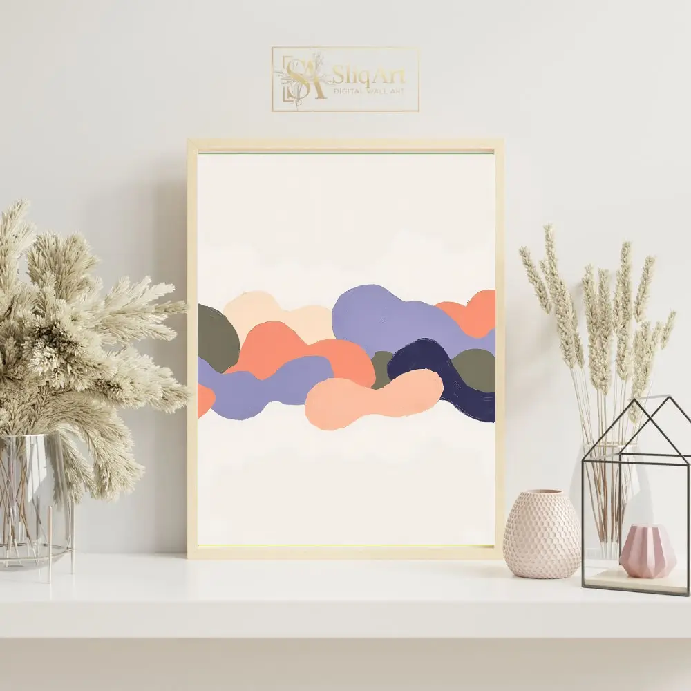 Enhance your living space with this sophisticated minimalist abstract painting. The artwork features a horizontal arrangement of flowing, organic shapes in a balanced palette of soft lavender, warm terracotta, muted sage, and deep navy blue.