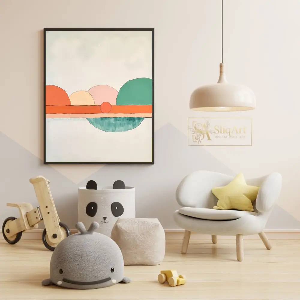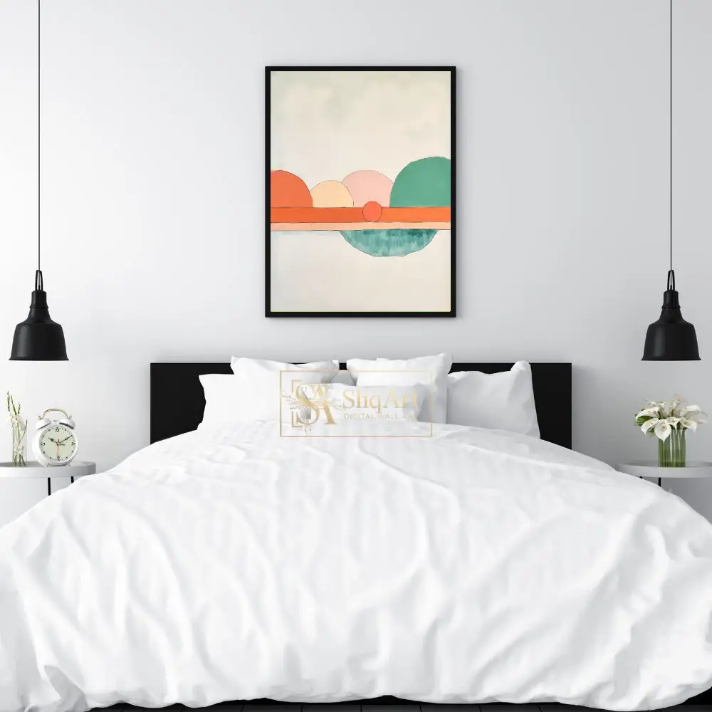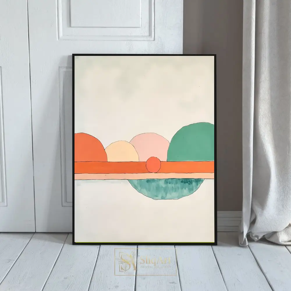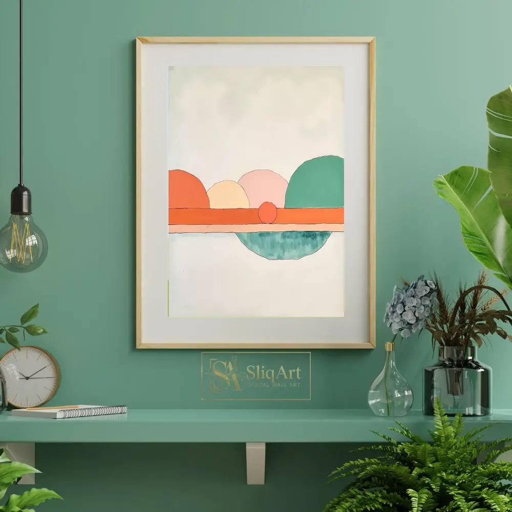 Elevate your interior with this serene minimalist abstract landscape. The composition features a harmonious series of organic, semi-circular shapes in a balanced palette of terracotta, soft pink, and muted teal, set against a clean off-white background.