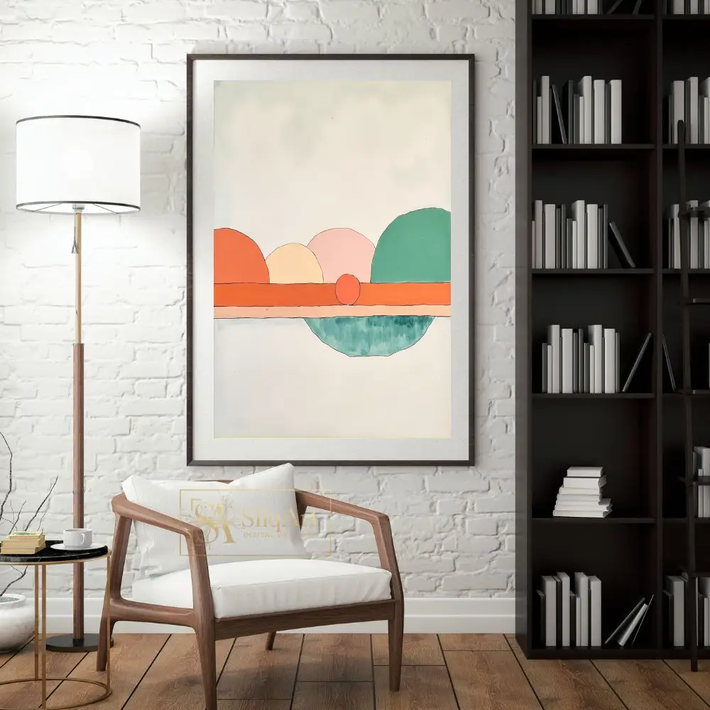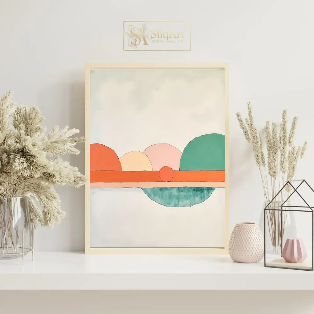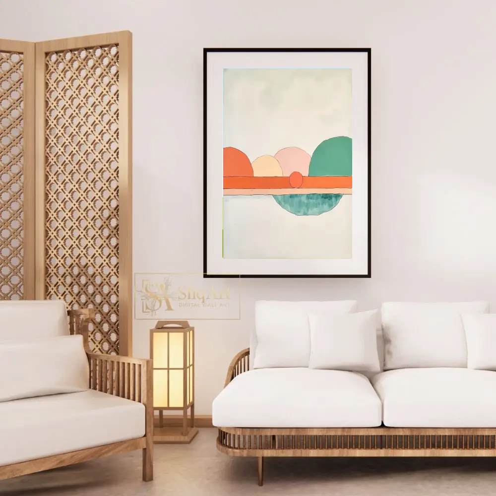 This piece captures the essence of a stylized horizon, blending geometric simplicity with a warm, earthy aesthetic. Inspired by mid-century modern design, it offers a sophisticated visual retreat that complements contemporary and boho-inspired decor styles alike.