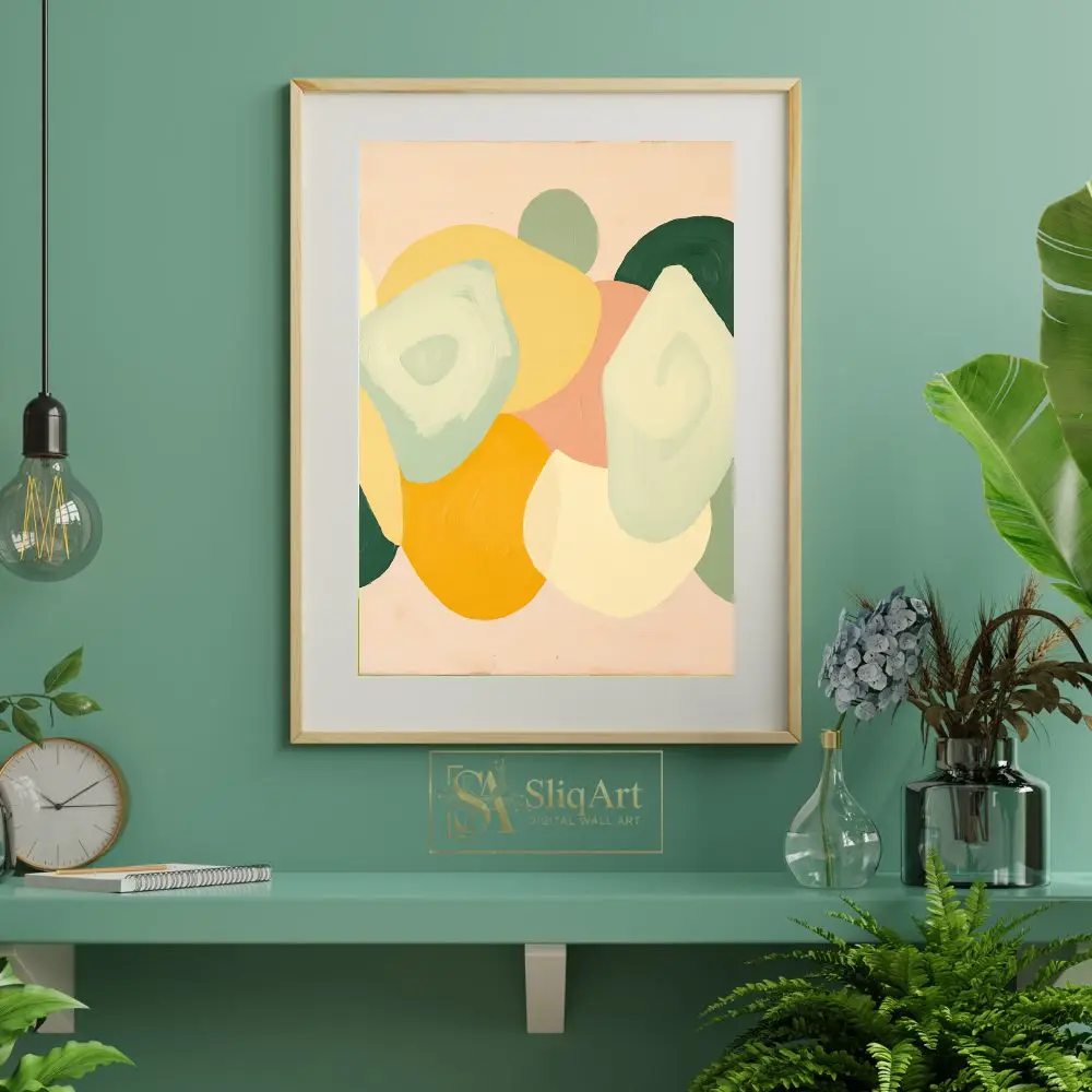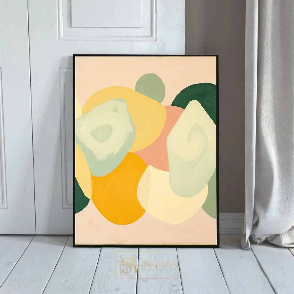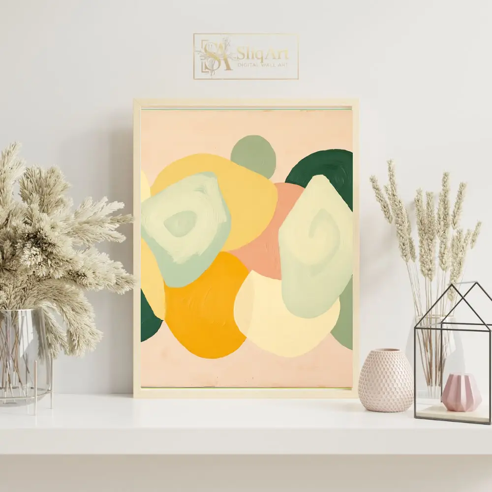 Elevate your interior with this captivating modern abstract art piece, featuring a harmonious blend of organic shapes and a soothing pastel palette. The composition showcases soft, rounded forms in mustard yellow, sage green, and earthy terracotta, set against a delicate pale pink background.