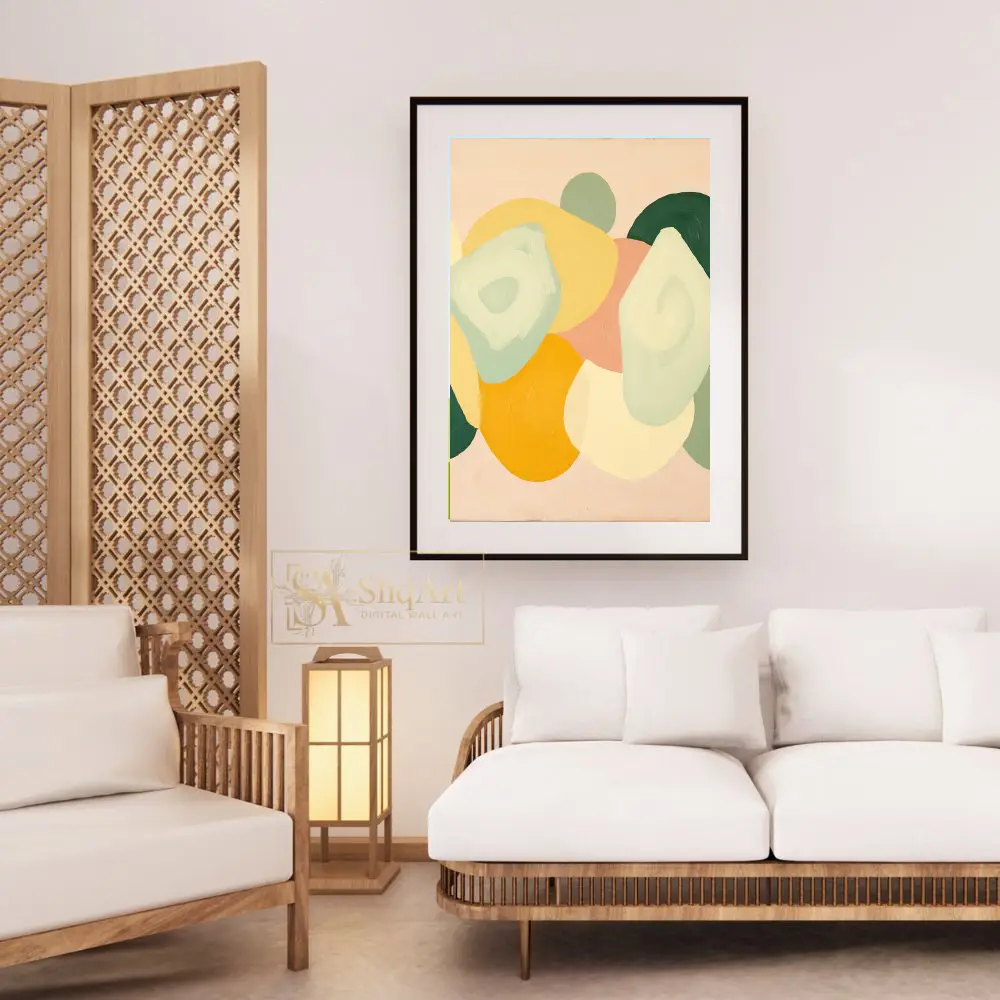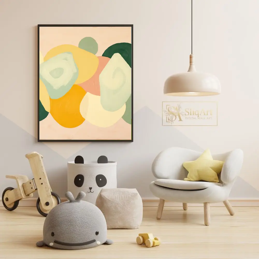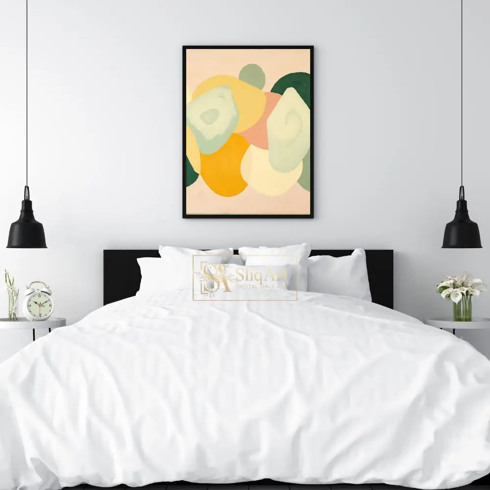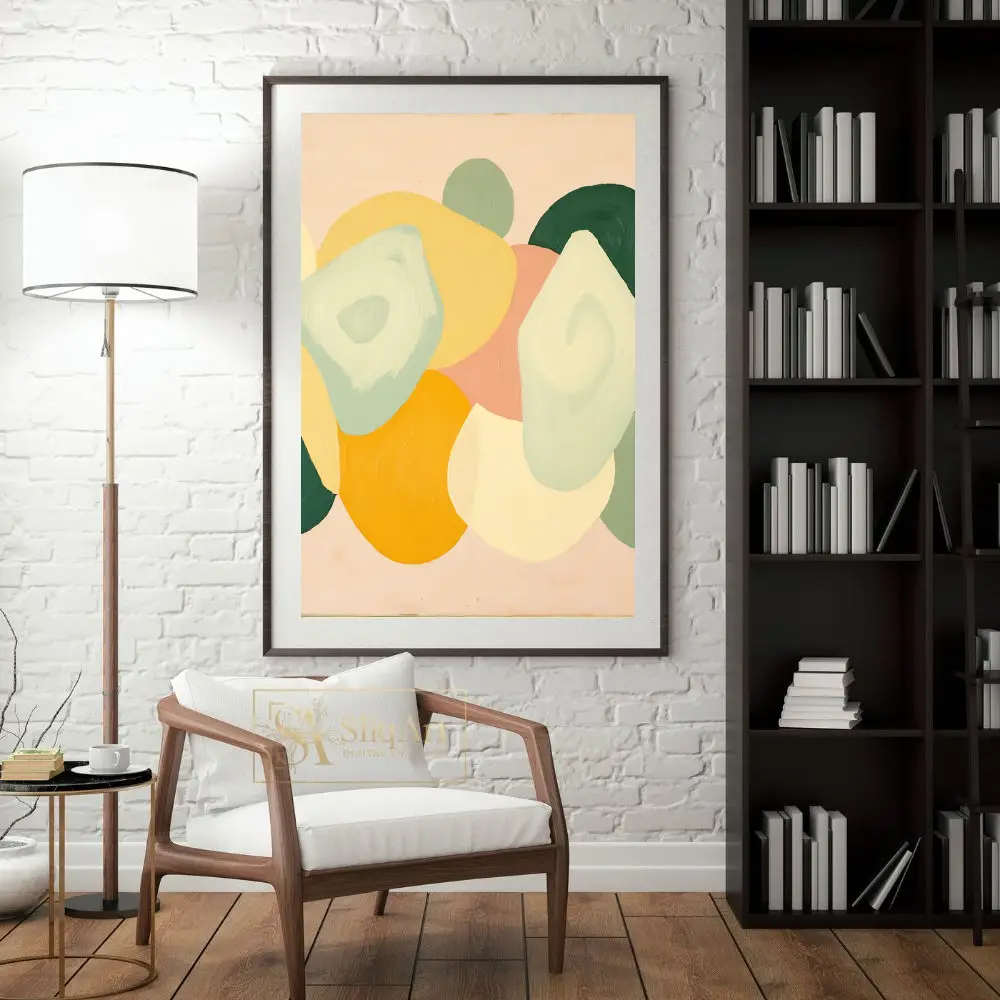 Elevate your interior with this captivating modern abstract art piece, featuring a harmonious blend of organic shapes and a soothing pastel palette. The composition showcases soft, rounded forms in mustard yellow, sage green, and earthy terracotta, set against a delicate pale pink background.