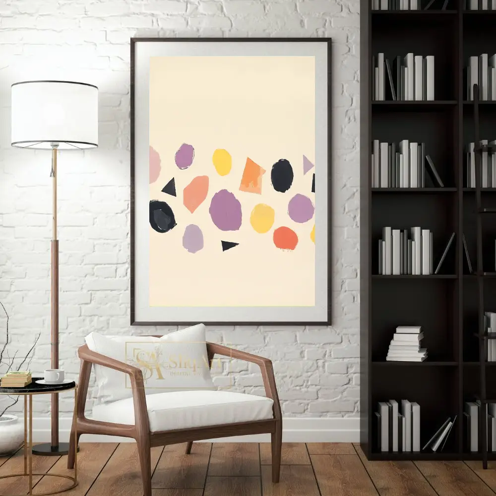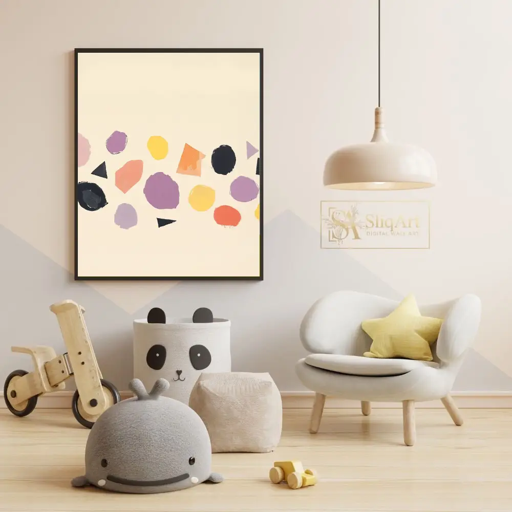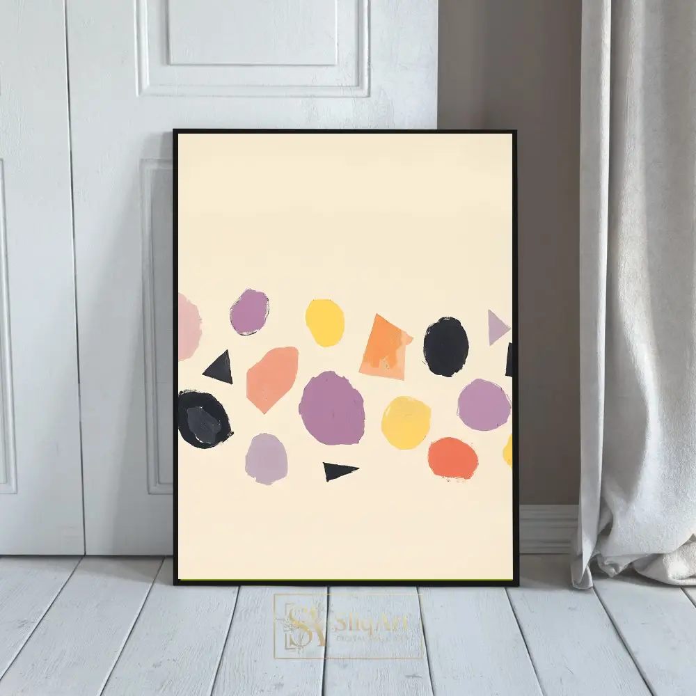Add a touch of playful sophistication to your walls with this minimalist abstract composition. Featuring a curated arrangement of organic circles, triangles, and irregular polygons, this piece balances a warm cream background with vibrant pops of purple, mustard yellow, and coral.