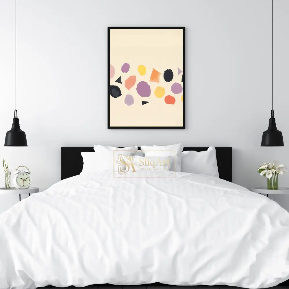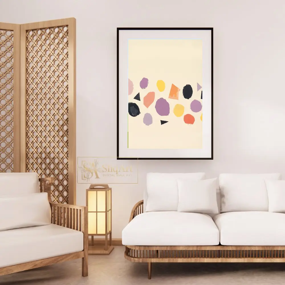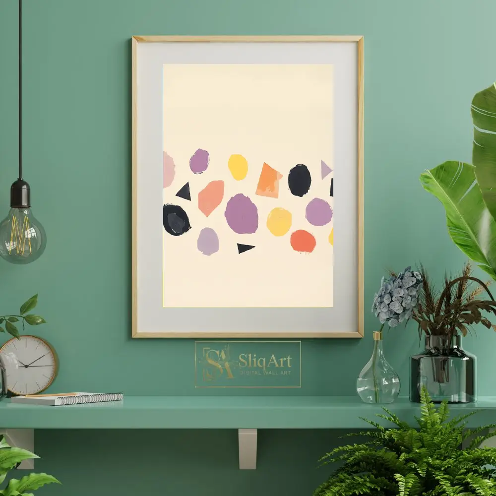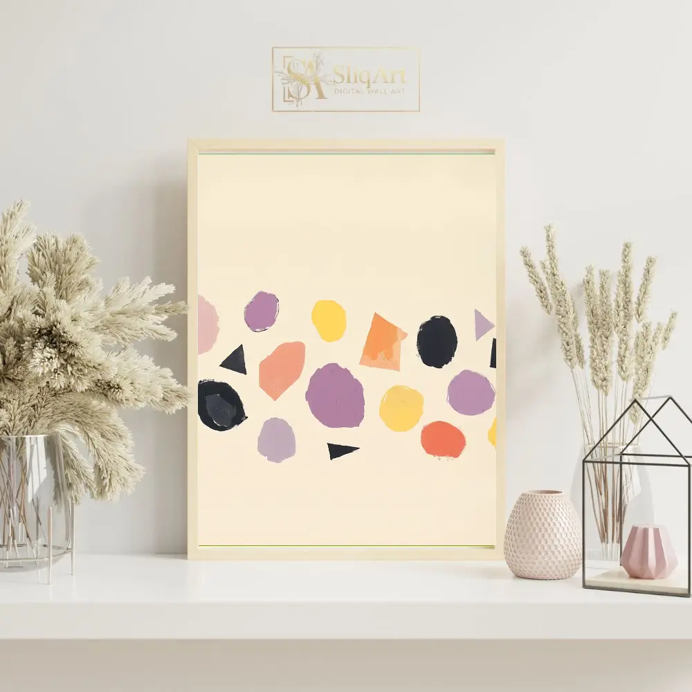 Add a touch of playful sophistication to your walls with this minimalist abstract composition. Featuring a curated arrangement of organic circles, triangles, and irregular polygons, this piece balances a warm cream background with vibrant pops of purple, mustard yellow, and coral.