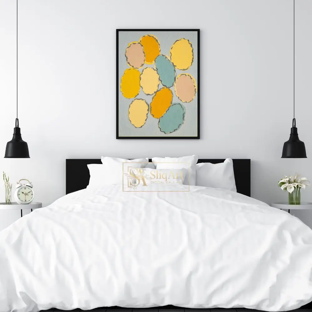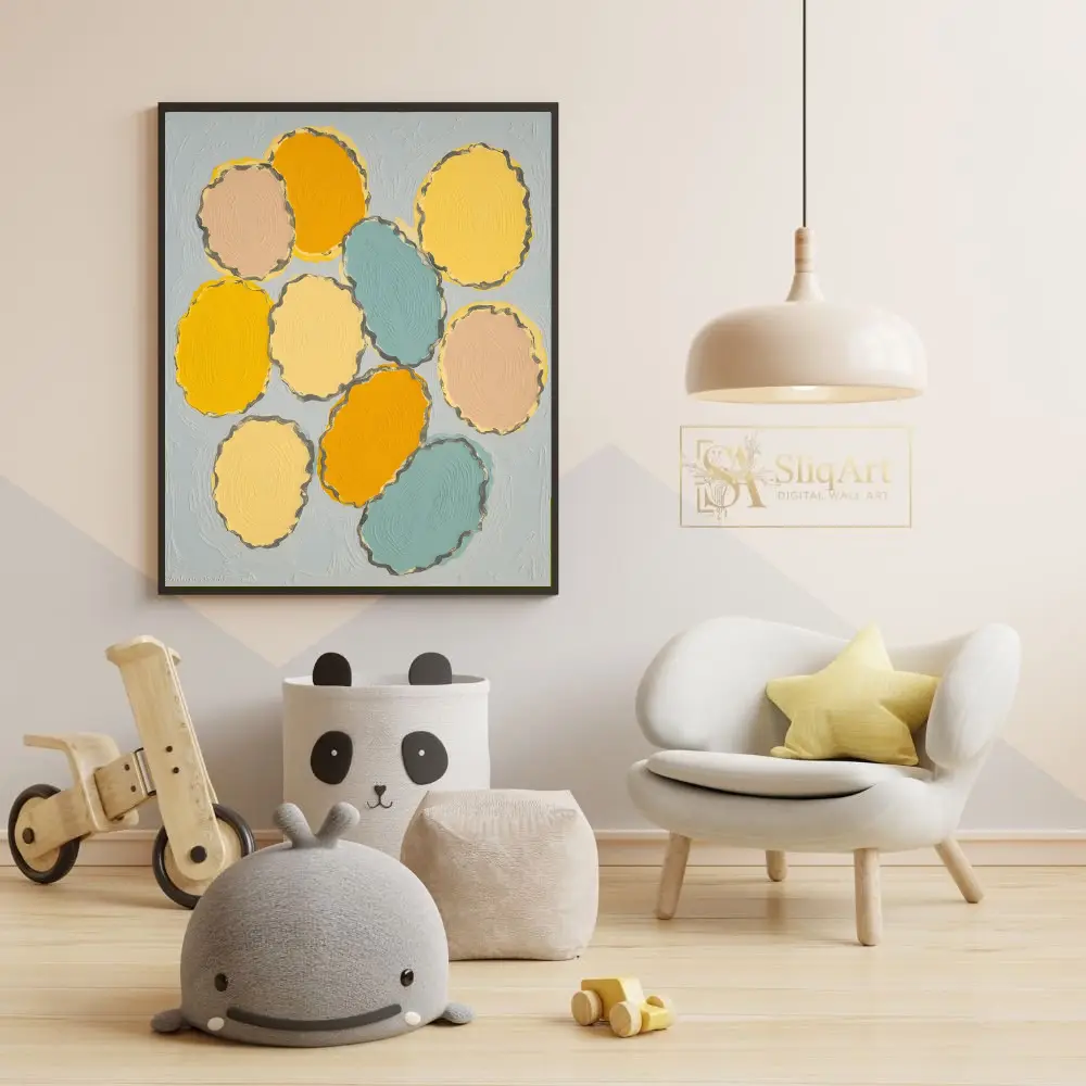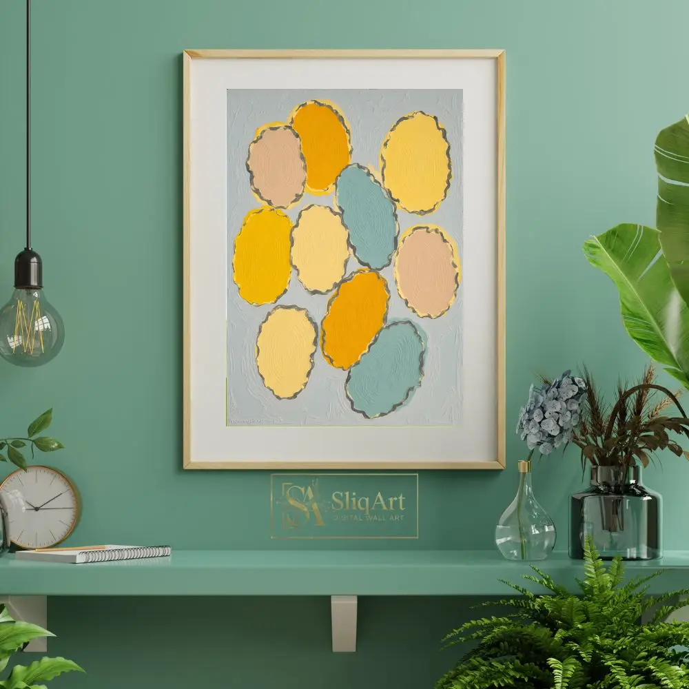 The vibrant palette combines warm mustard yellows and soft peach tones with cool, muted teal, all set against a calming light grey background. The dark, undulating outlines around each form provide a modern, graphic edge, making this a perfect centerpiece for contemporary home decor.