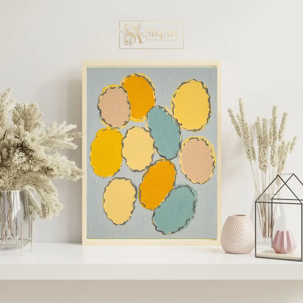 This sophisticated abstract piece features a collection of organic, oval forms inspired by the internal structures of geodes. Each shape is rendered with a heavy impasto technique, creating deep, concentric ridges that add a tangible sense of depth and movement to the canvas.