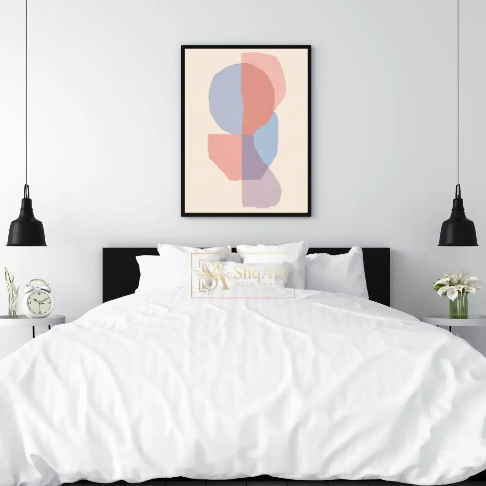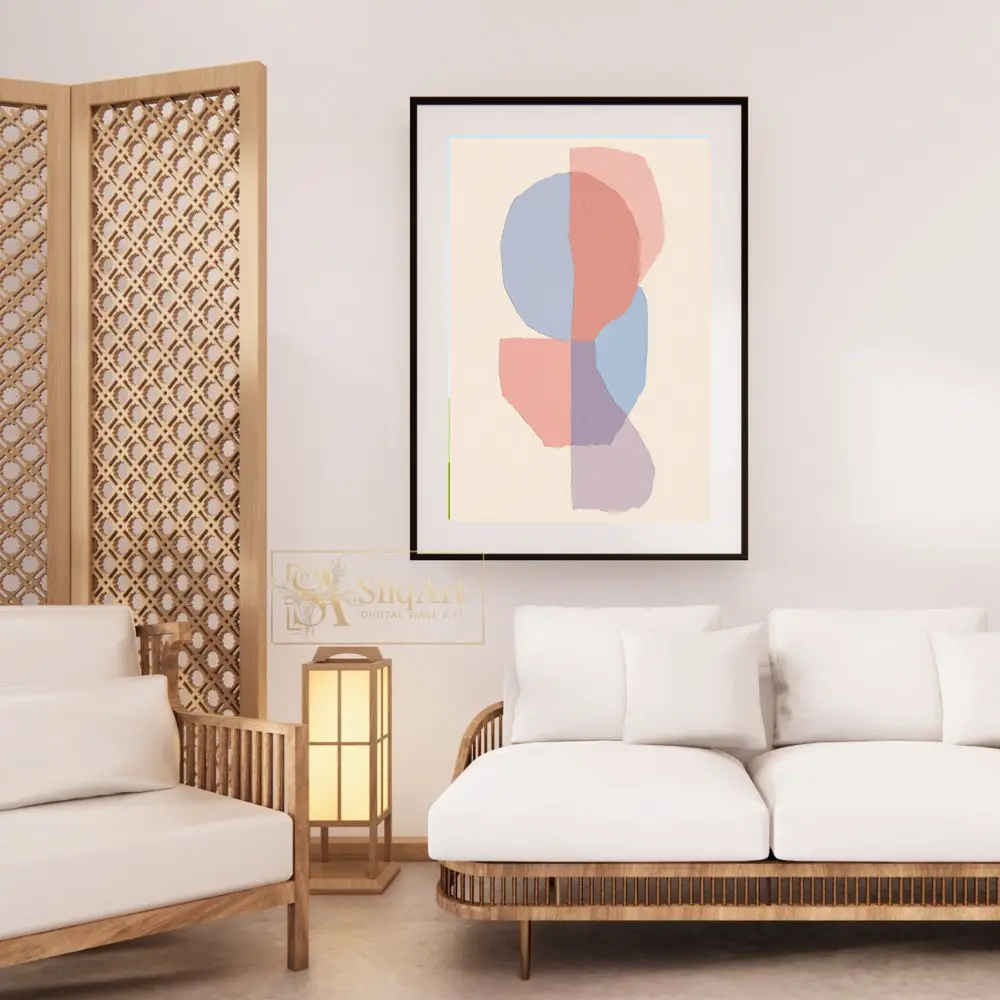 Elevate your interior design with this captivating minimalist abstract art piece. Featuring a collection of organic, textured shapes in a soothing pastel palette, this artwork offers a balanced and serene composition.
