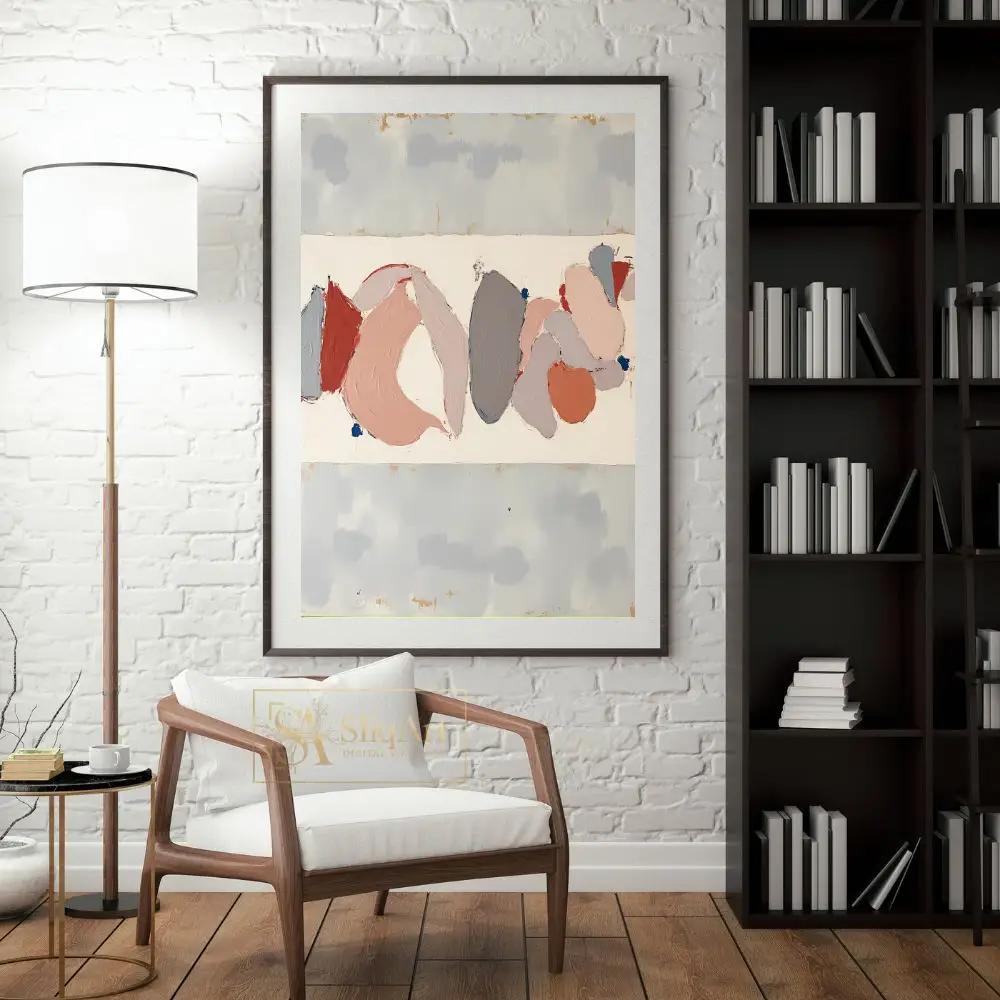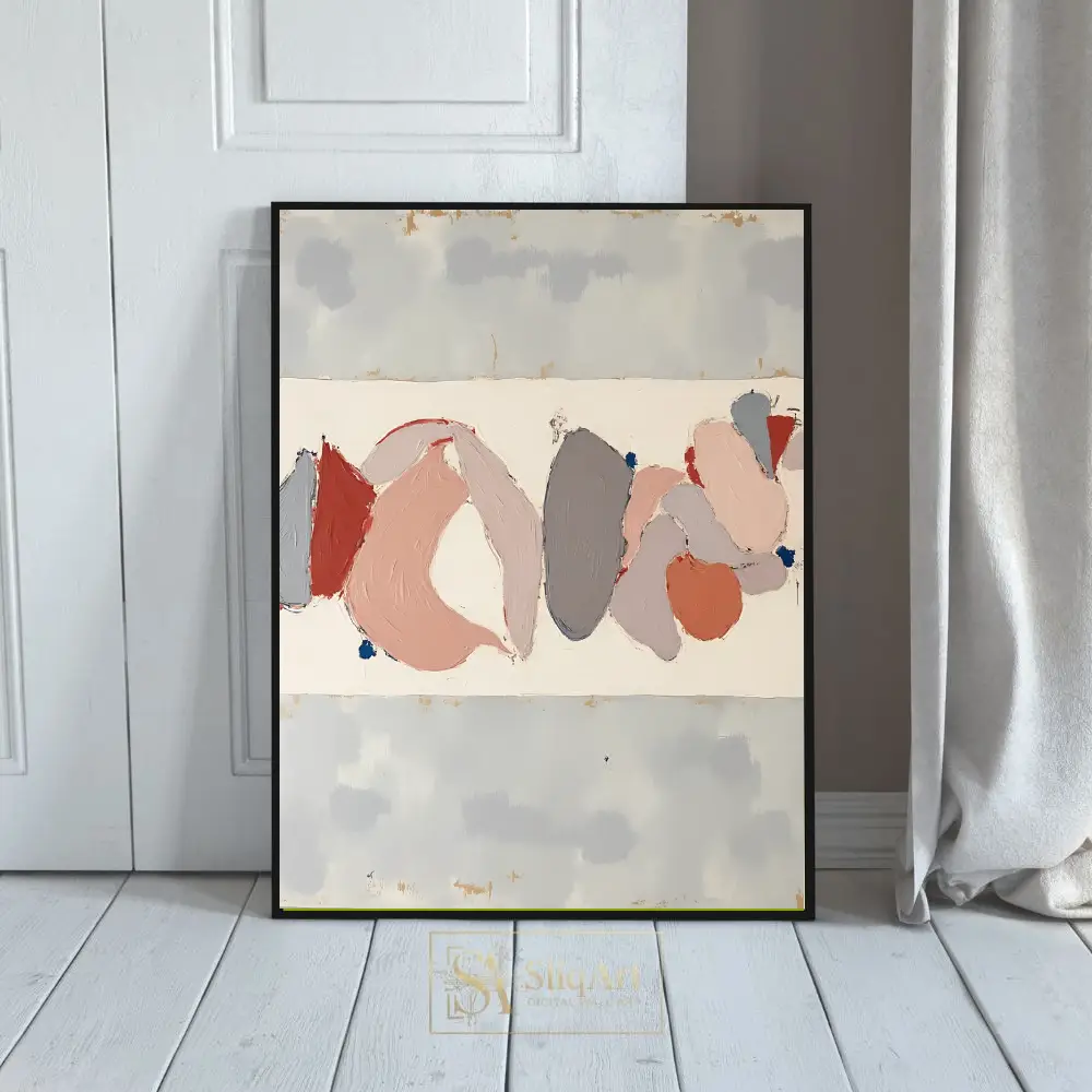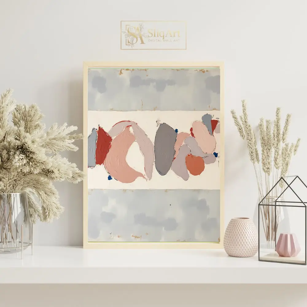A contemporary abstract piece featuring textured organic shapes in a sophisticated palette of blush, grey, and terracotta on a neutral background.
