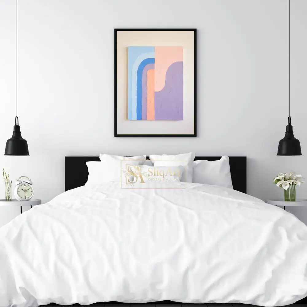 The interplay of sky blue, deep lavender, and soft peach creates a visual rhythm that is both calming and sophisticated. Hand-crafted textures add depth and character, making this canvas a standout piece for lovers of contemporary minimalism and tactile art.