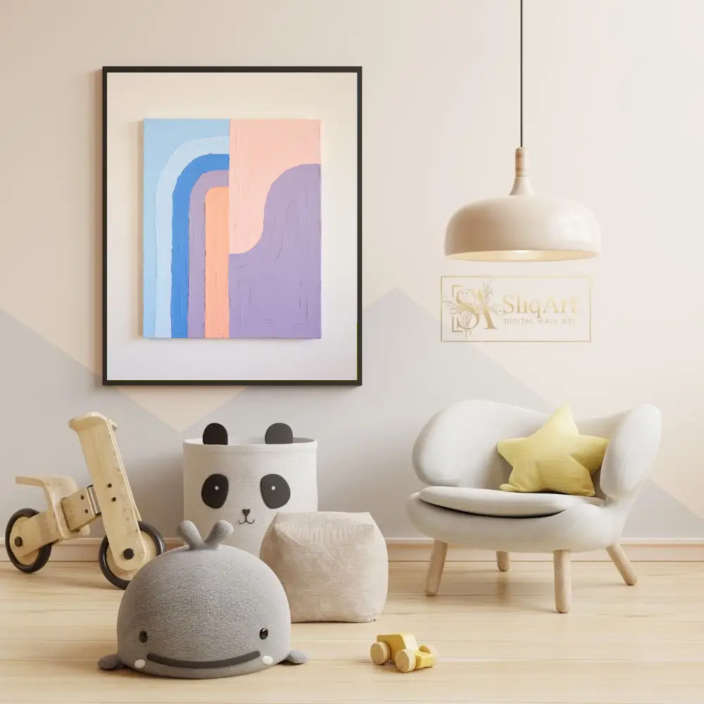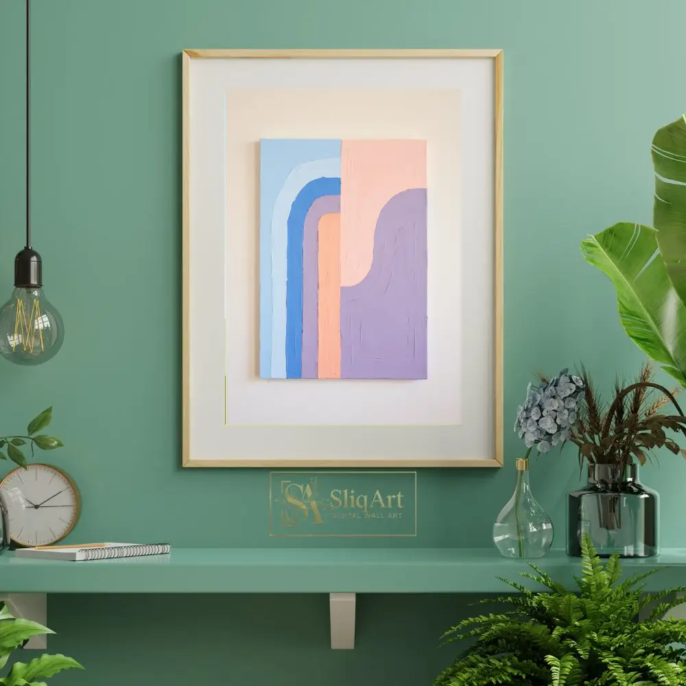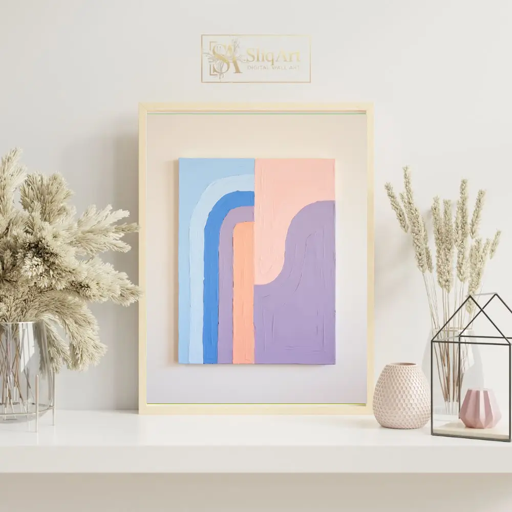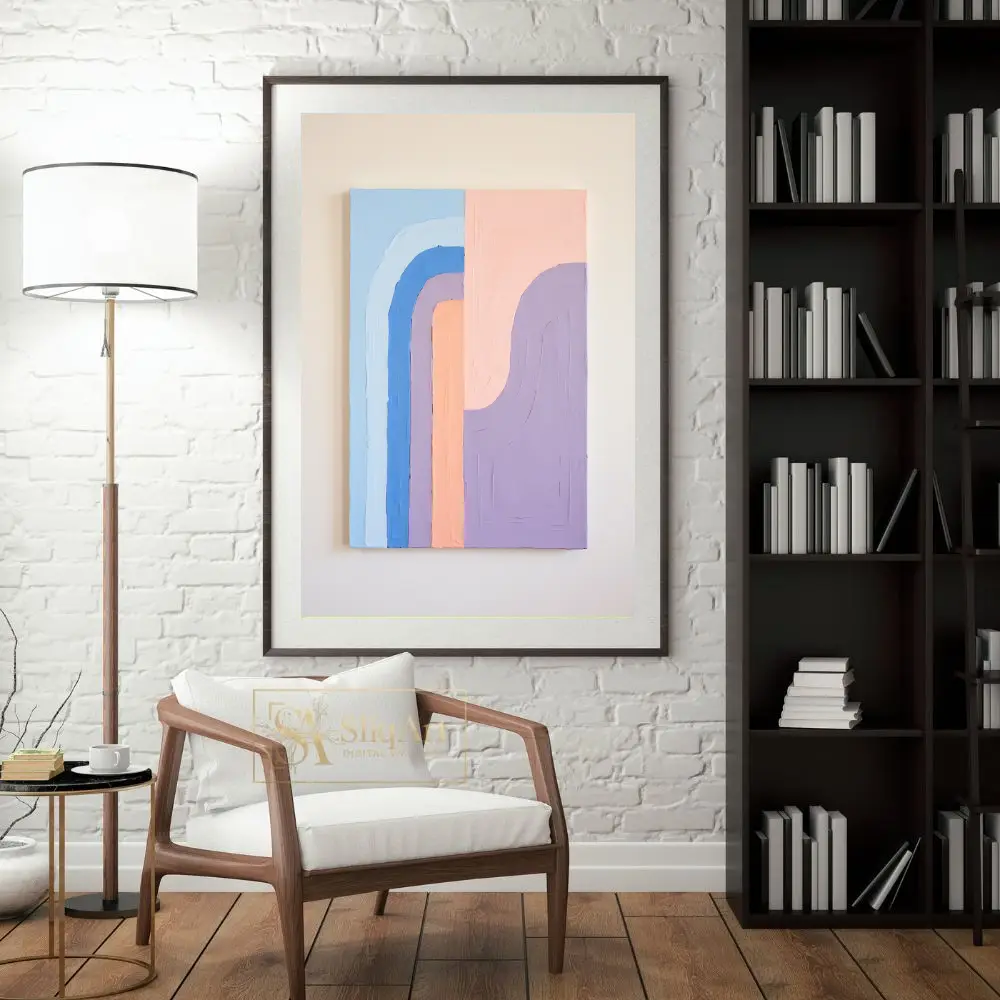 This captivating abstract artwork brings a tactile and serene energy to any space. Characterized by thick, impasto-style brushstrokes, the piece features interlocking geometric shapes and elegant curves in a harmonious pastel palette.