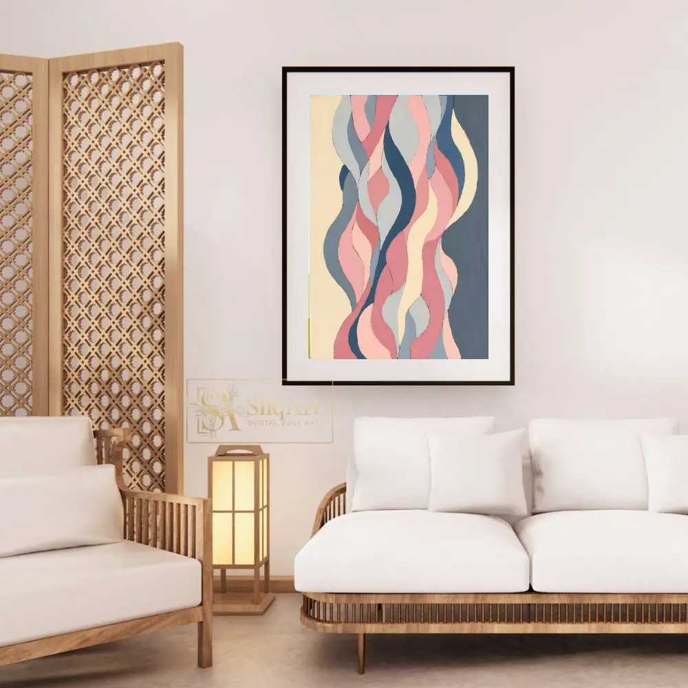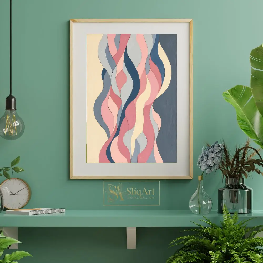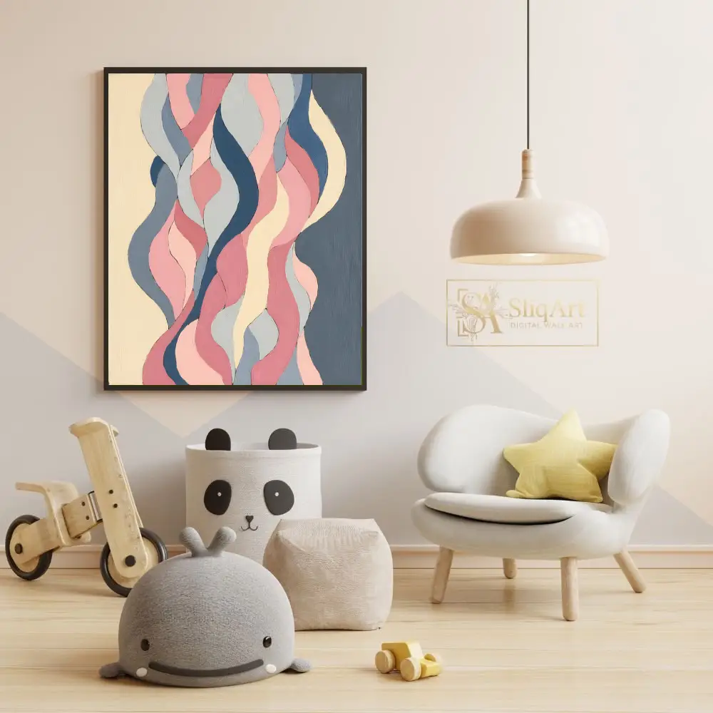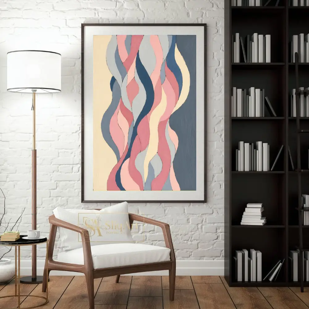 This captivating abstract art piece features organic, wavy lines that flow vertically across the canvas, reminiscent of flowing ribbons or gentle waves. The color palette is a sophisticated blend of dusty rose, soft pink, deep navy, and subtle greys, all set against a warm cream background.