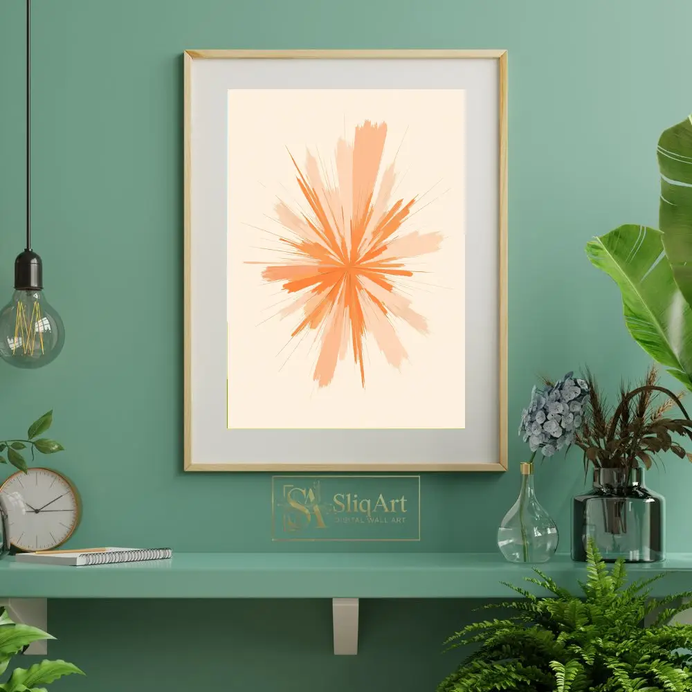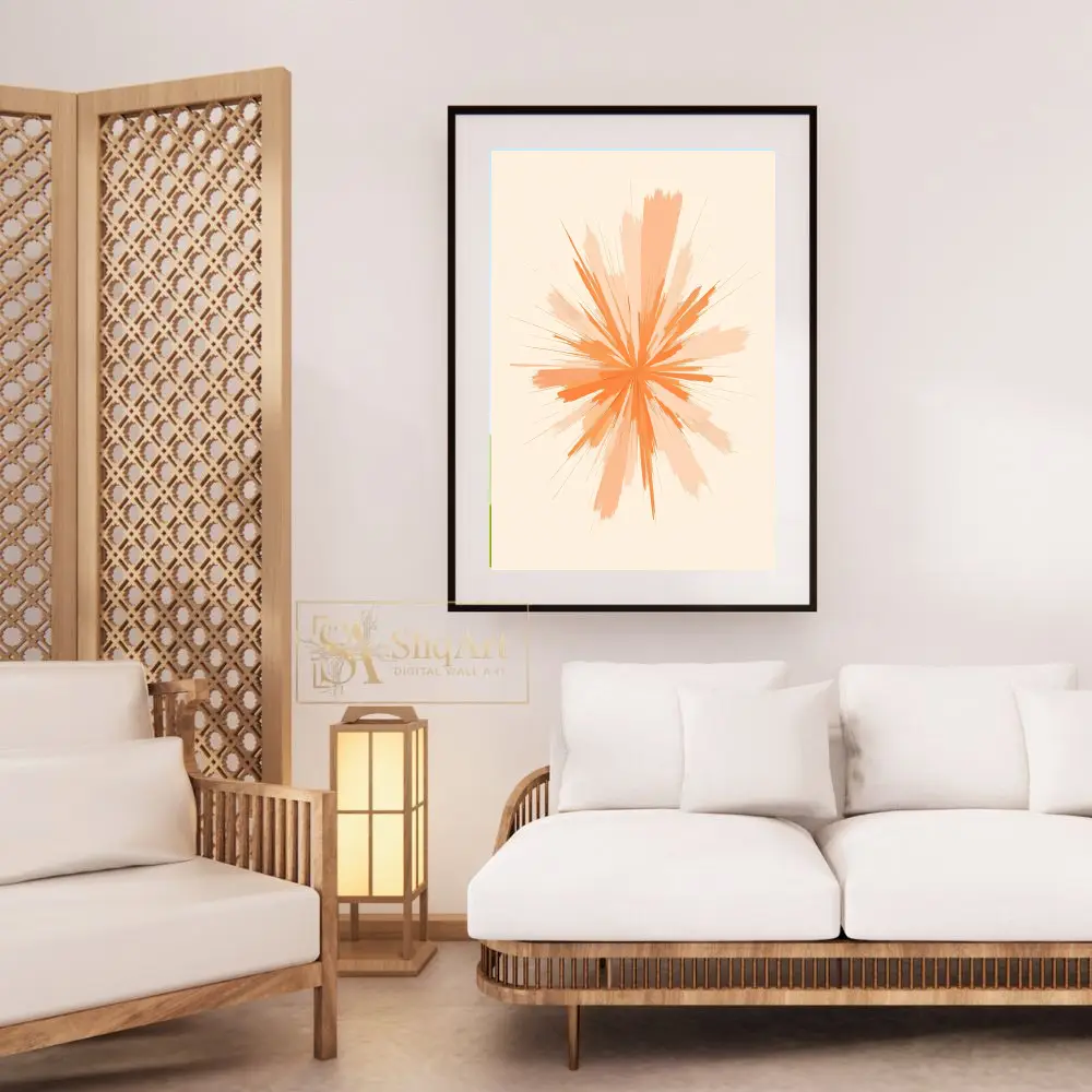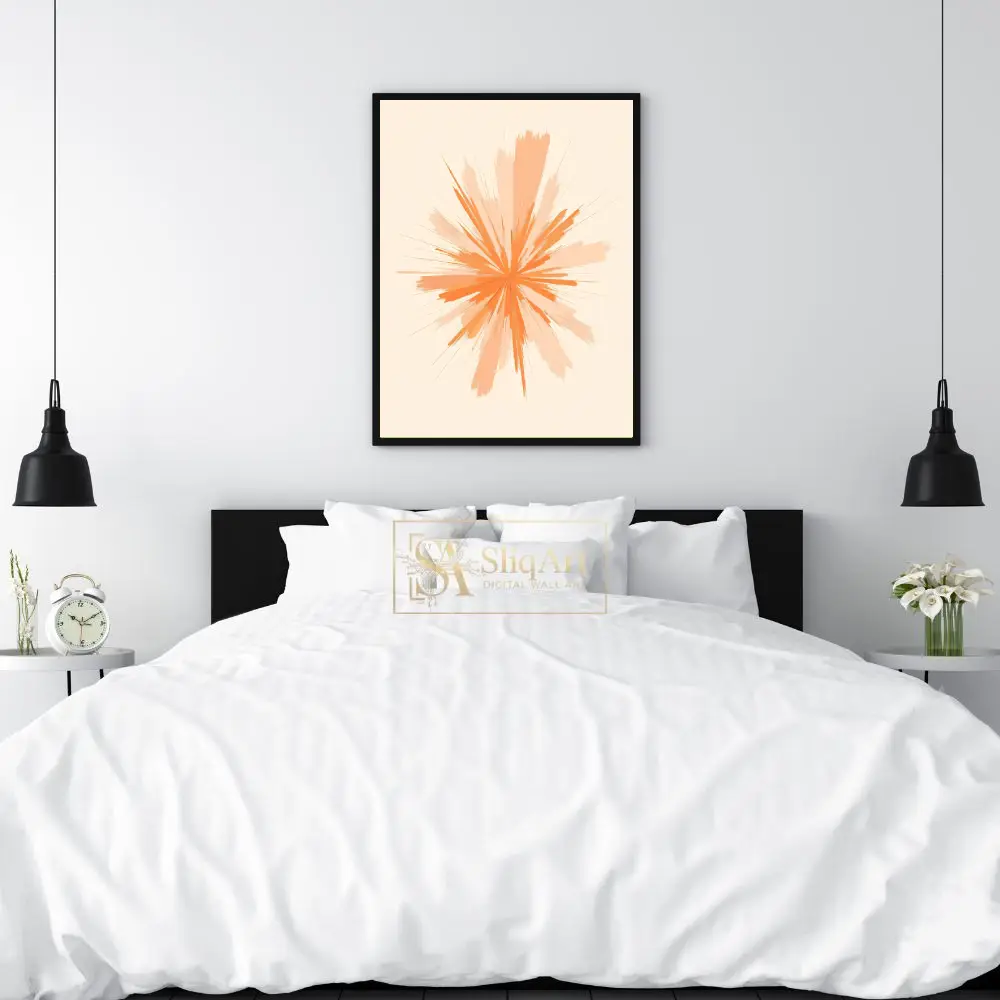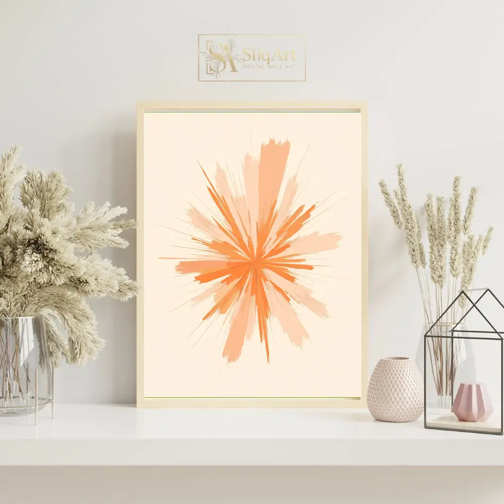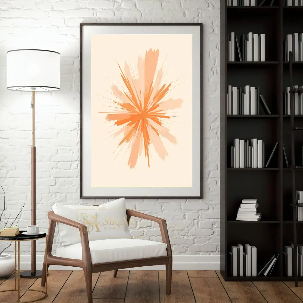Infuse your home with a sense of vibrant energy and modern sophistication. This captivating abstract piece features a dynamic starburst design, where energetic strokes of orange and soft peach radiate outward from a central core.