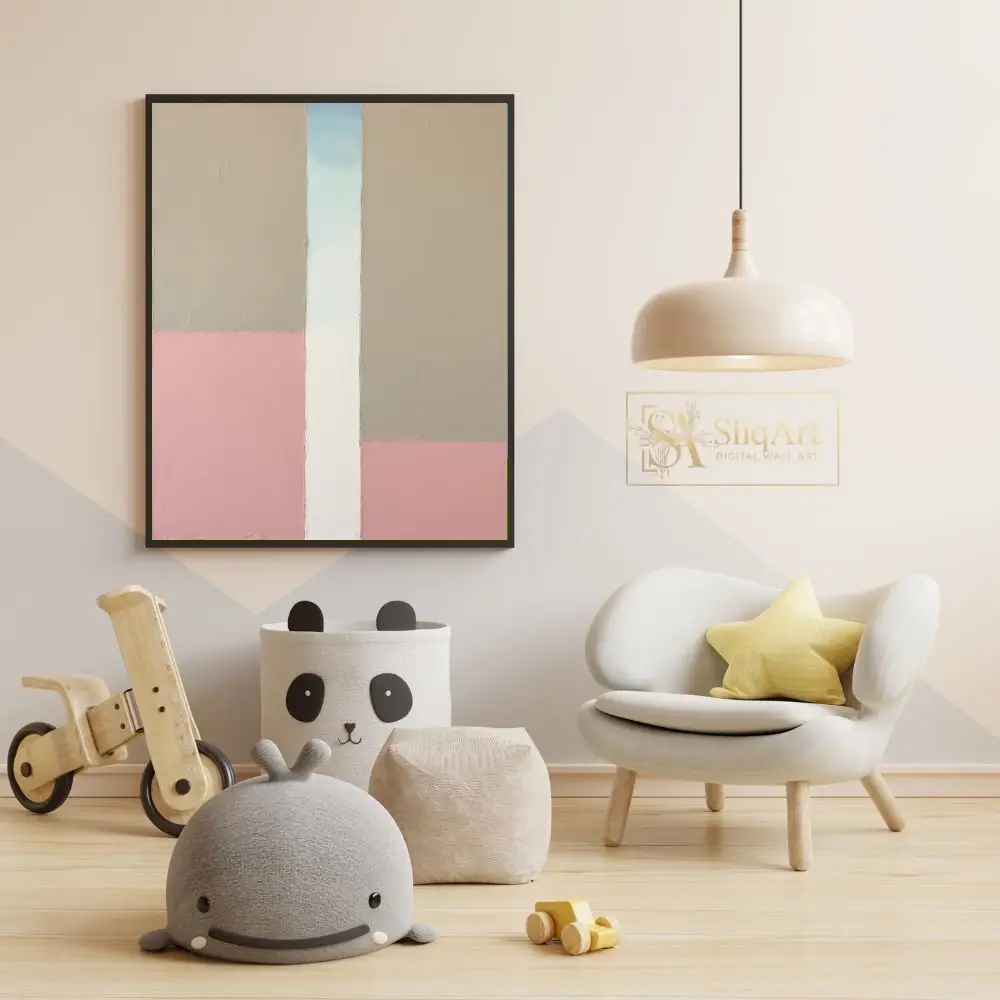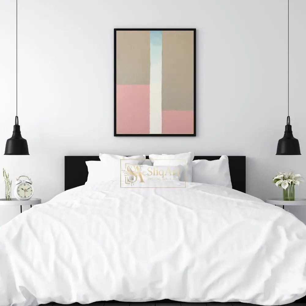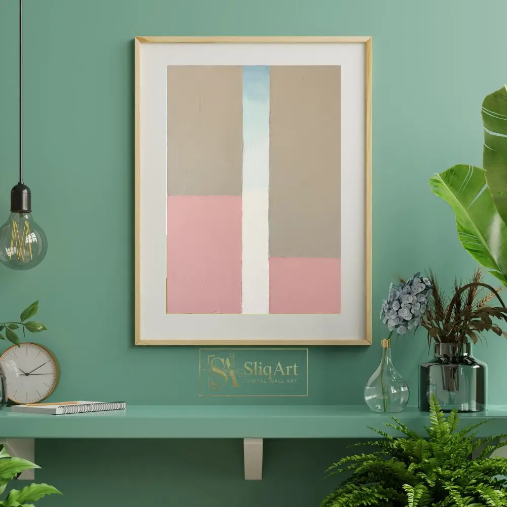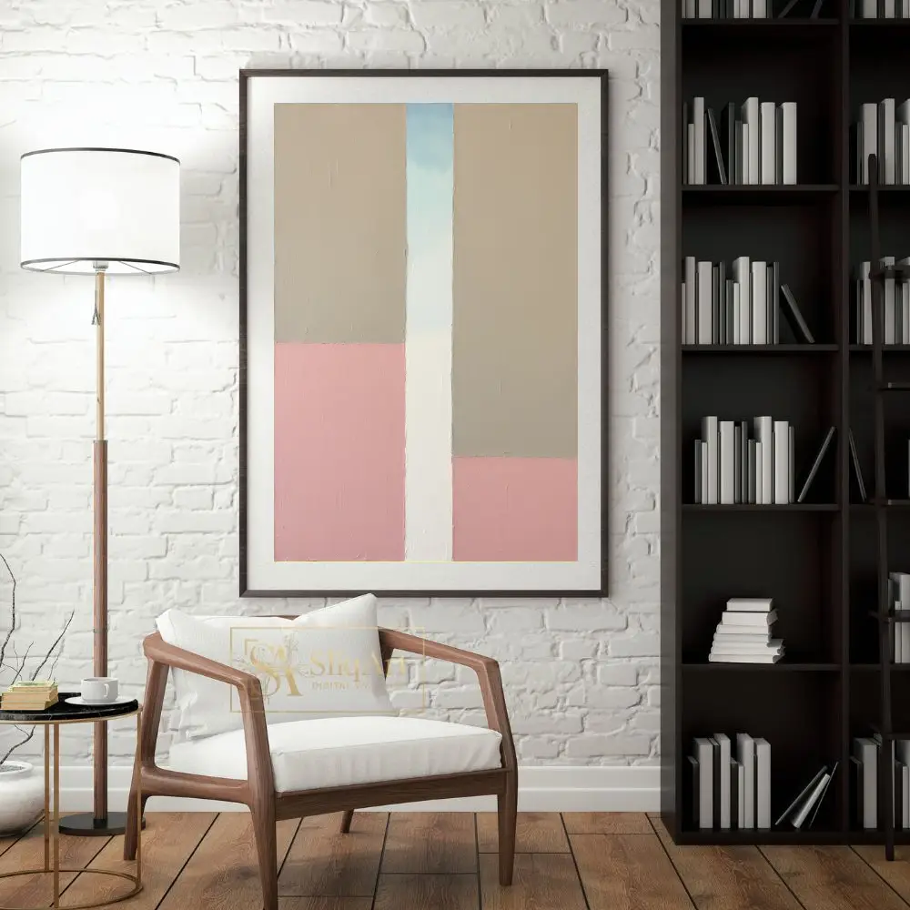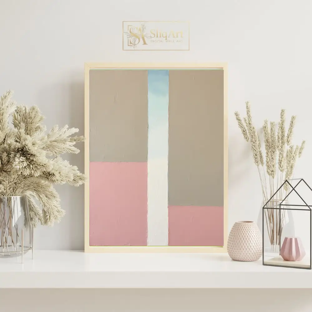 Elevate your interior with this sophisticated minimalist abstract painting. Featuring a structured yet organic composition of large geometric blocks, this piece blends soft dusty pink tones with earthy beige and crisp white.