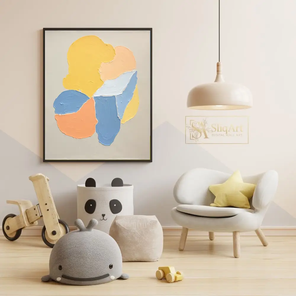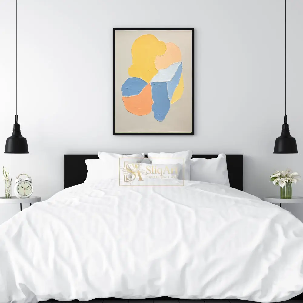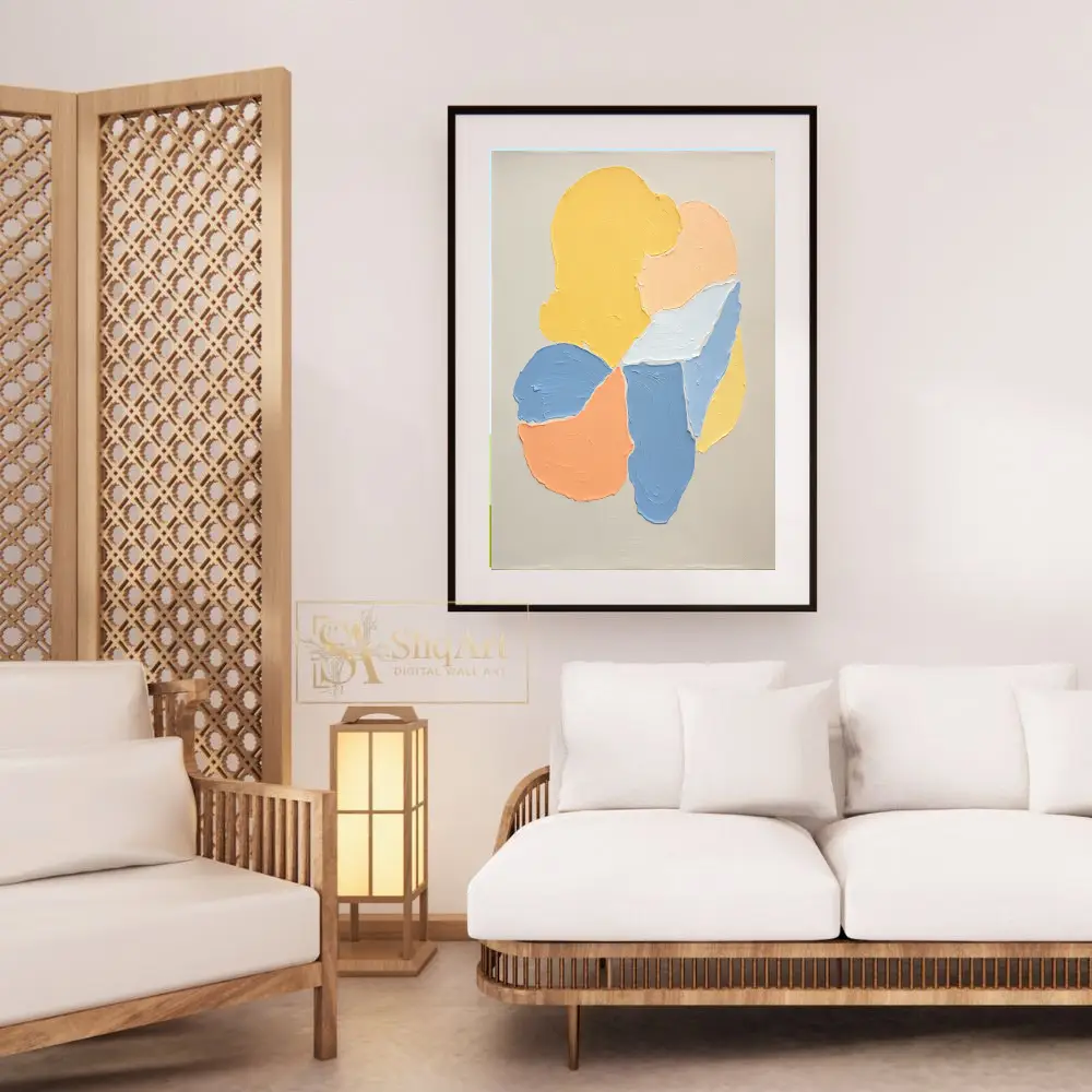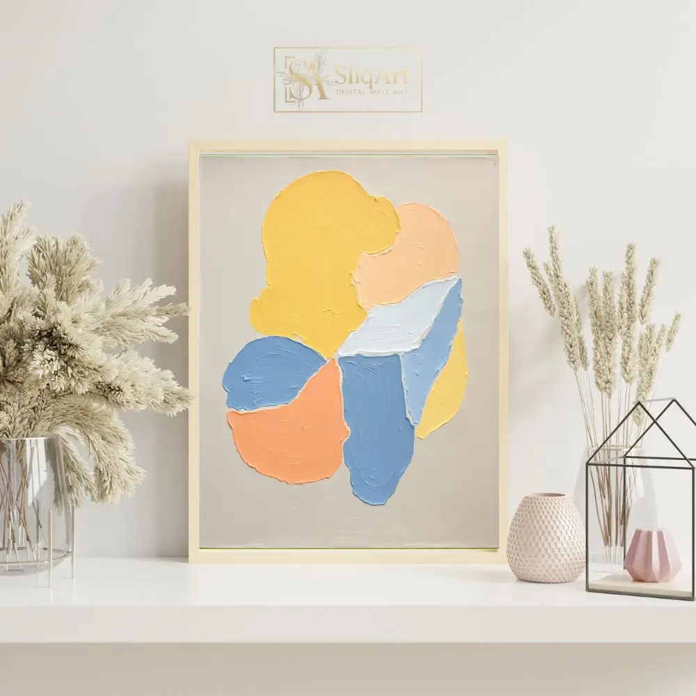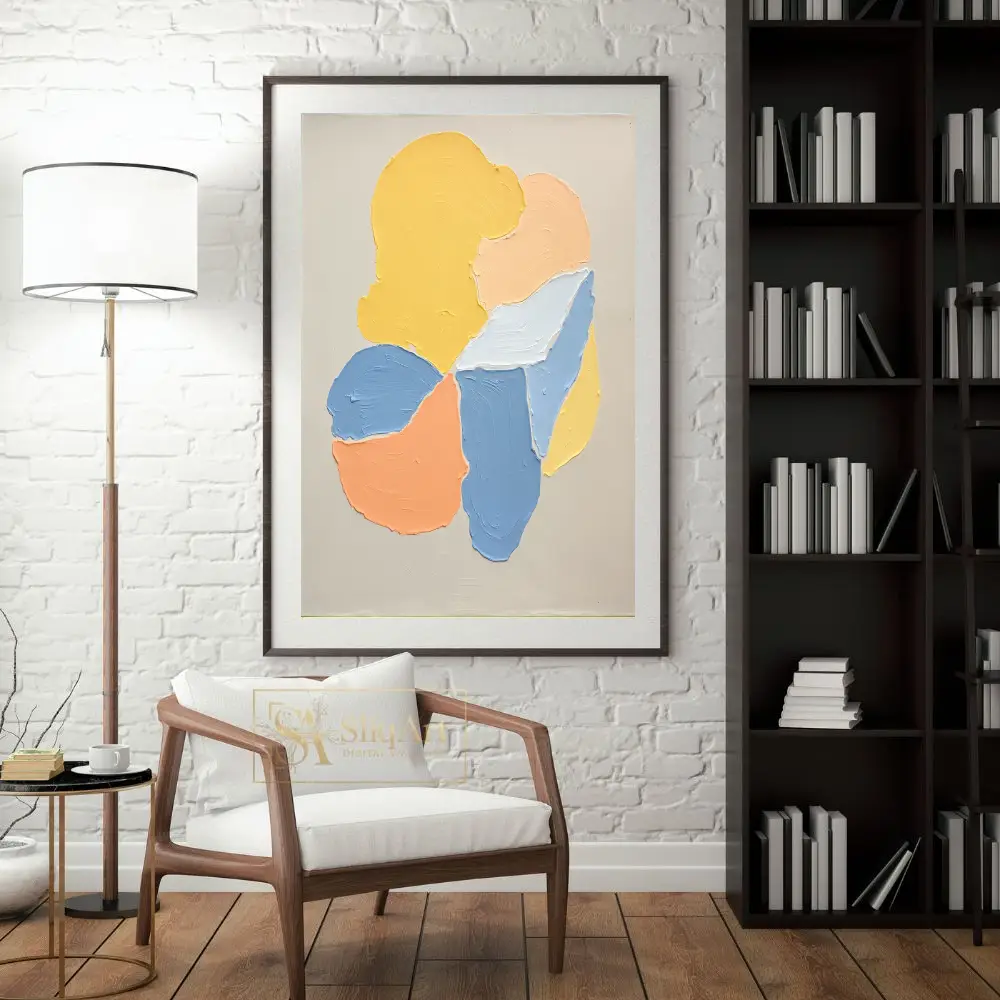 Transform your living space with this sophisticated minimalist abstract painting, characterized by its heavy impasto texture and serene color palette. The artwork features interlocking organic shapes in soft yellow, calming sky blue, and warm peach, all rendered with thick, tactile brushstrokes that catch the light and add depth.