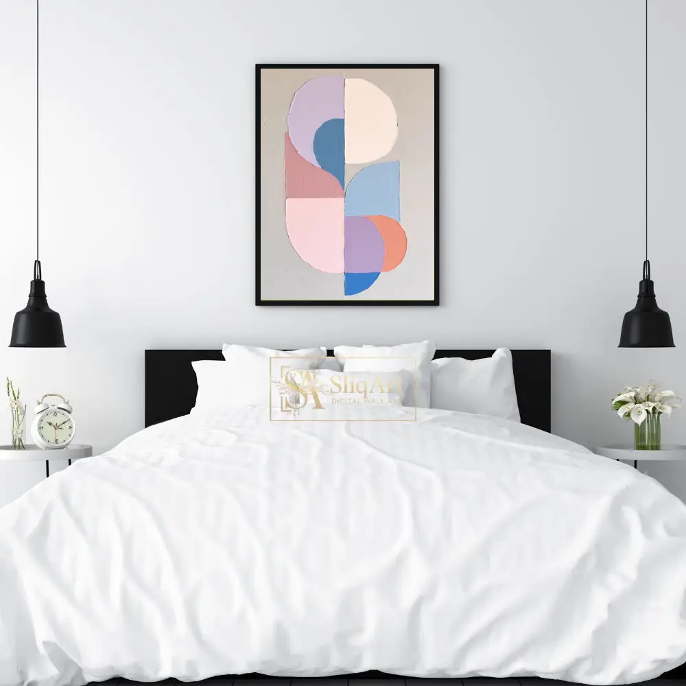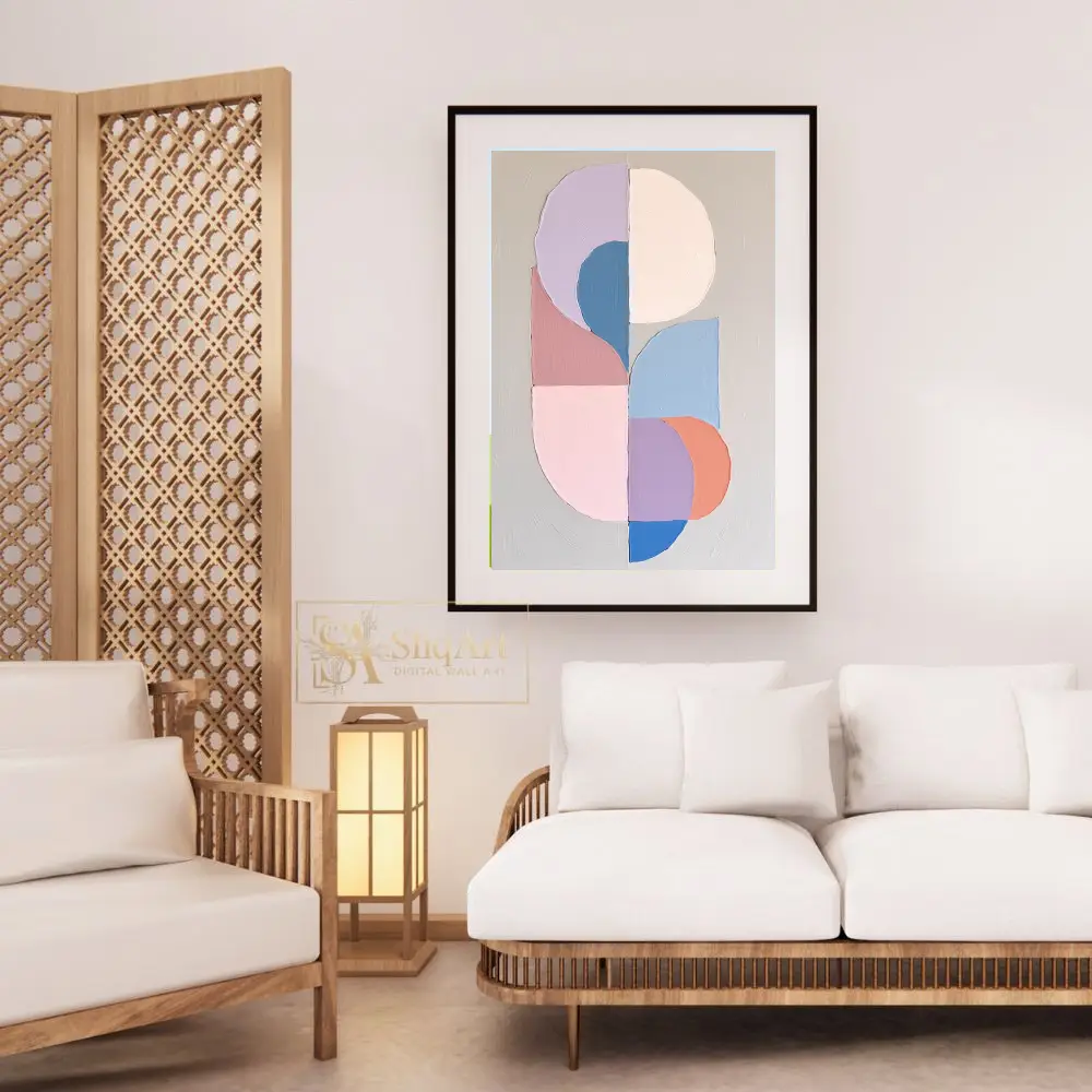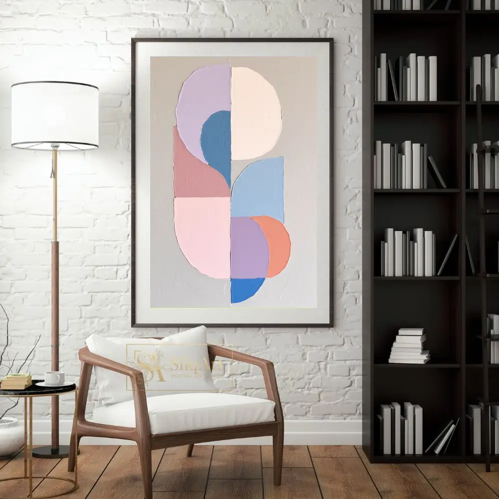 Elevate your interior design with this sophisticated piece of textured abstract art. This composition features a harmonious blend of lilac, peach, soft blues, and terracotta, utilizing interlocking semi-circles to create a sense of balanced movement and modern elegance.