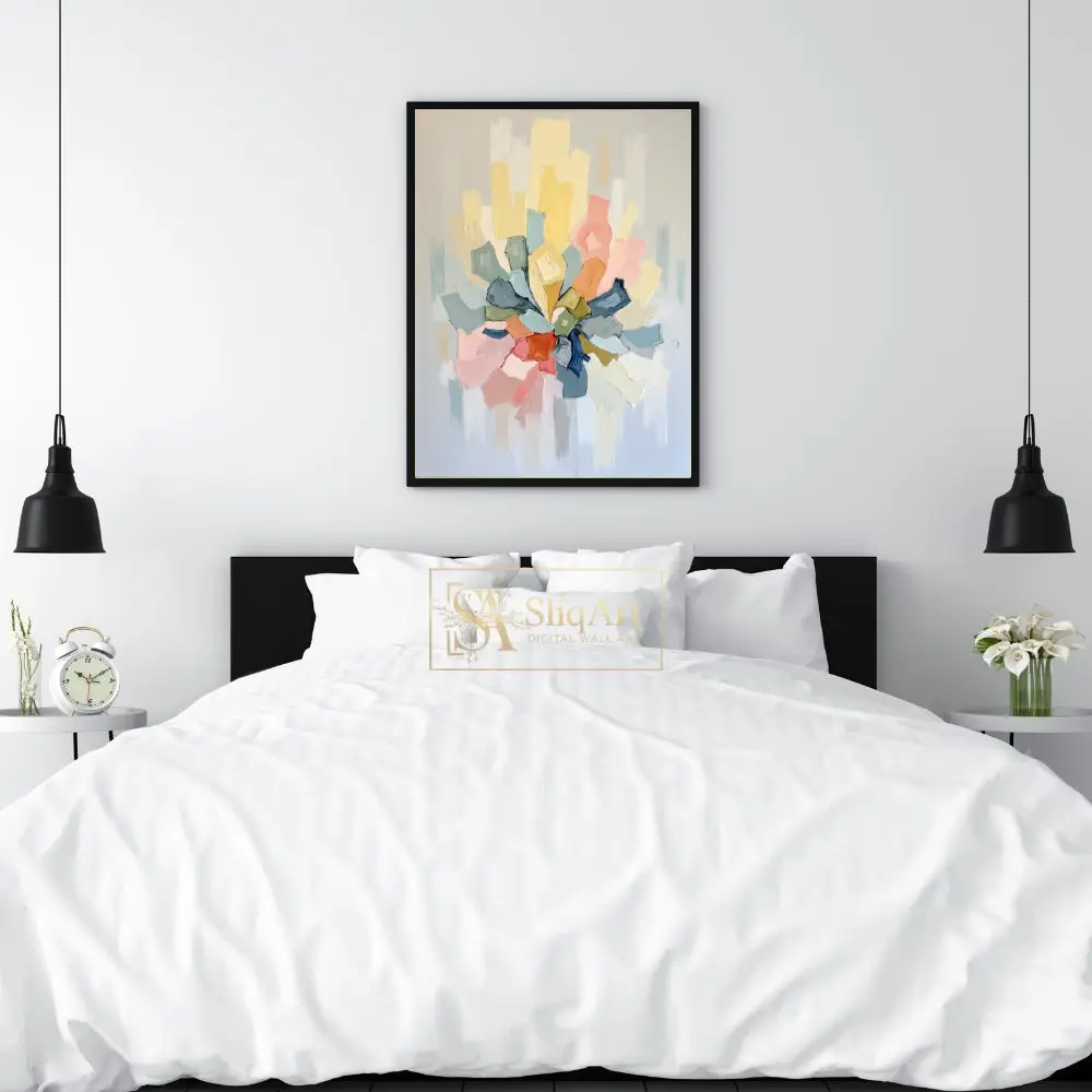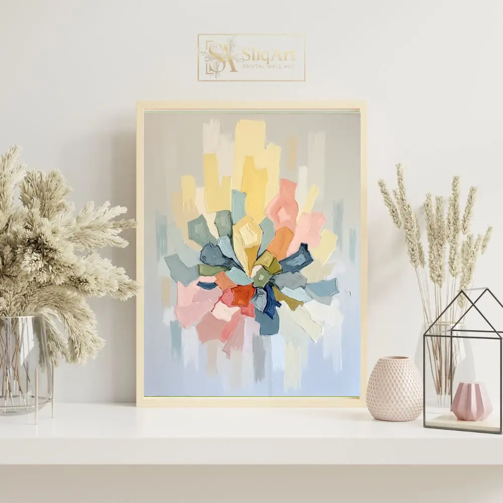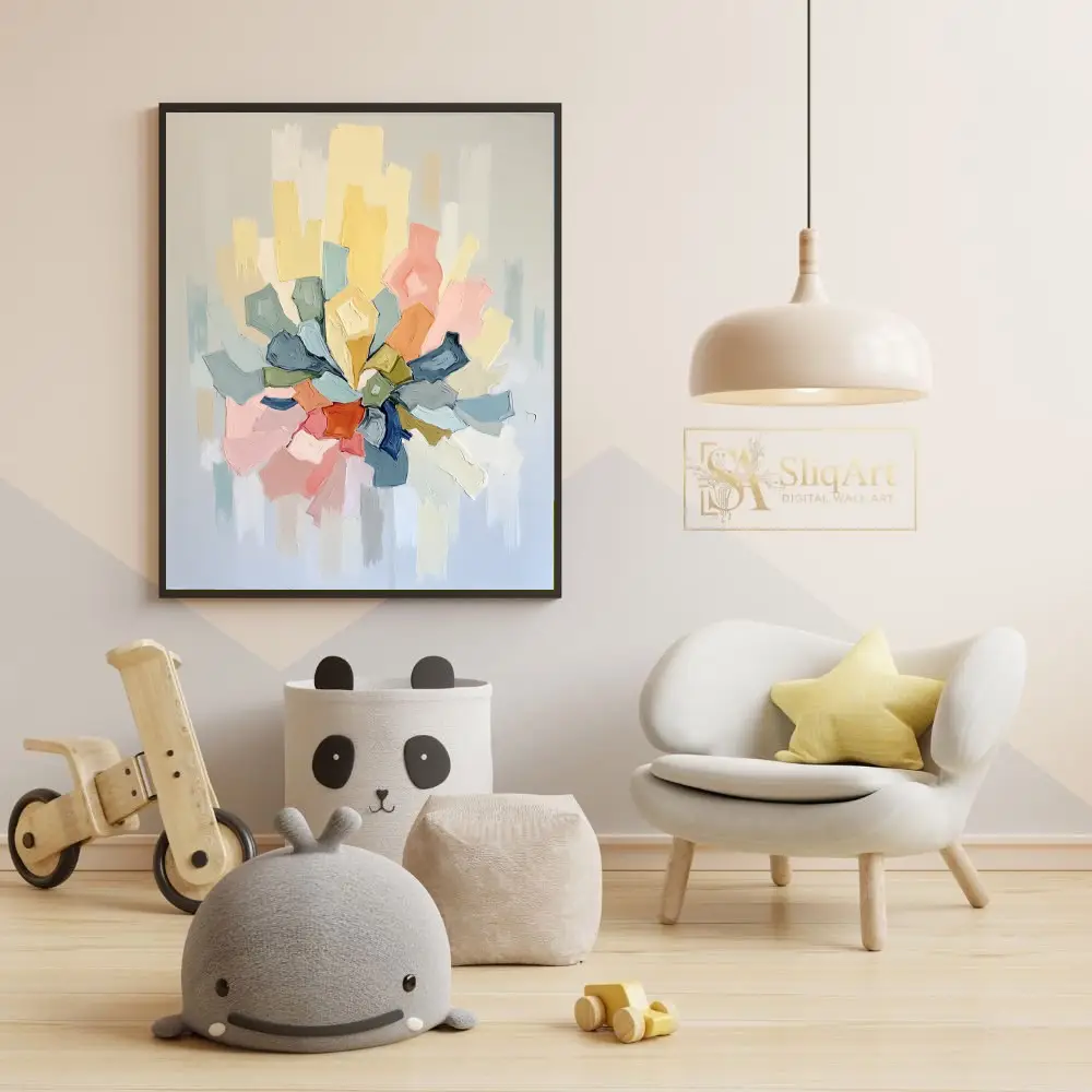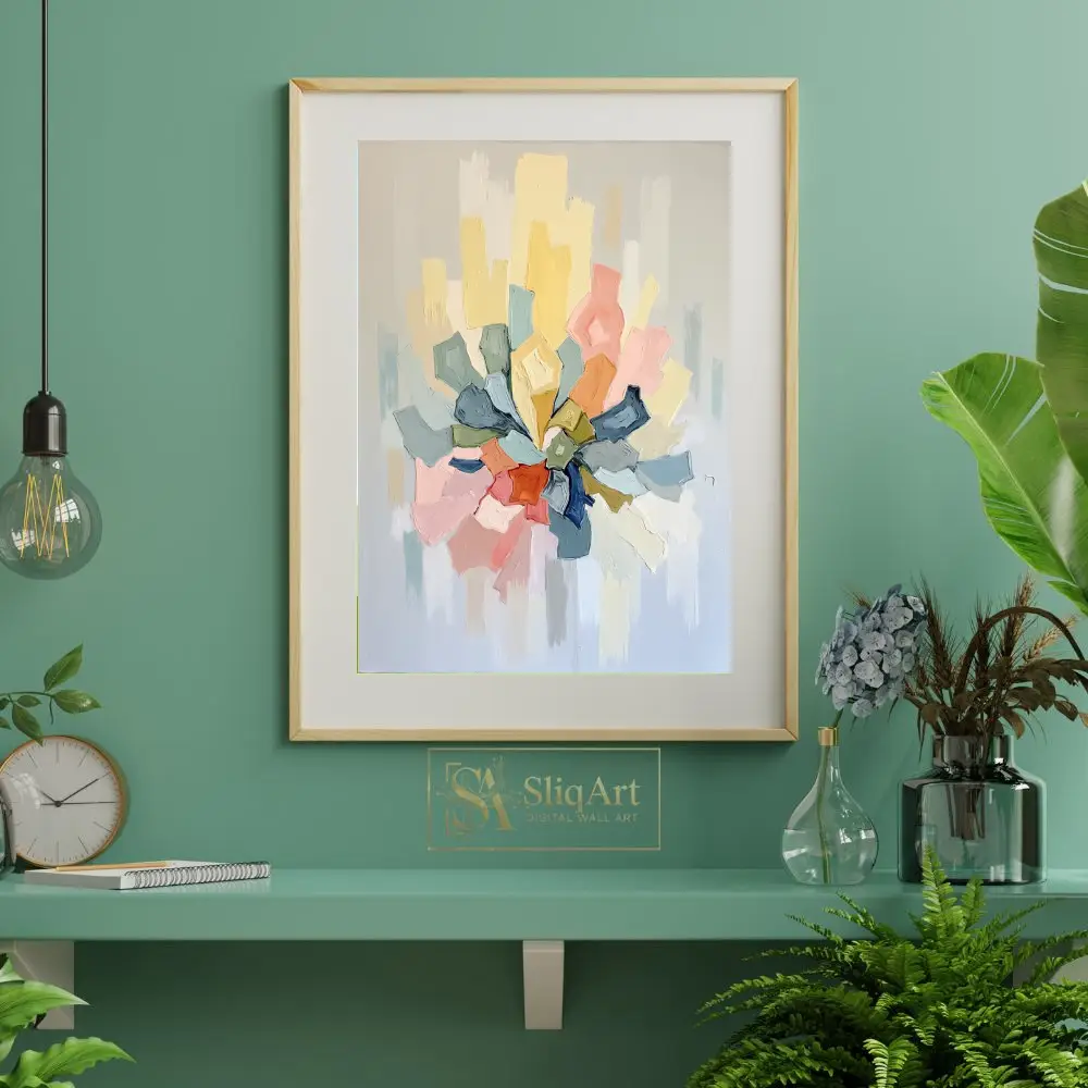A sophisticated palette of buttery yellow, soft rose, and mint green is expertly balanced by grounded accents of navy blue, burnt orange, and olive green, all set against a calming off-white background. This piece captures the energy of a blooming flower through a modern, geometric lens, making it a perfect statement piece for contemporary interiors.