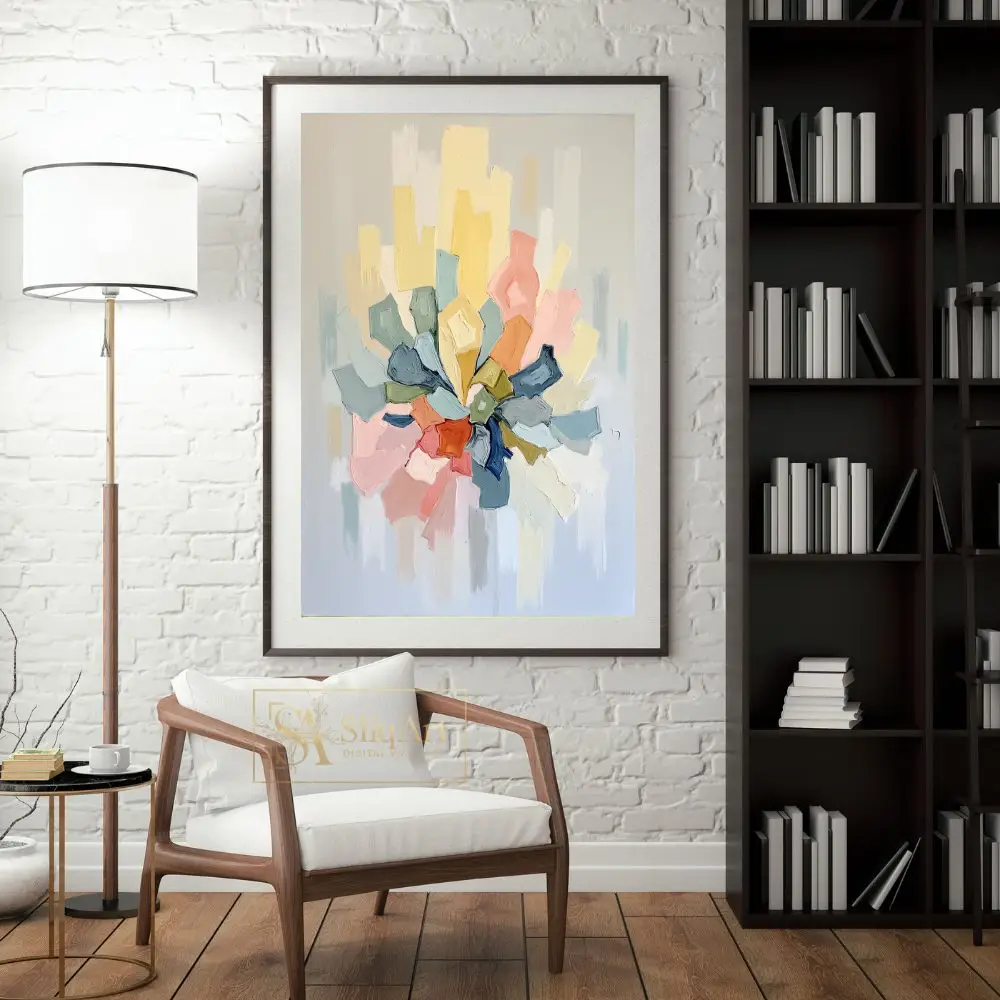 Transform your space with this captivating abstract piece that features a dynamic, floral-like explosion of color. The artwork showcases a heavy impasto texture, with thick, visible palette knife strokes that give the print a tangible sense of depth and movement.