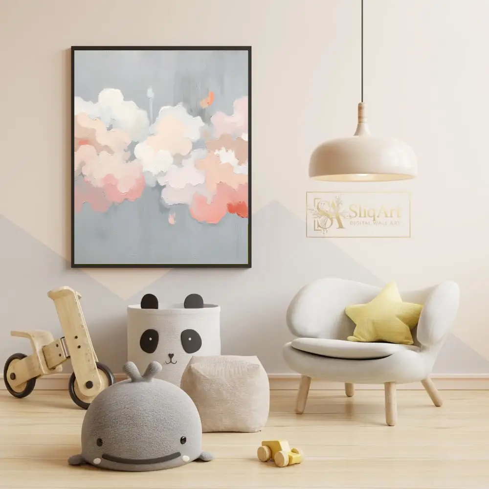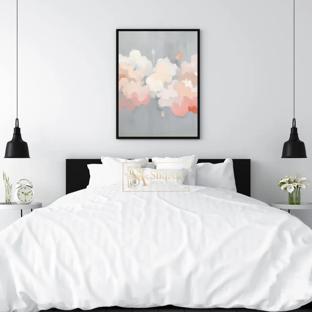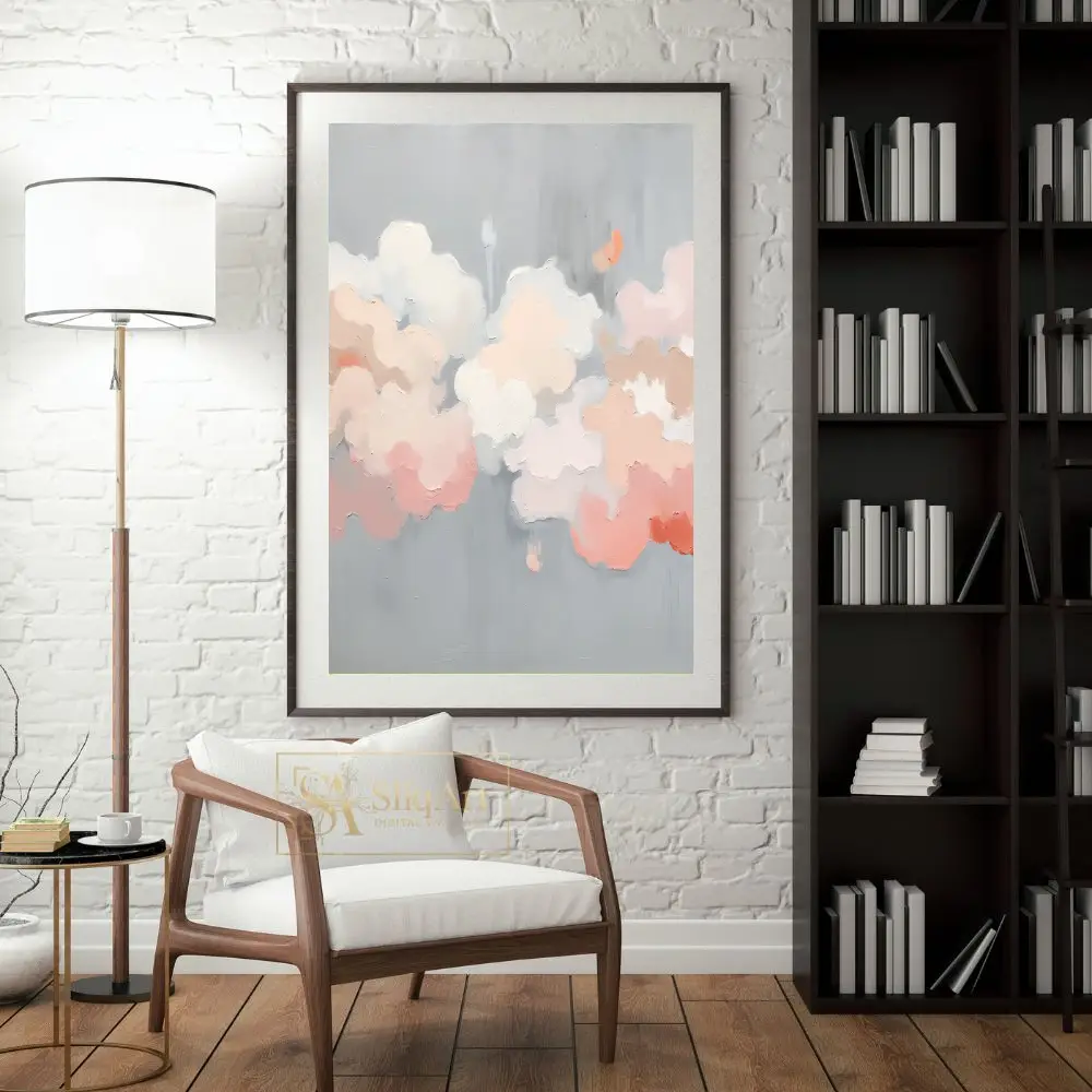 Featuring a sophisticated palette of blush pink, soft peach, and creamy whites set against a serene silver-grey backdrop, this piece utilizes heavy impasto techniques to create a tangible, 3D texture. The soft, billowy forms evoke a sense of tranquility and weightlessness, making it a perfect centerpiece for a modern home seeking artistic depth and a calming atmosphere.