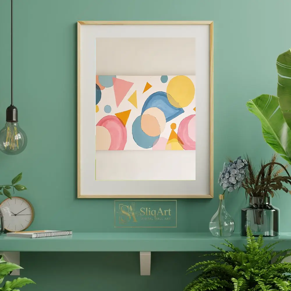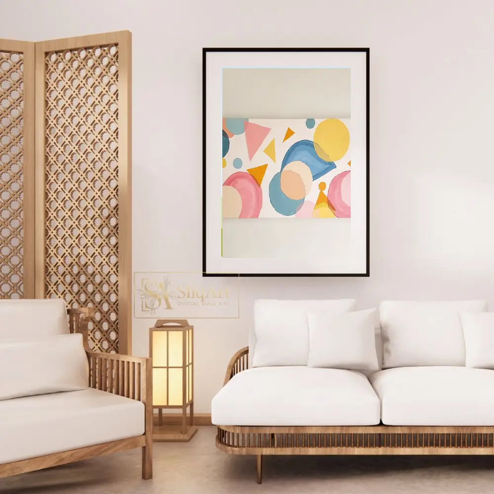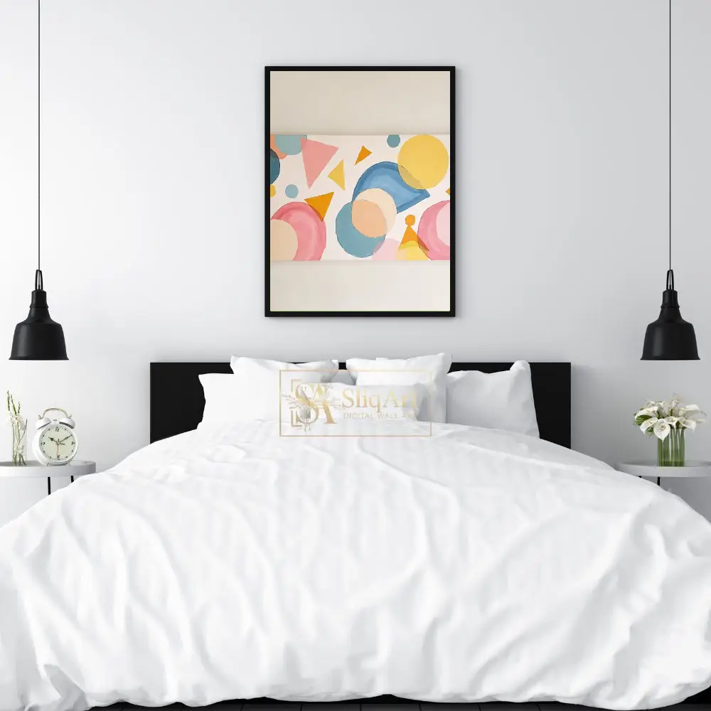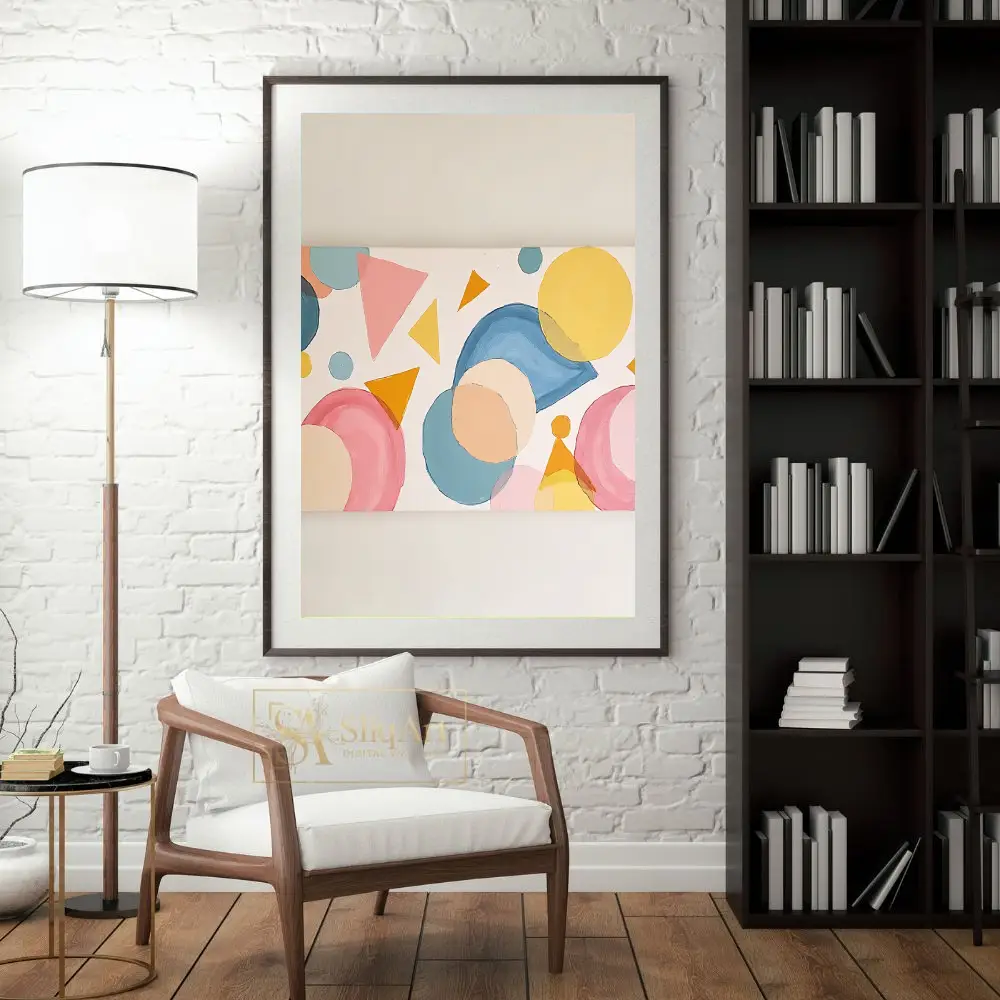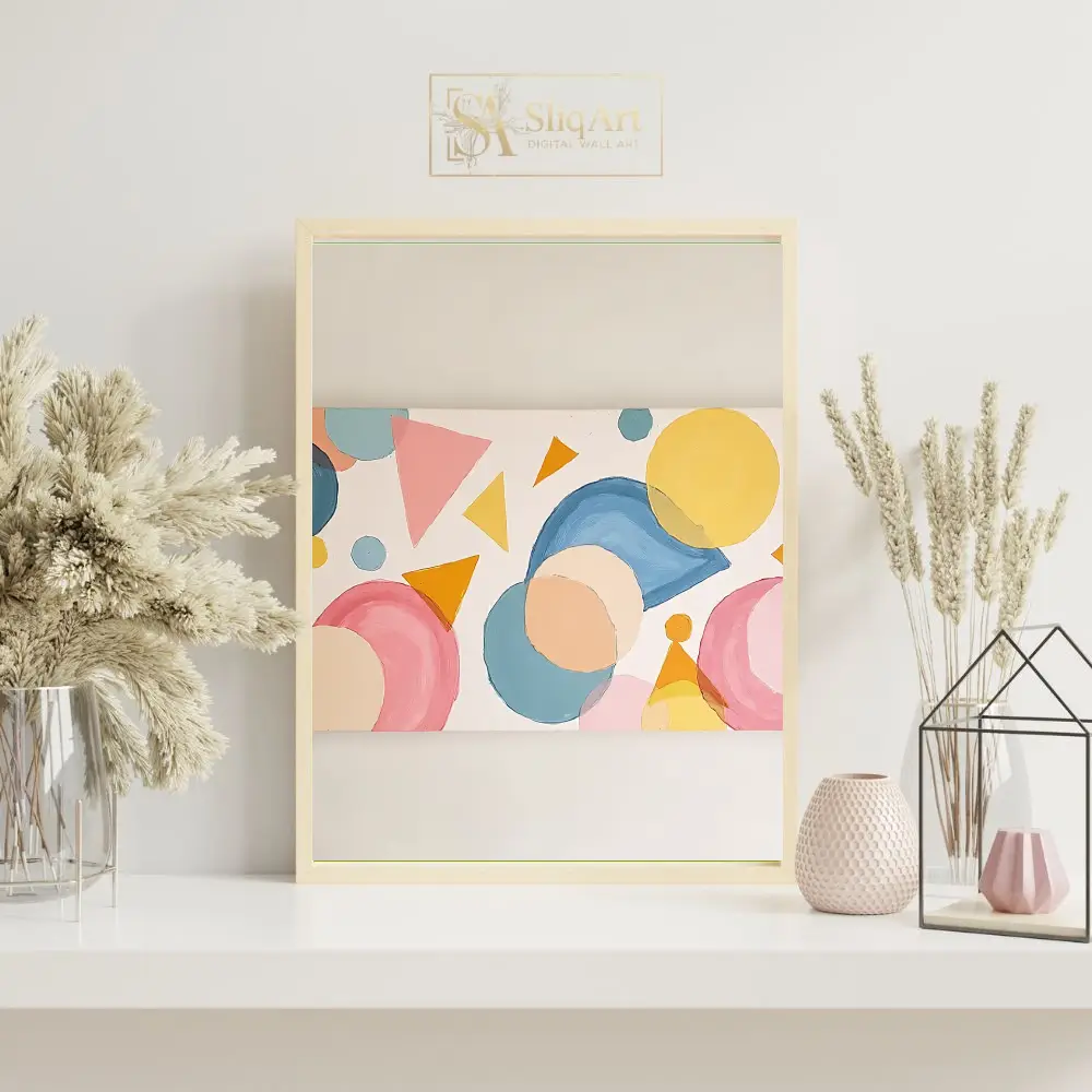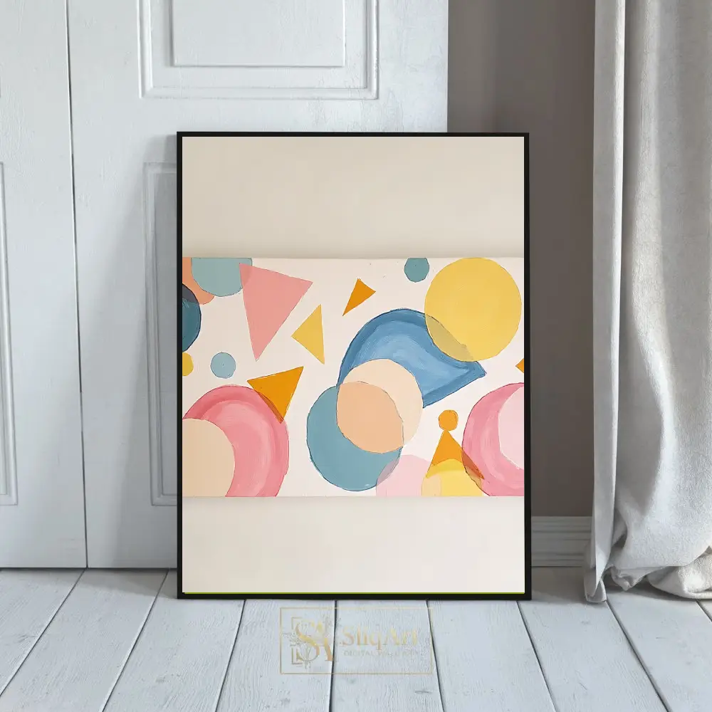 Enhance your interior with this captivating abstract geometric painting. Featuring a rhythmic composition of circles, triangles, and fluid shapes, this piece utilizes a soft palette of pastel pinks, serene blues, and warm yellows.