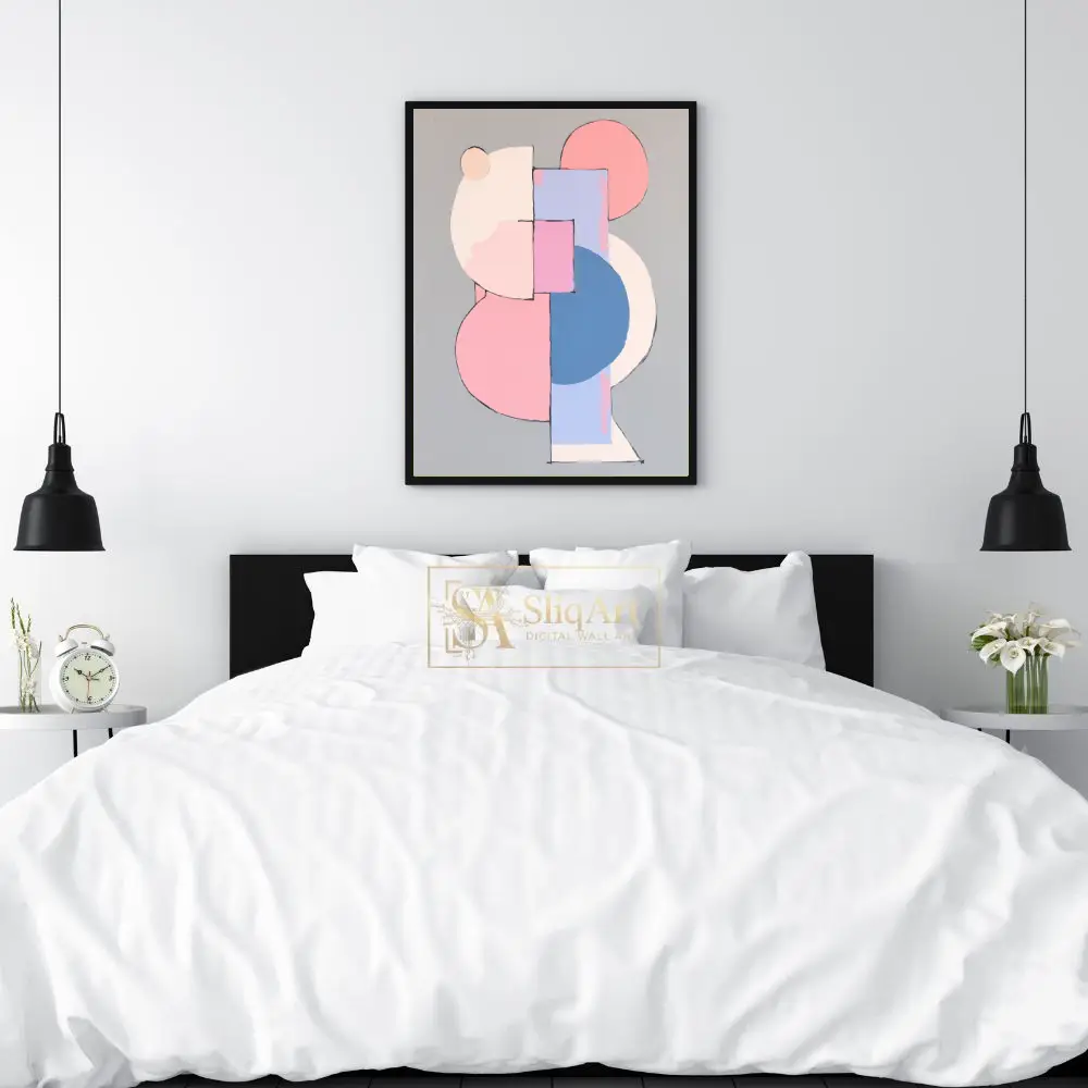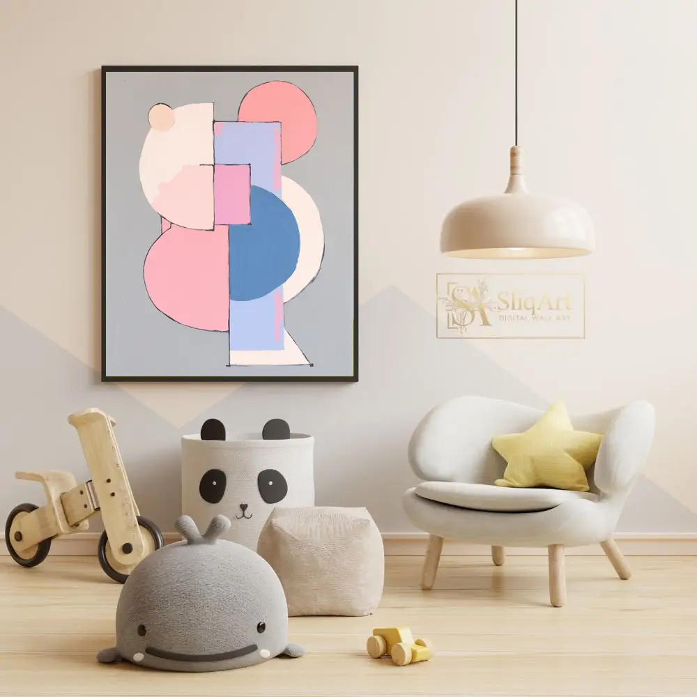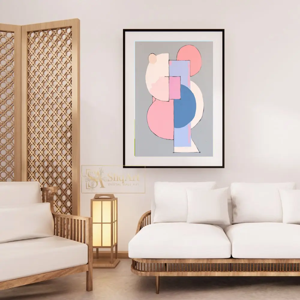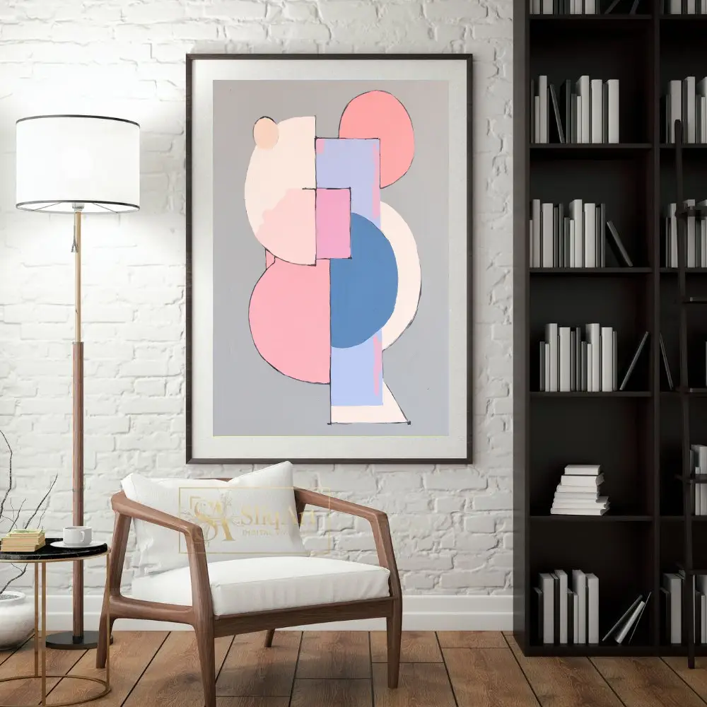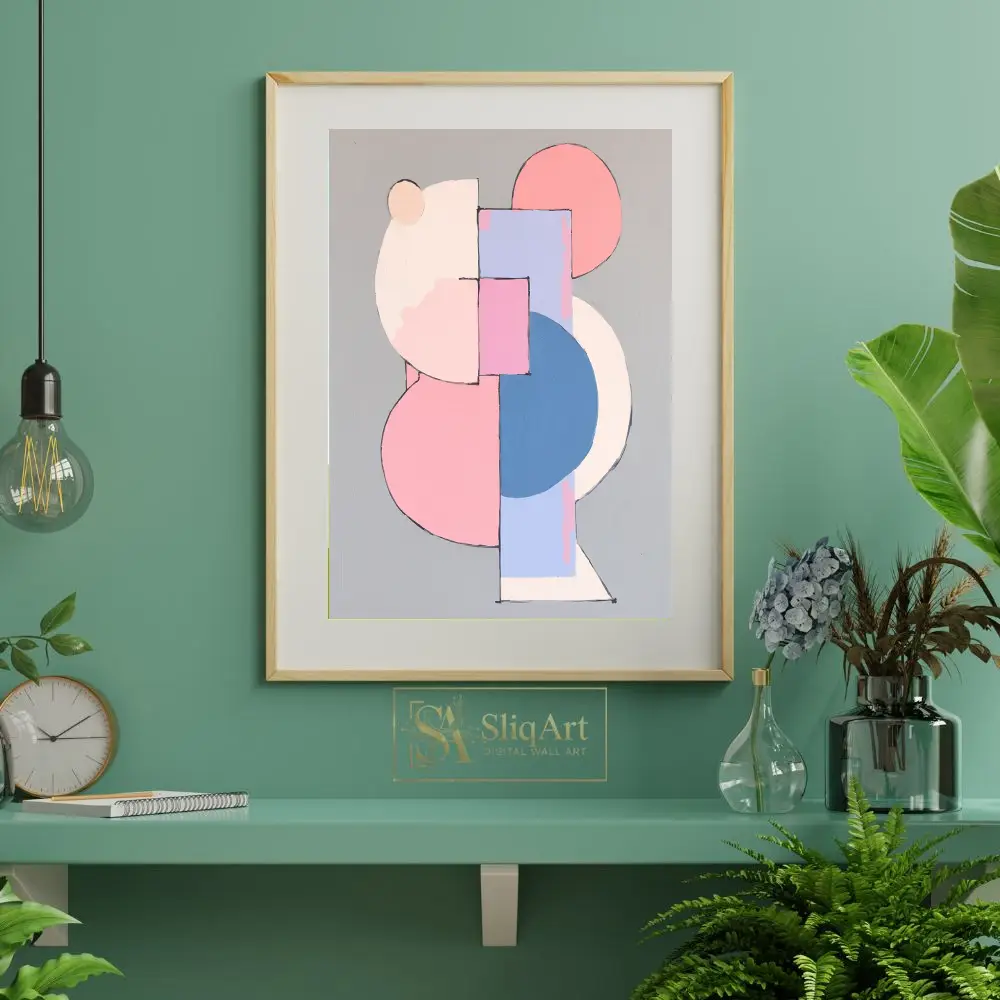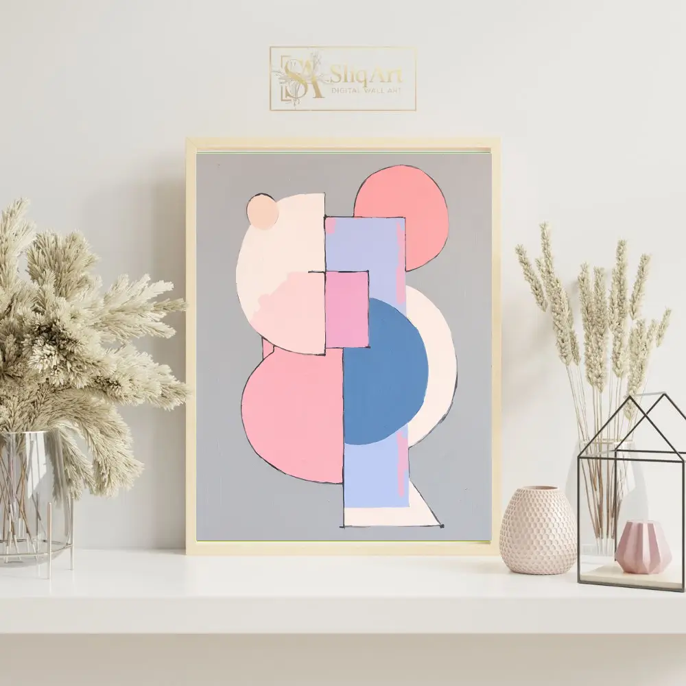 Bring a sense of balance and modern elegance to your home with this stunning geometric abstract. The artwork features a playful yet structured composition of overlapping circles, semicircles, and rectangles in a soothing palette of dusty pink, soft lavender, and cerulean blue.