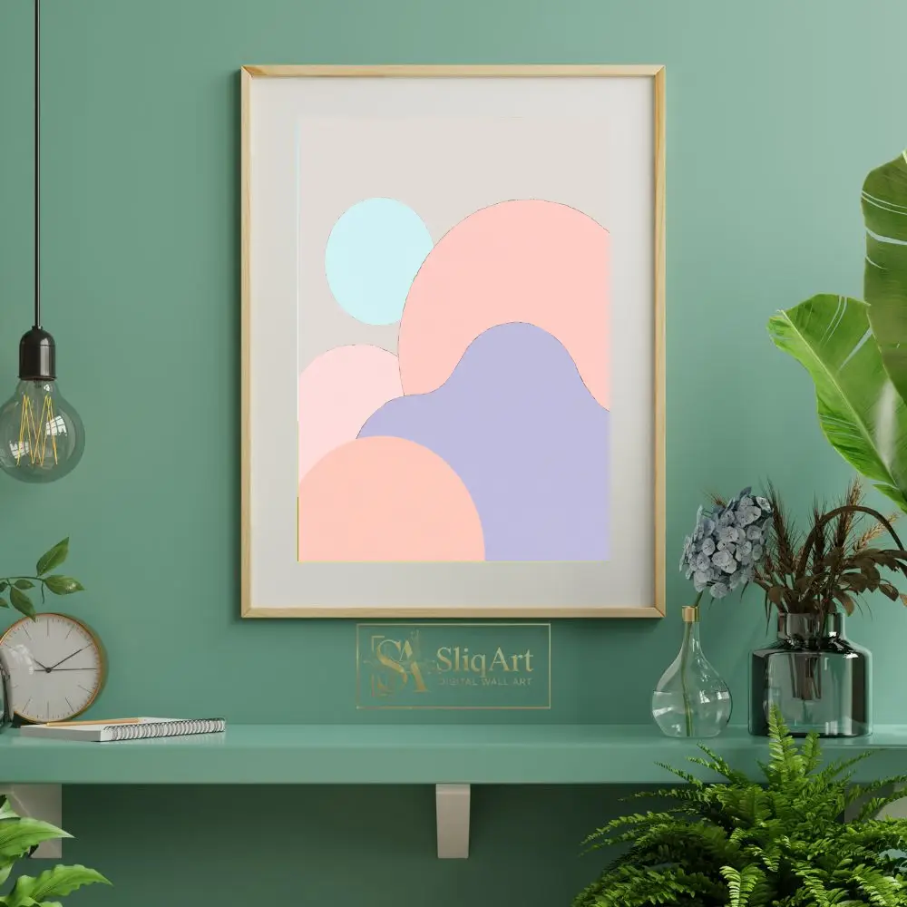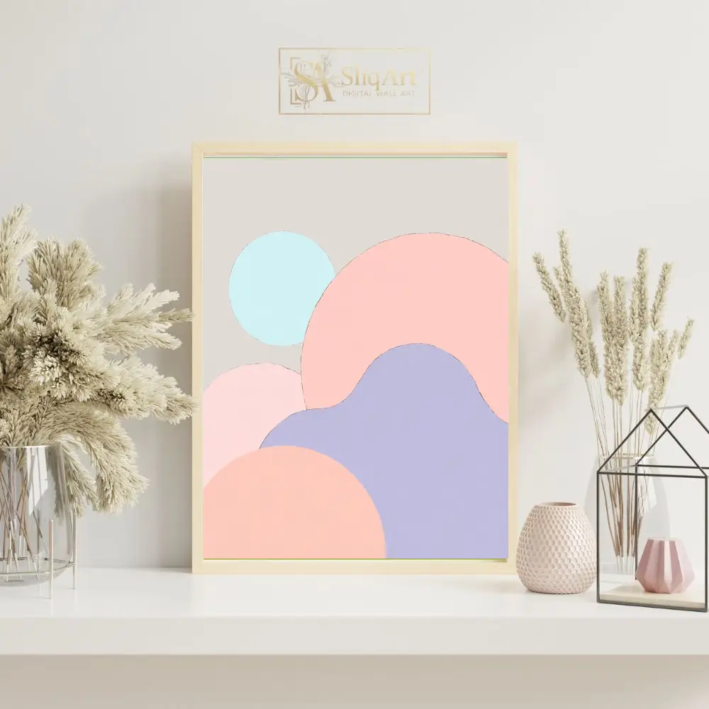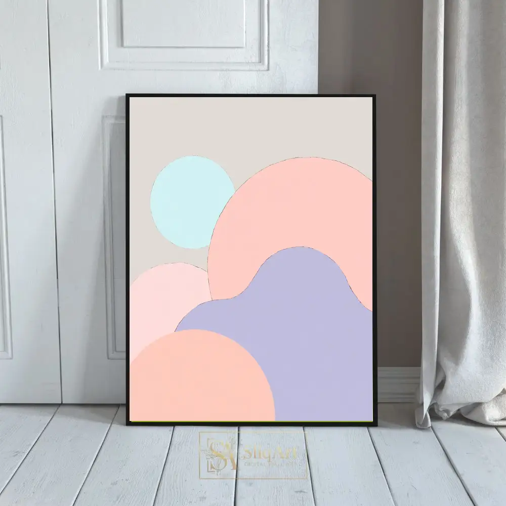 Showcasing a harmonious blend of organic circular forms in a soft palette of blush pink, lavender, and mint blue, this artwork brings a sense of calm and balance to any room. The subtle beige background ensures it complements a wide range of interior styles, from contemporary to Scandinavian minimalist, adding a touch of modern sophistication without overwhelming the space.