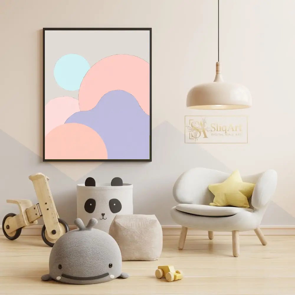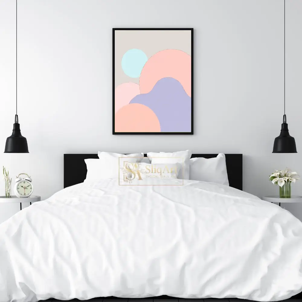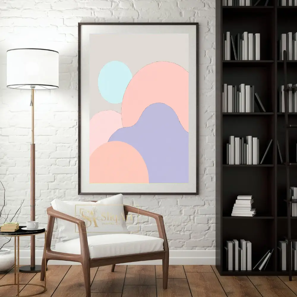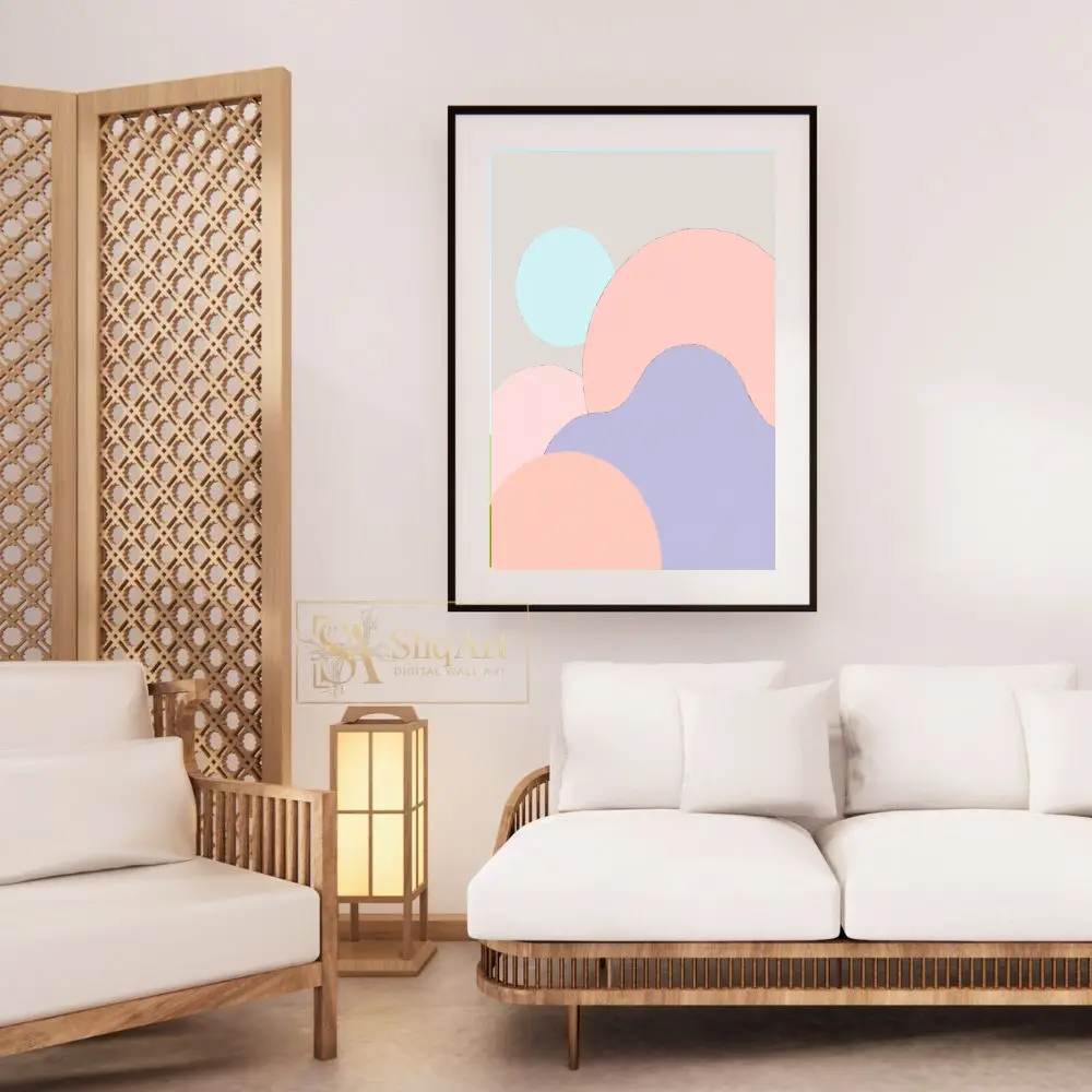 Showcasing a harmonious blend of organic circular forms in a soft palette of blush pink, lavender, and mint blue, this artwork brings a sense of calm and balance to any room. The subtle beige background ensures it complements a wide range of interior styles, from contemporary to Scandinavian minimalist, adding a touch of modern sophistication without overwhelming the space.