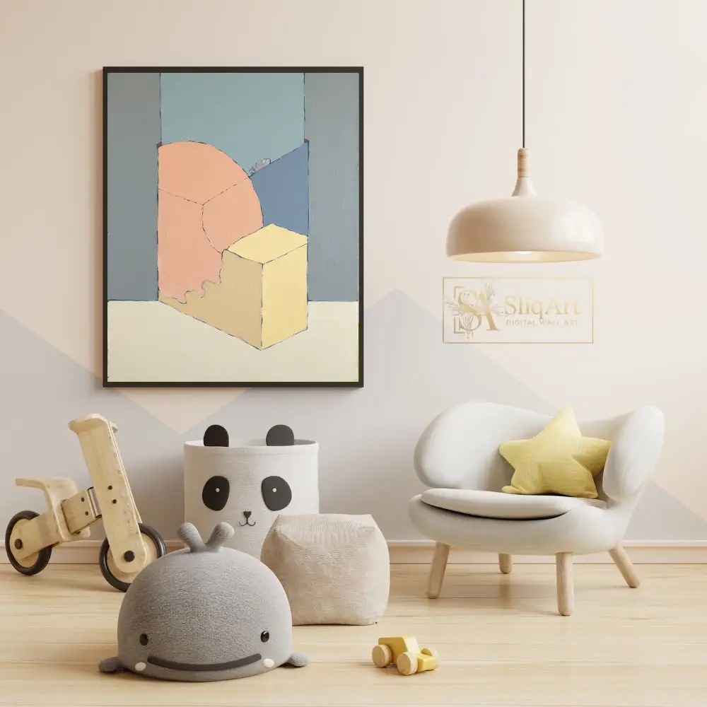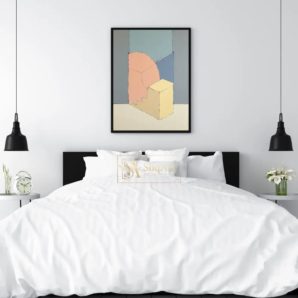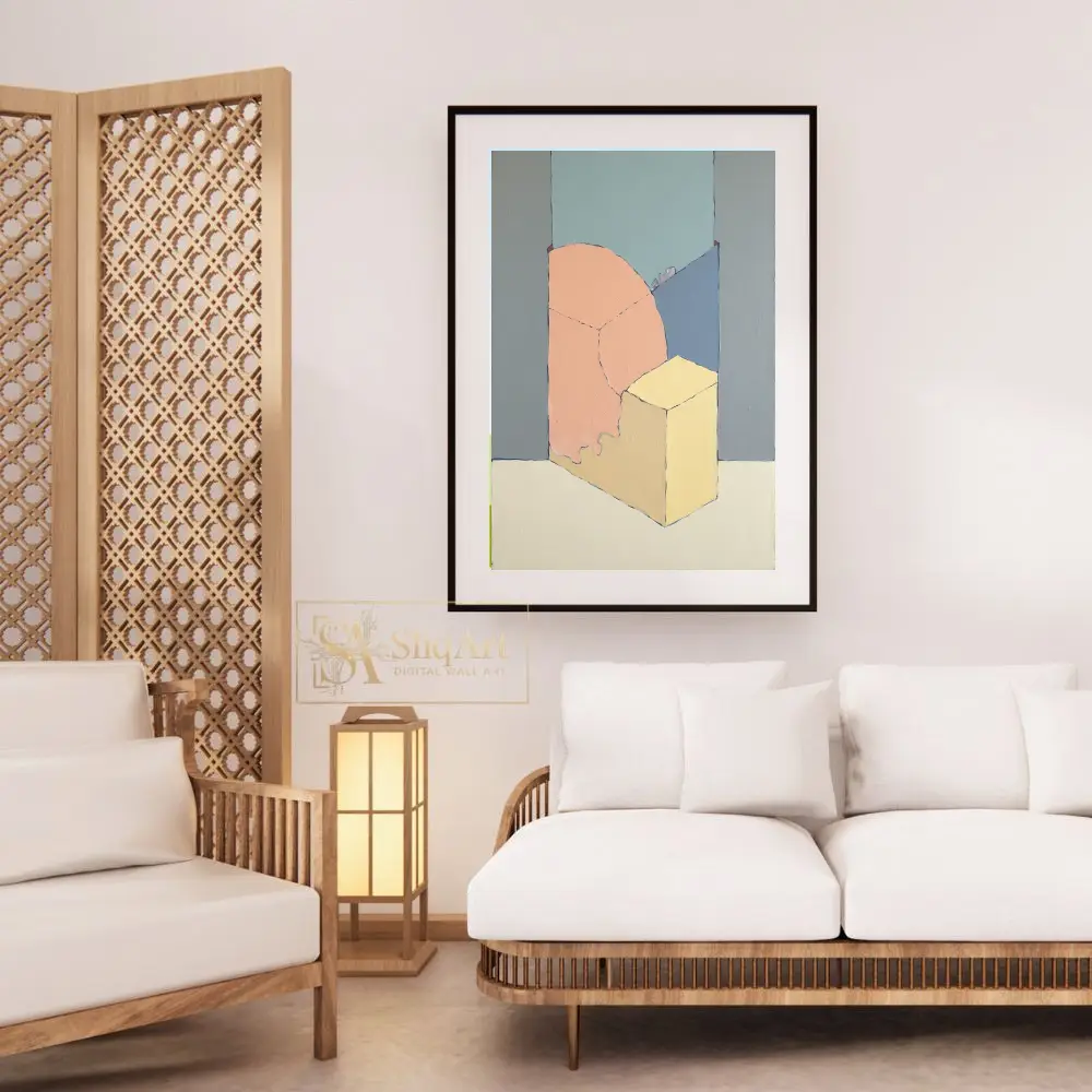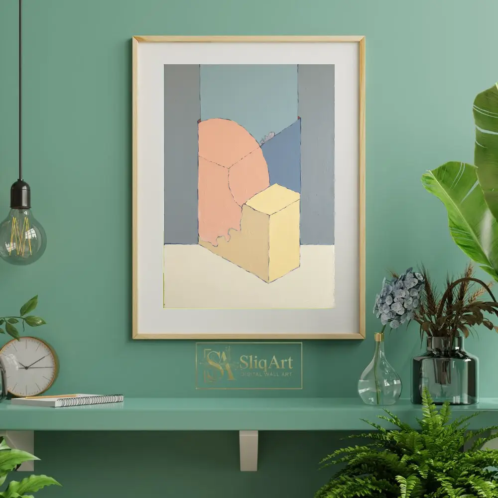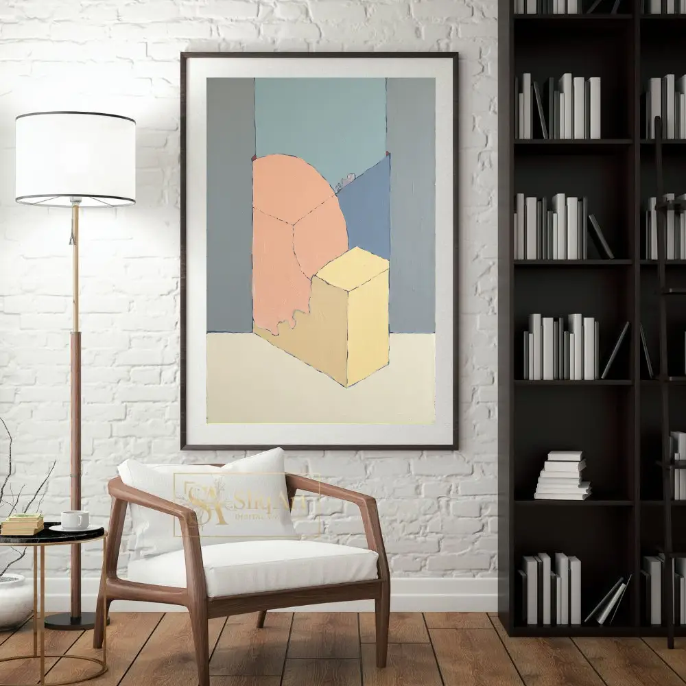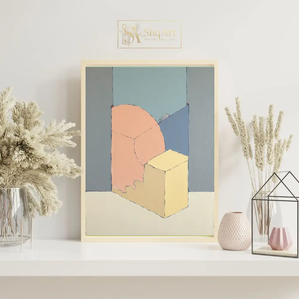 Elevate your interior with this sophisticated abstract painting, featuring a harmonious blend of geometric structures and organic curves. This piece showcases a textured interplay of soft coral, butter yellow, and muted blue tones against a neutral backdrop.
