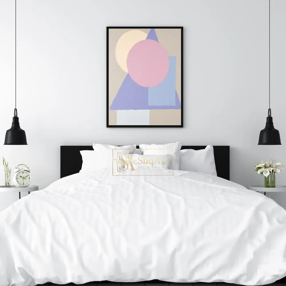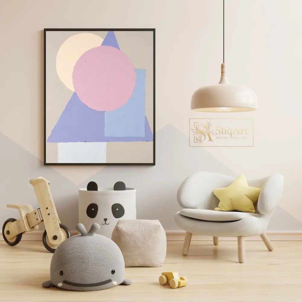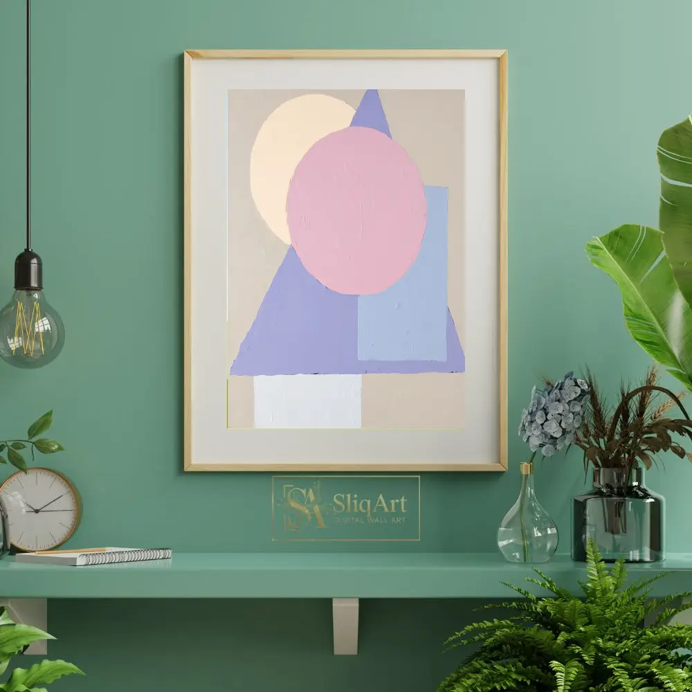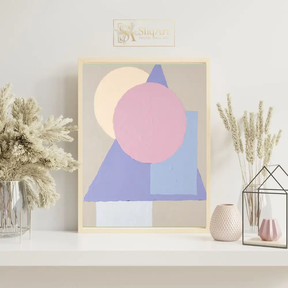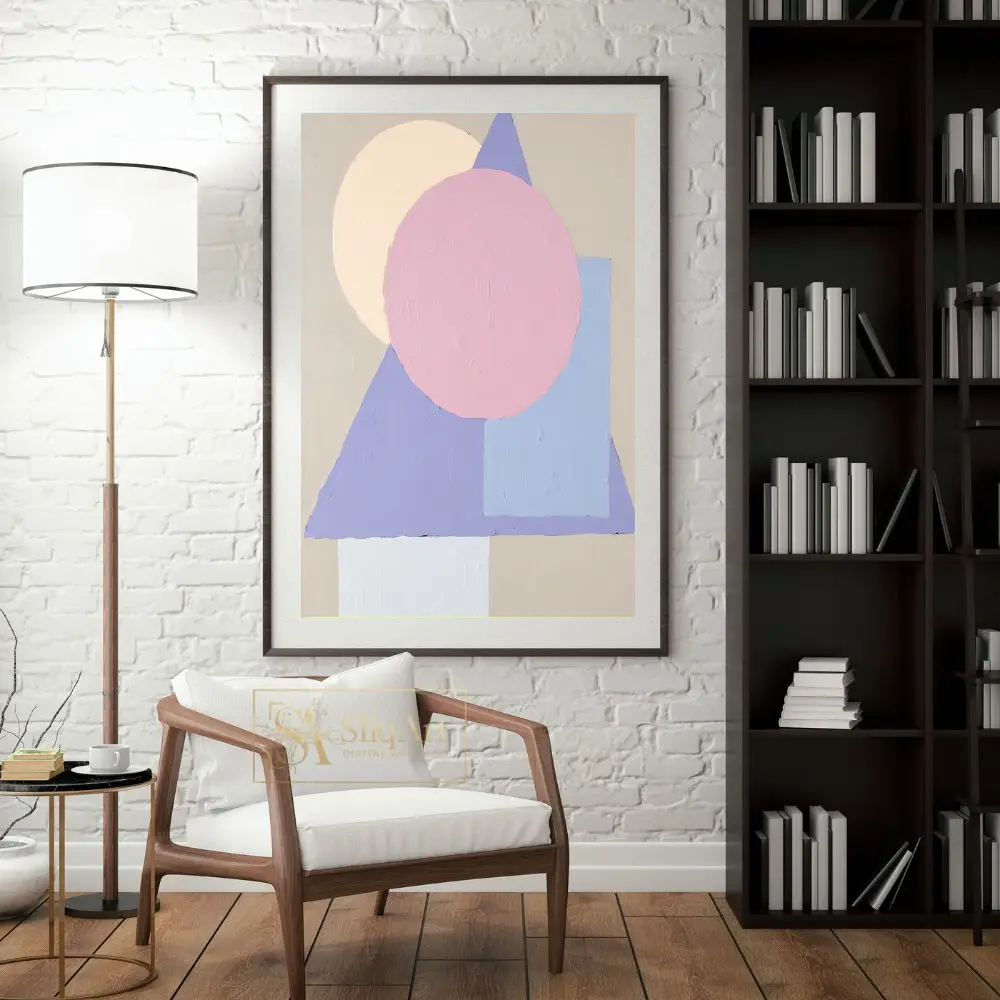 Featuring overlapping circles, triangles, and rectangular forms in a soothing pastel palette of soft pink, lavender, and muted yellow, this piece brings a sense of balanced harmony to any room. The visible impasto-style texture adds tactile depth and a handcrafted feel, making it a sophisticated addition to a contemporary or Scandinavian-inspired home environment.