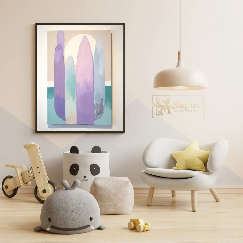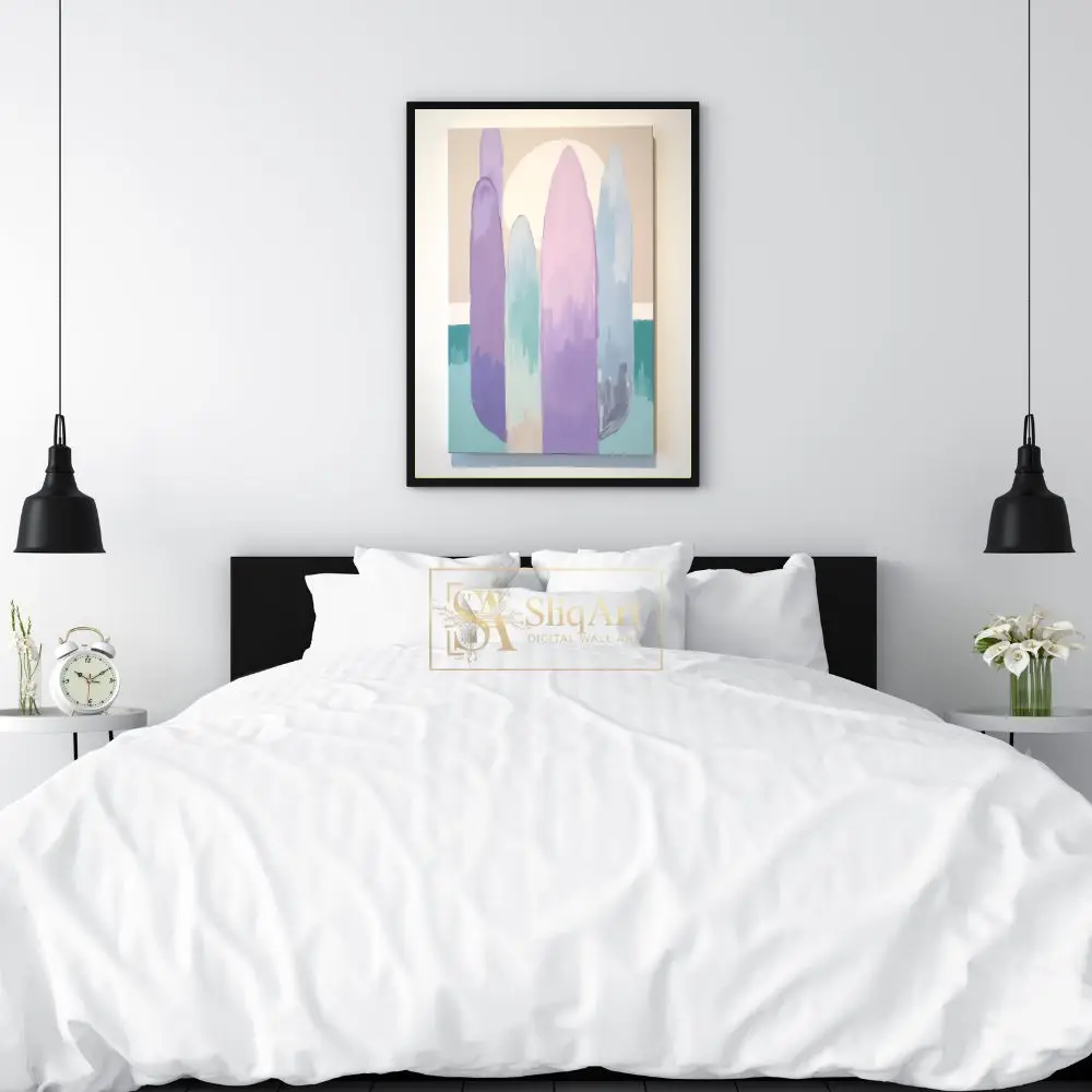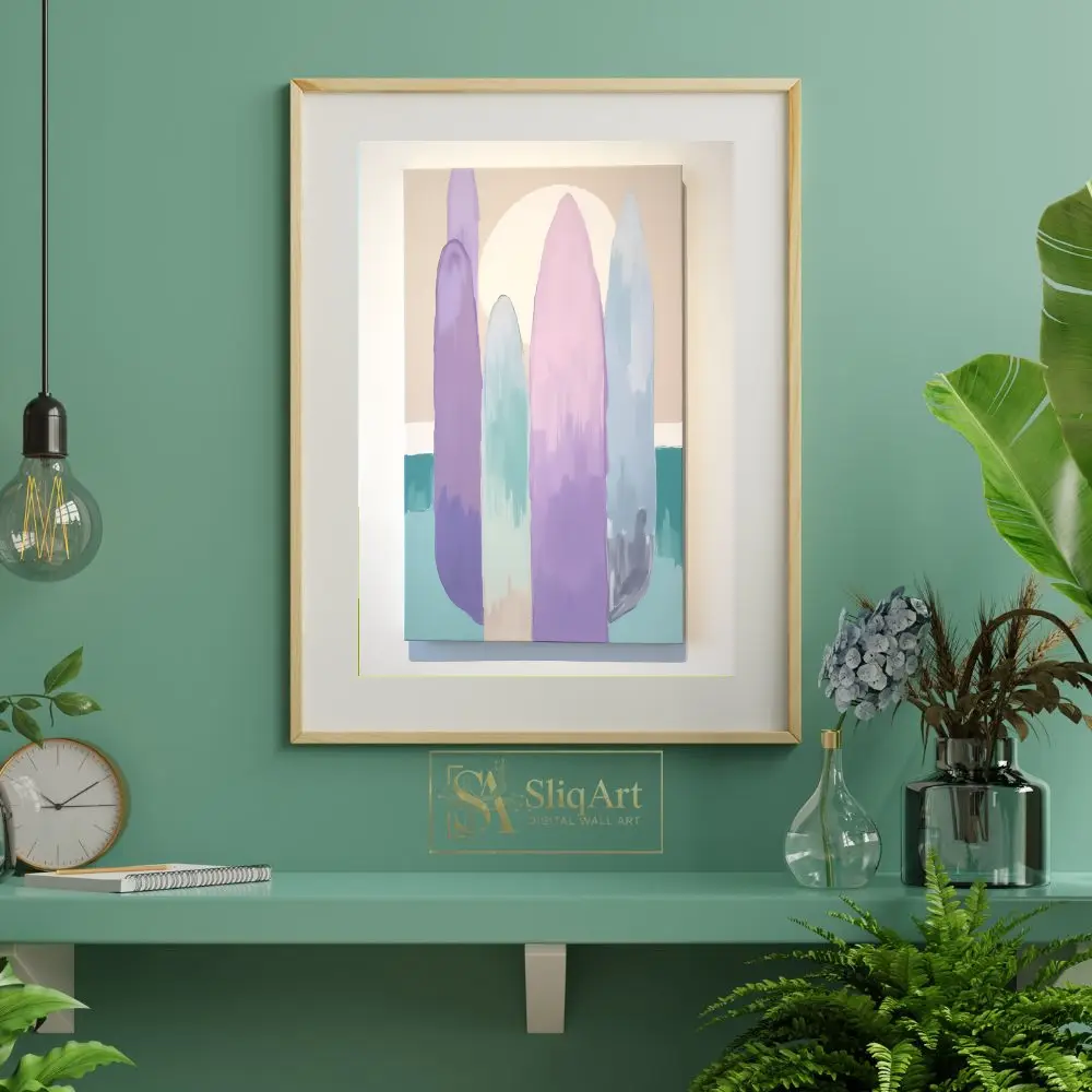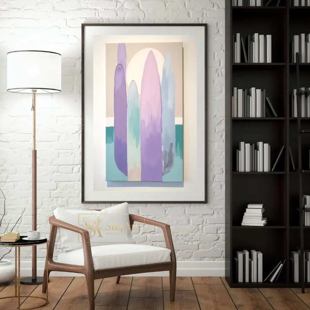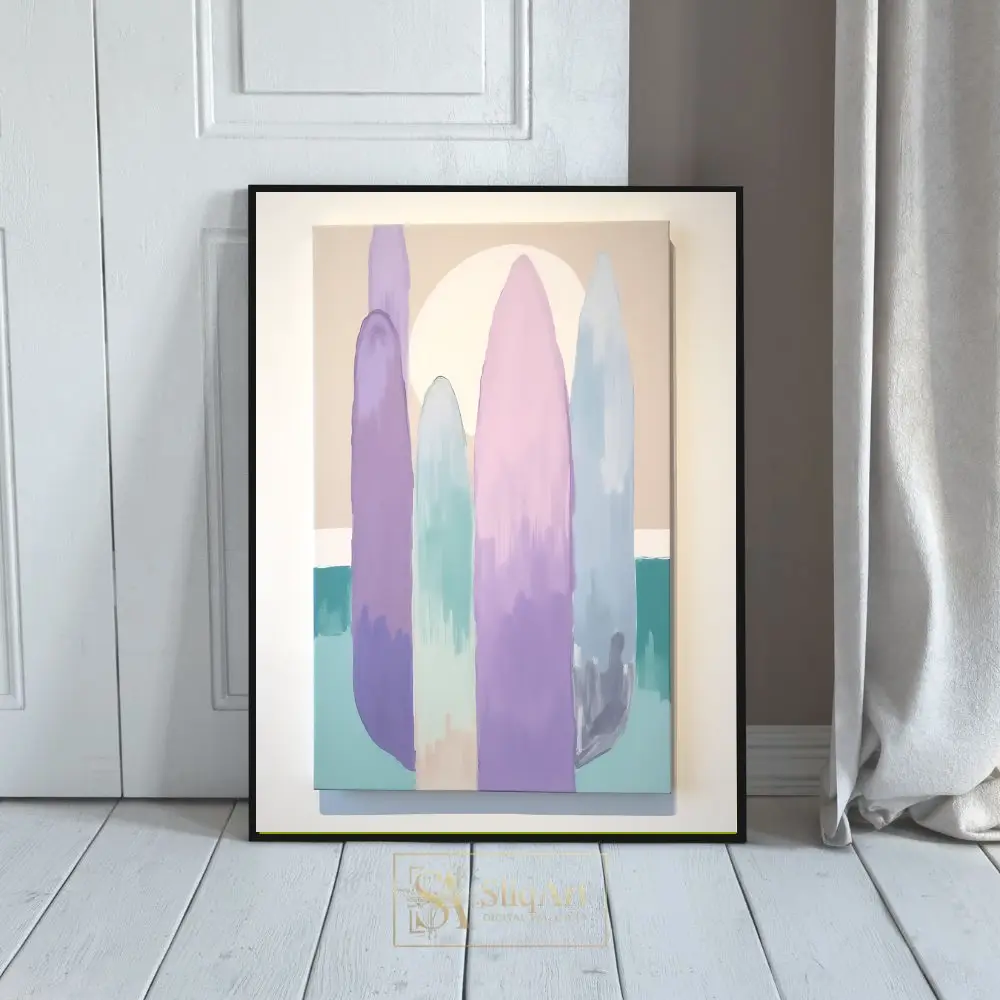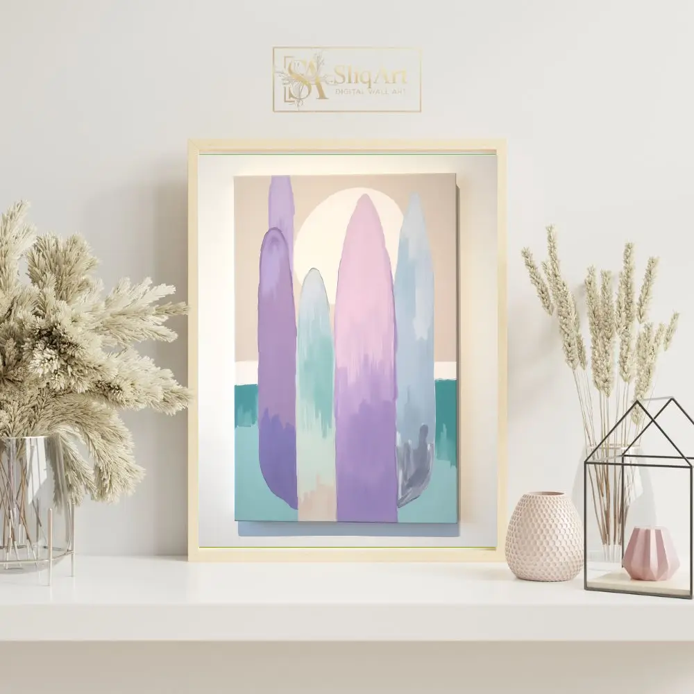 Elevate your interior design with this tranquil minimalist abstract painting. The artwork features tall, elongated organic shapes in a soft palette of lavender, mint, and blush pink, set against a warm beige background with a large, glowing sun.