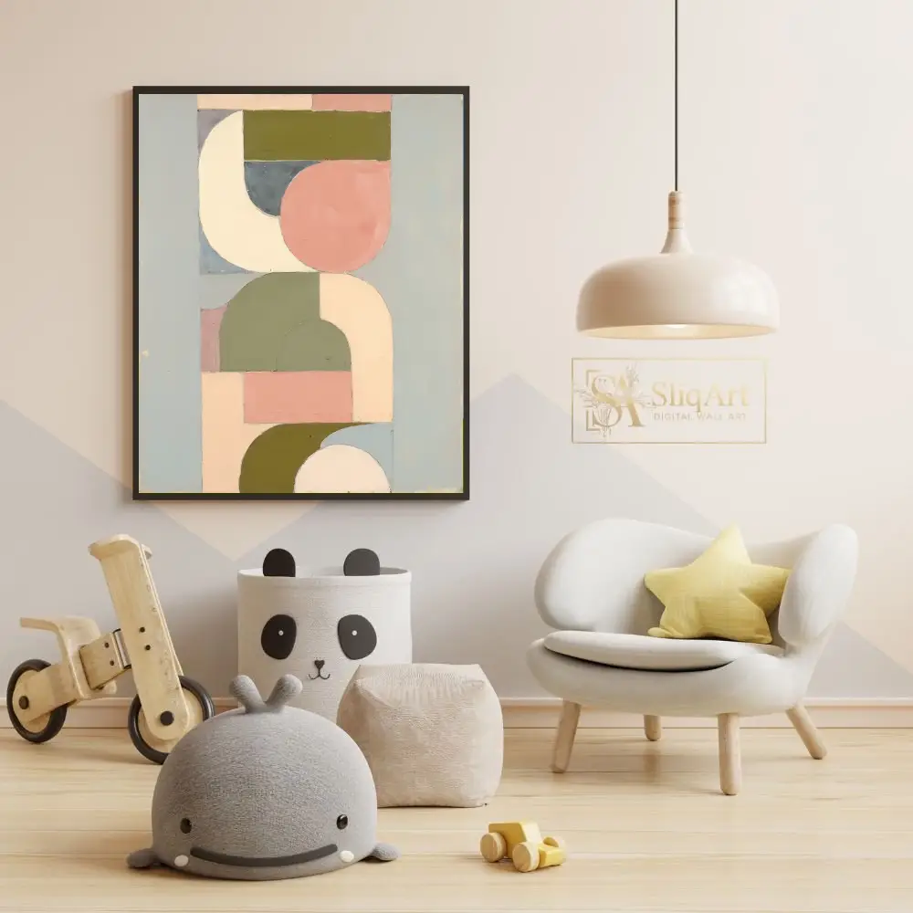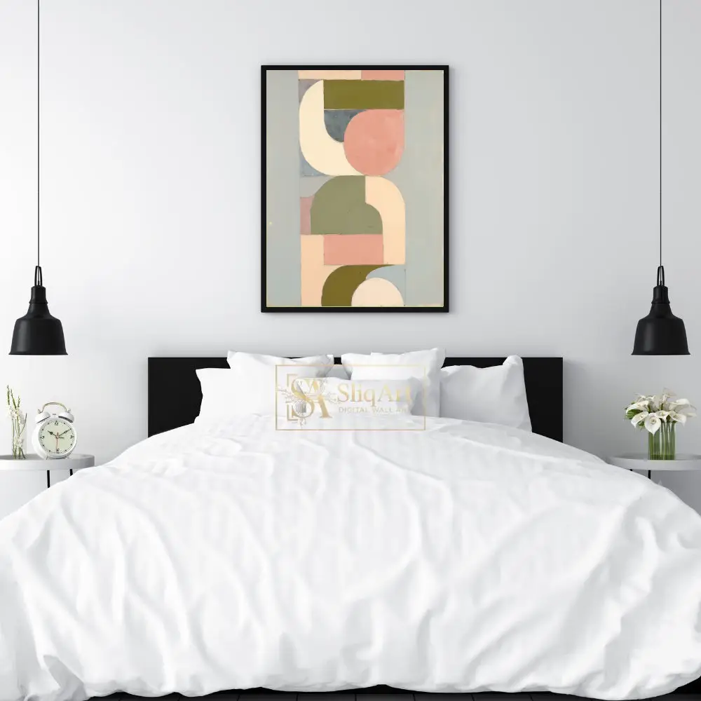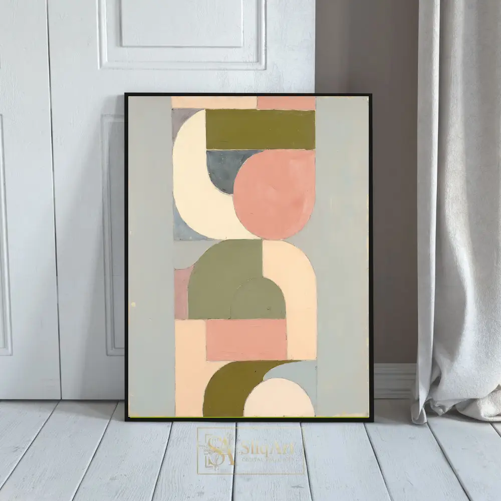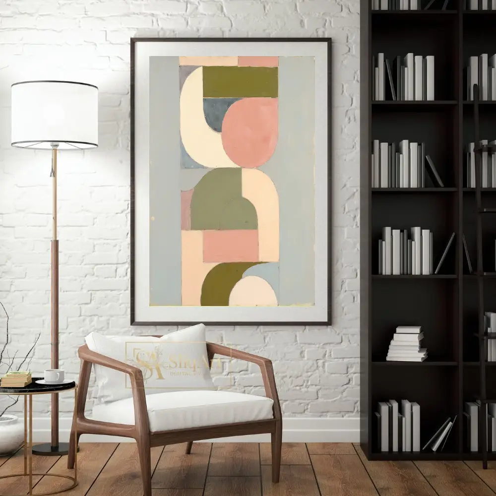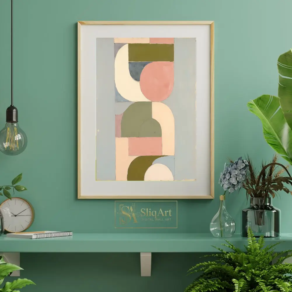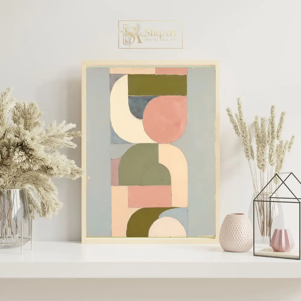 Transform your space with this sophisticated geometric abstract art piece, blending mid-century modern sensibilities with a soothing contemporary palette.