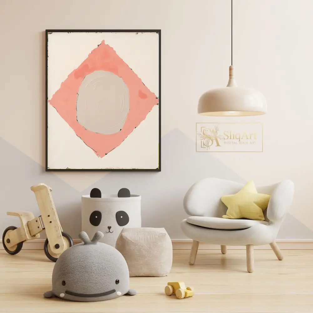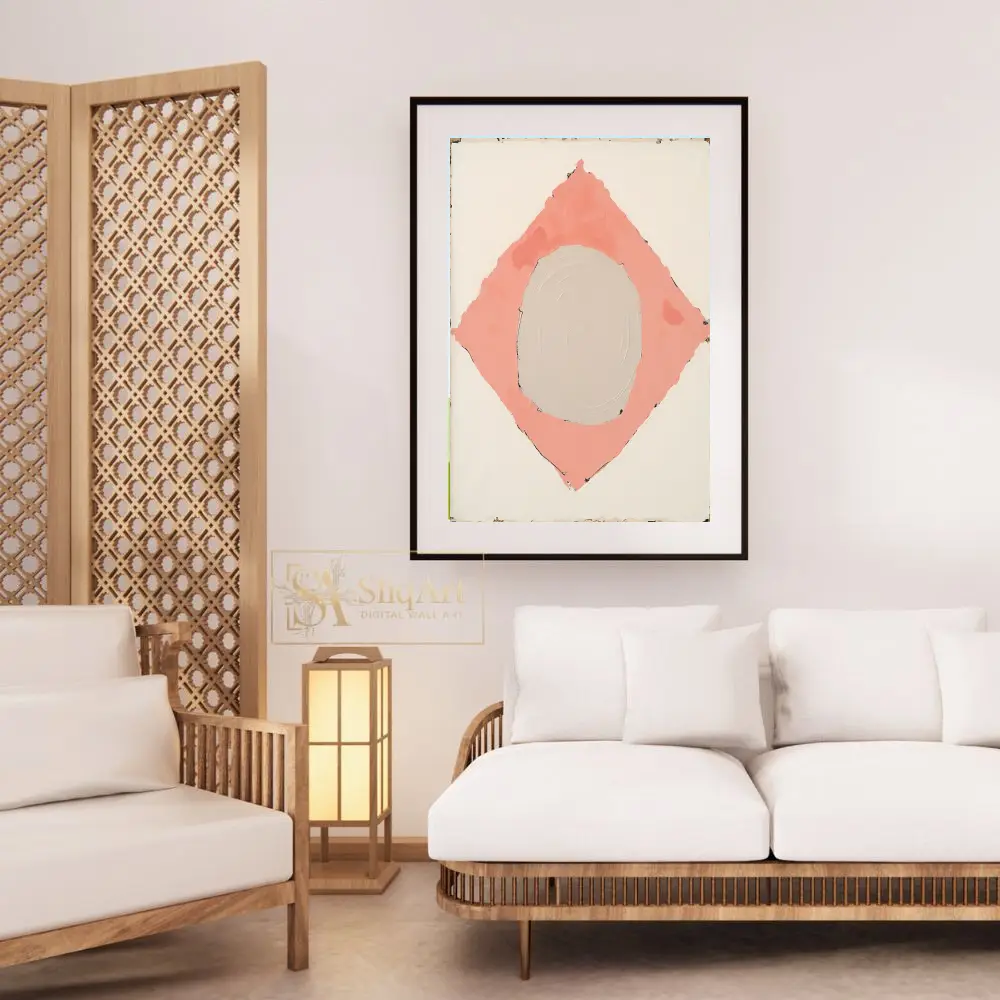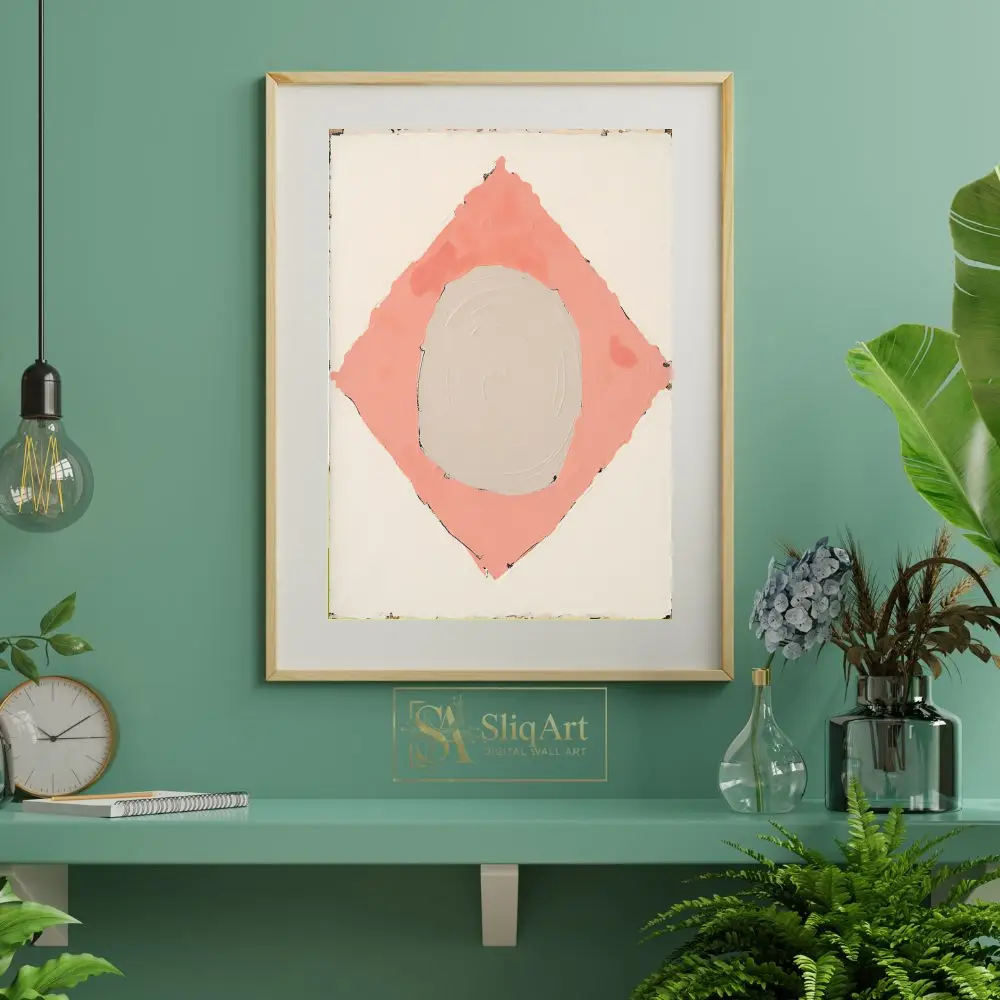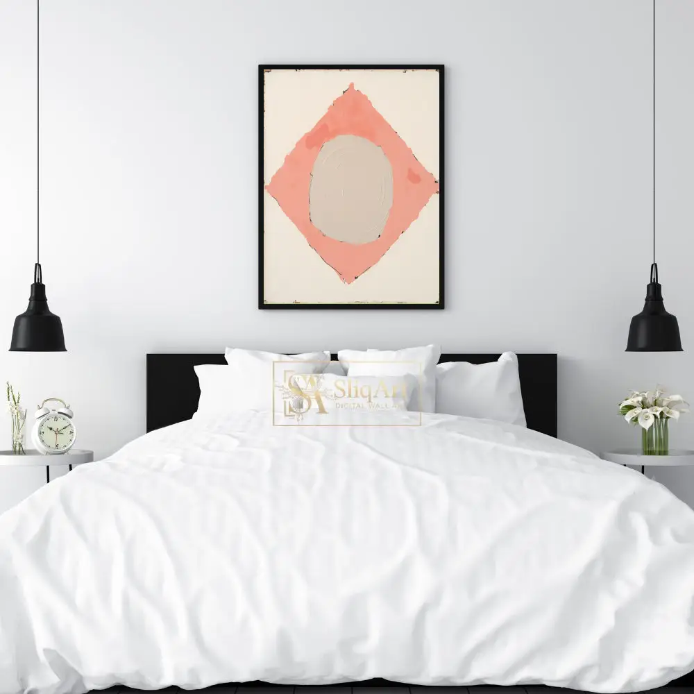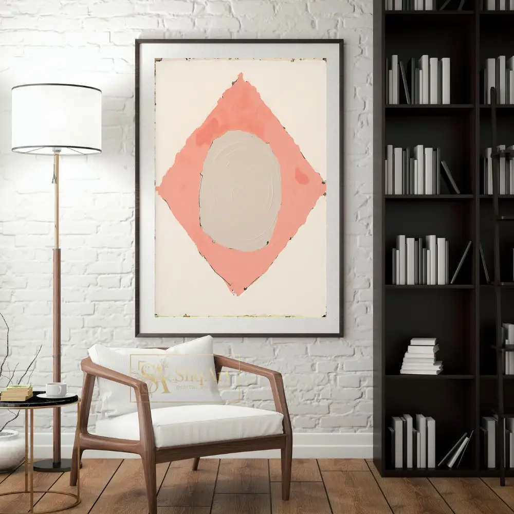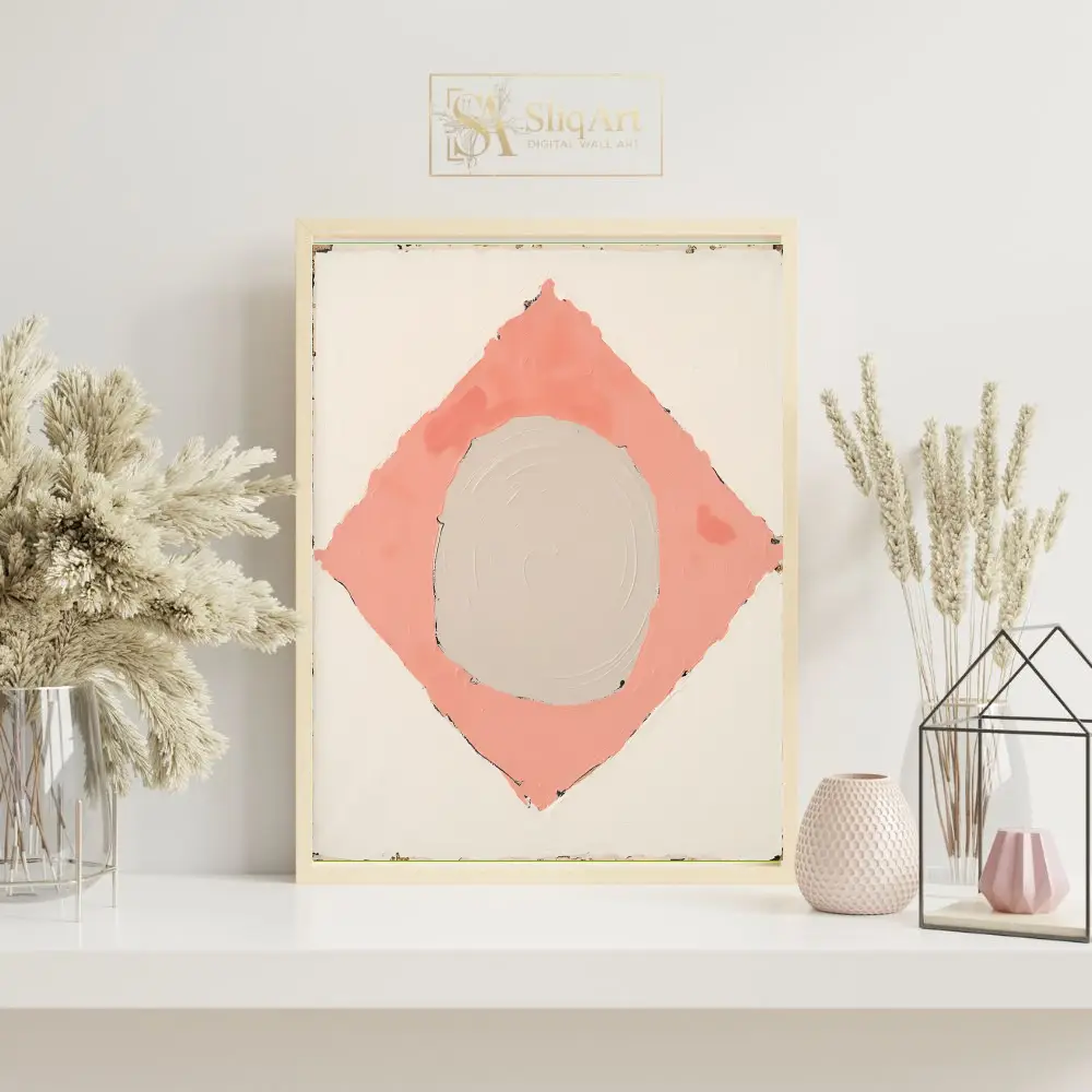 Enhance your contemporary space with this sophisticated minimalist abstract painting. The artwork features a central, textured beige circle cradled within a soft salmon pink diamond, all set against a clean white backdrop.