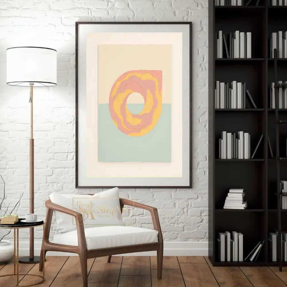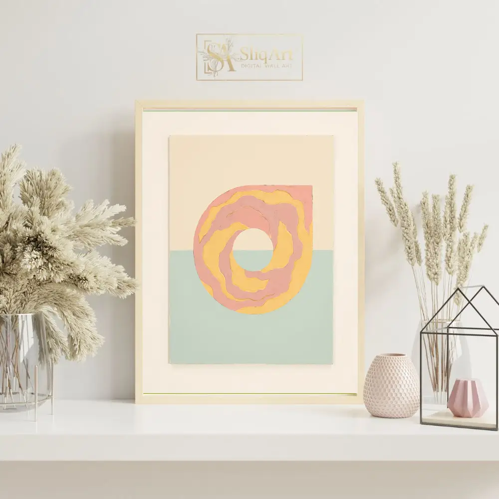 Modern abstract art featuring a pink and yellow textured swirl on a split cream and mint green background.