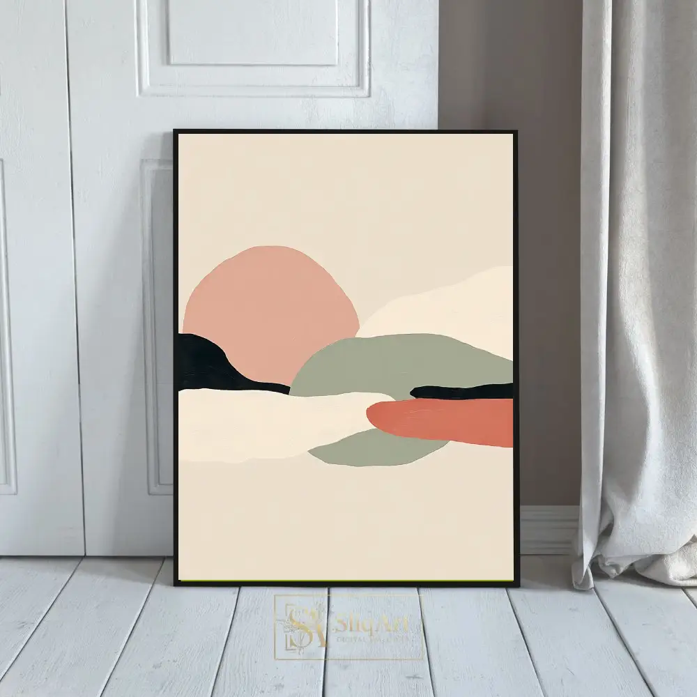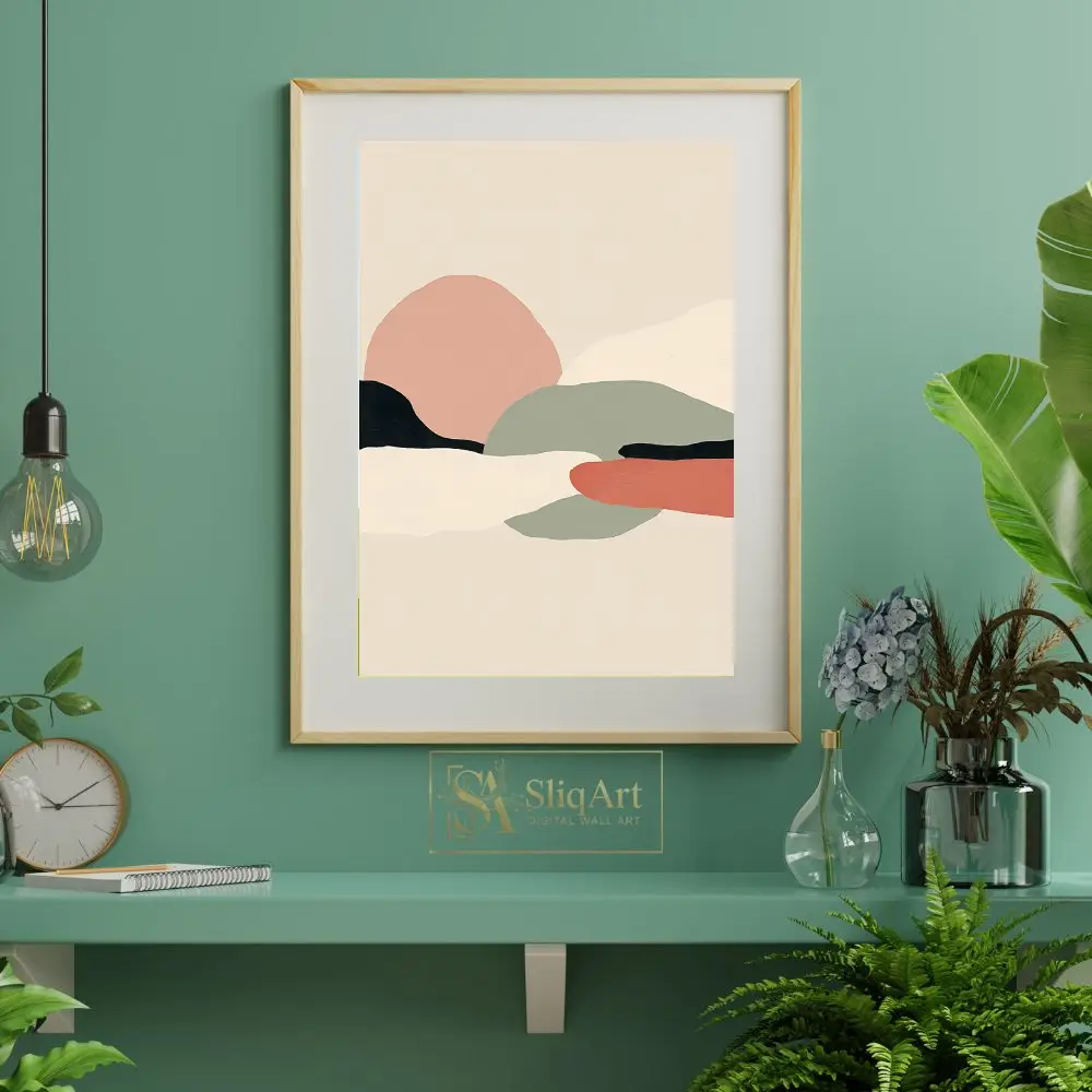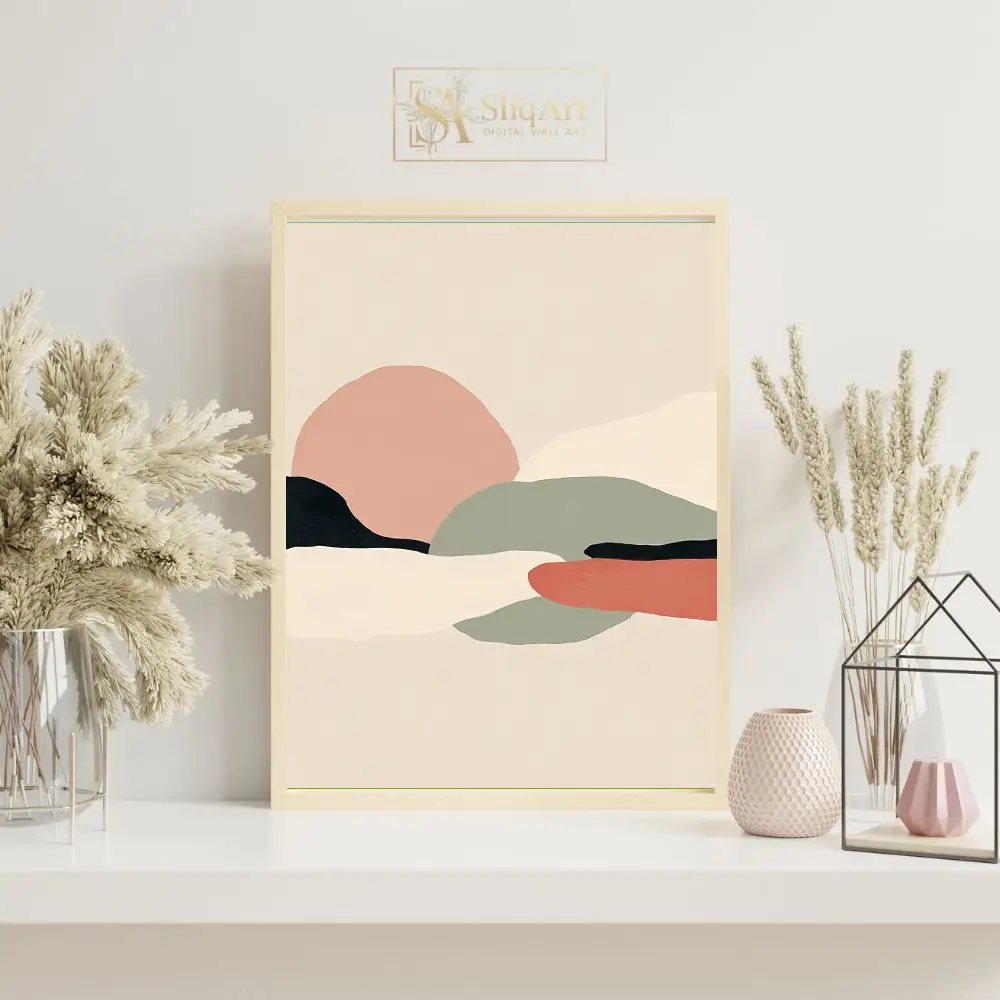 Experience the tranquil beauty of nature through a minimalist lens with this abstract landscape piece. Characterized by soft, organic shapes that mimic rolling hills and distant horizons, this artwork utilizes a curated palette of dusty pink, sage green, and earthy terracotta.