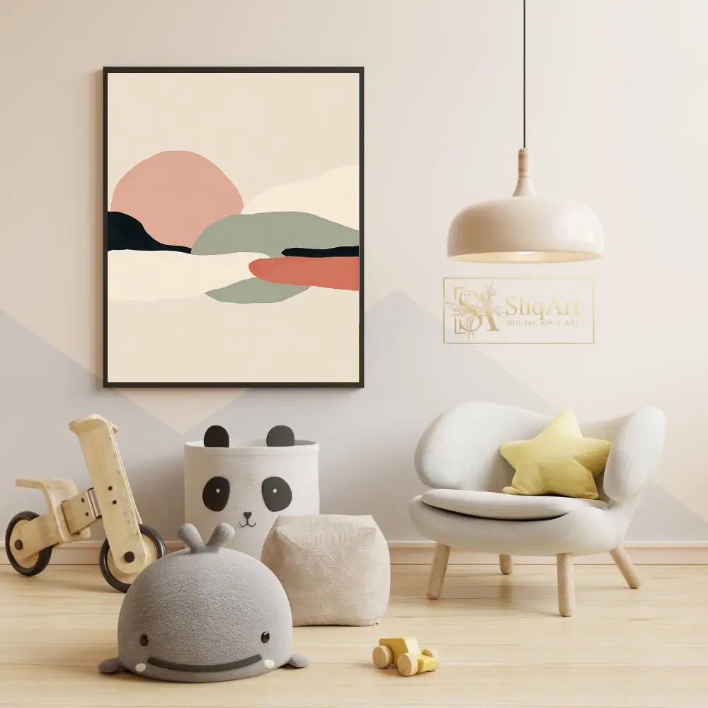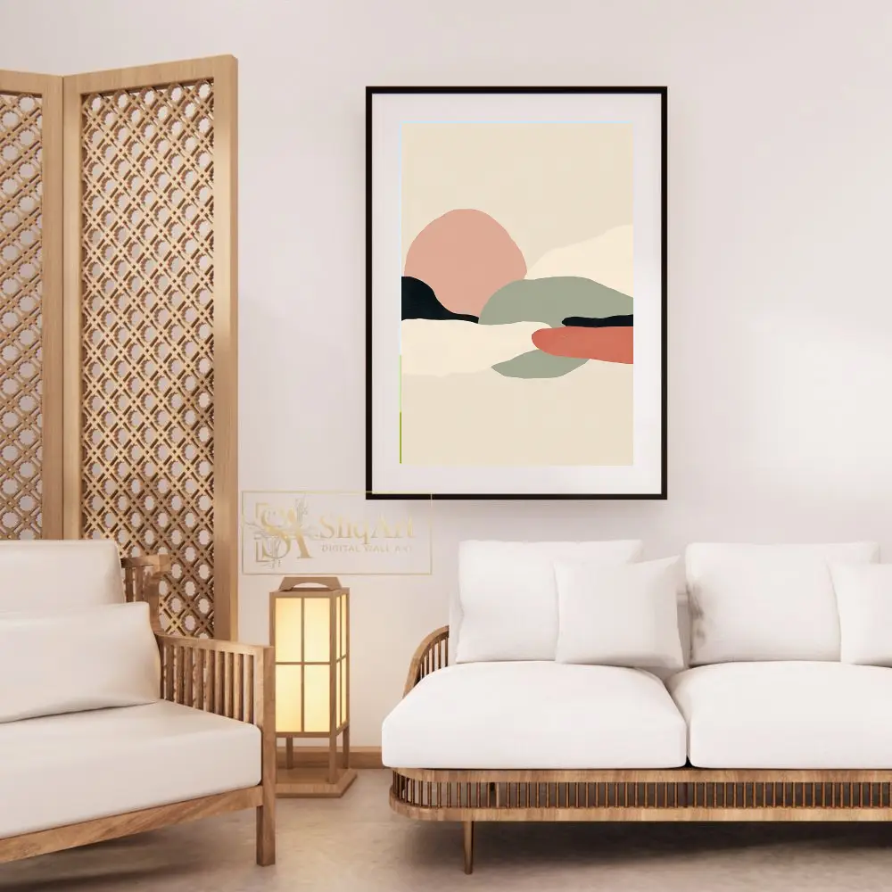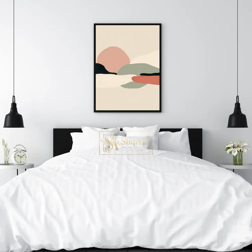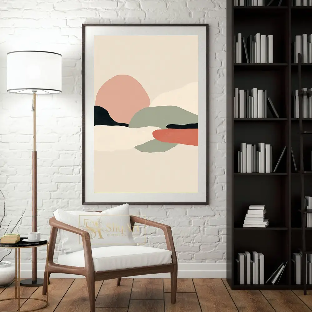 Experience the tranquil beauty of nature through a minimalist lens with this abstract landscape piece. Characterized by soft, organic shapes that mimic rolling hills and distant horizons, this artwork utilizes a curated palette of dusty pink, sage green, and earthy terracotta.