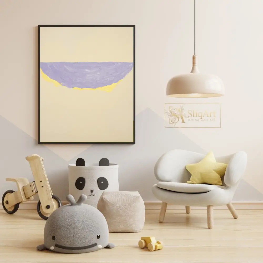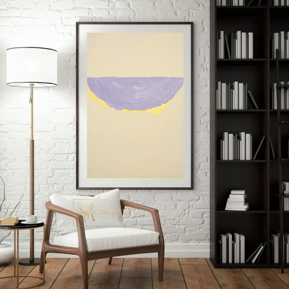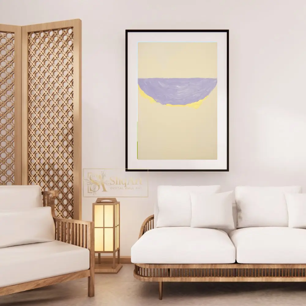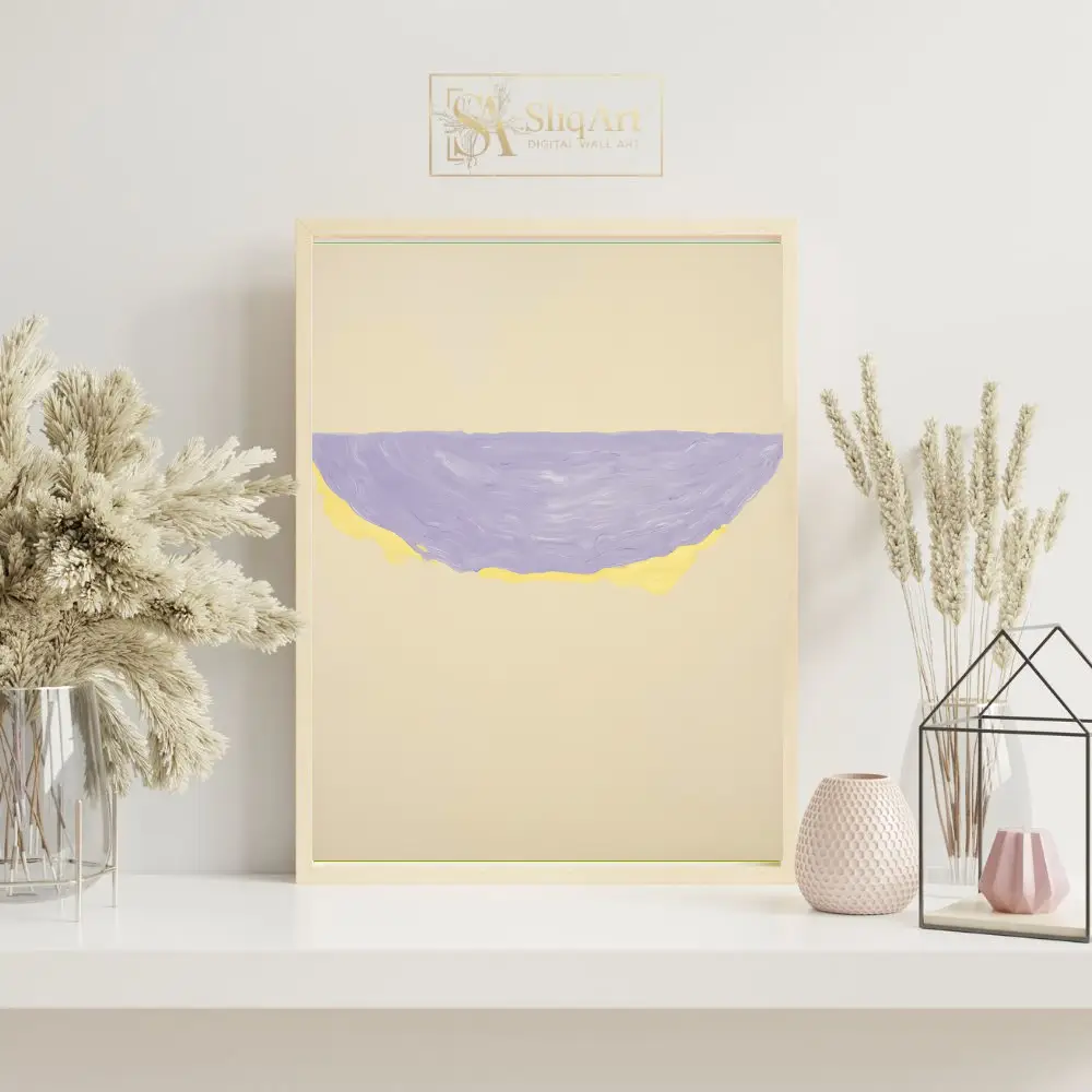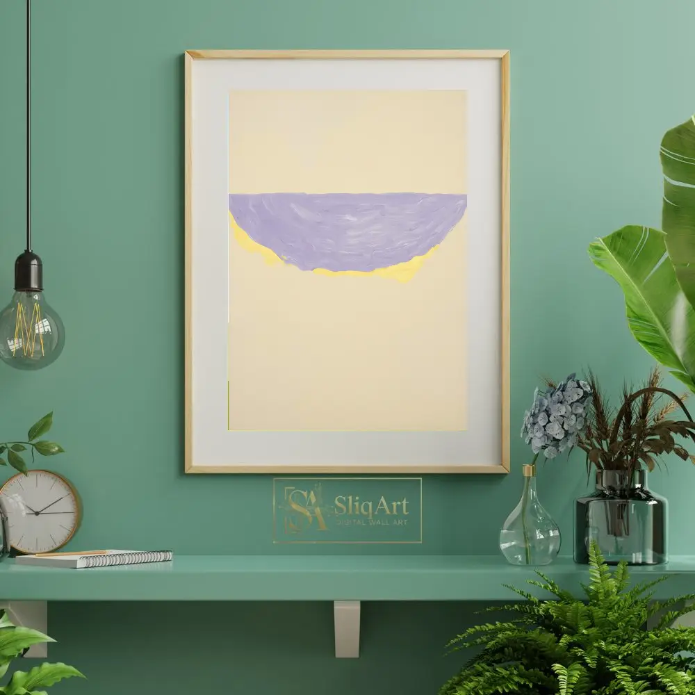 This sophisticated abstract piece captures the essence of modern minimalism through its bold yet simple composition. A textured semi-circular form, rendered in a soothing lavender hue with a vibrant yellow undercurrent, floats gracefully on a neutral beige expanse.