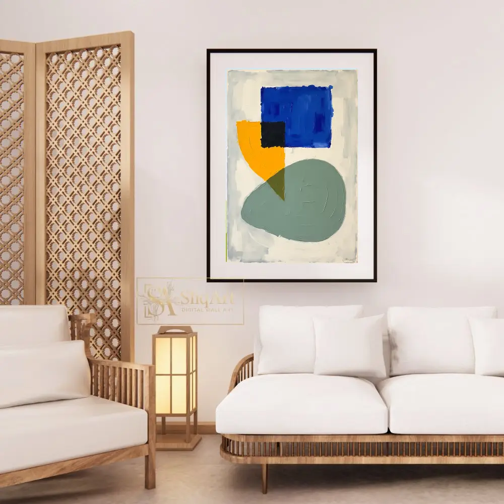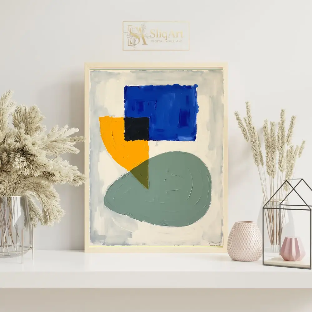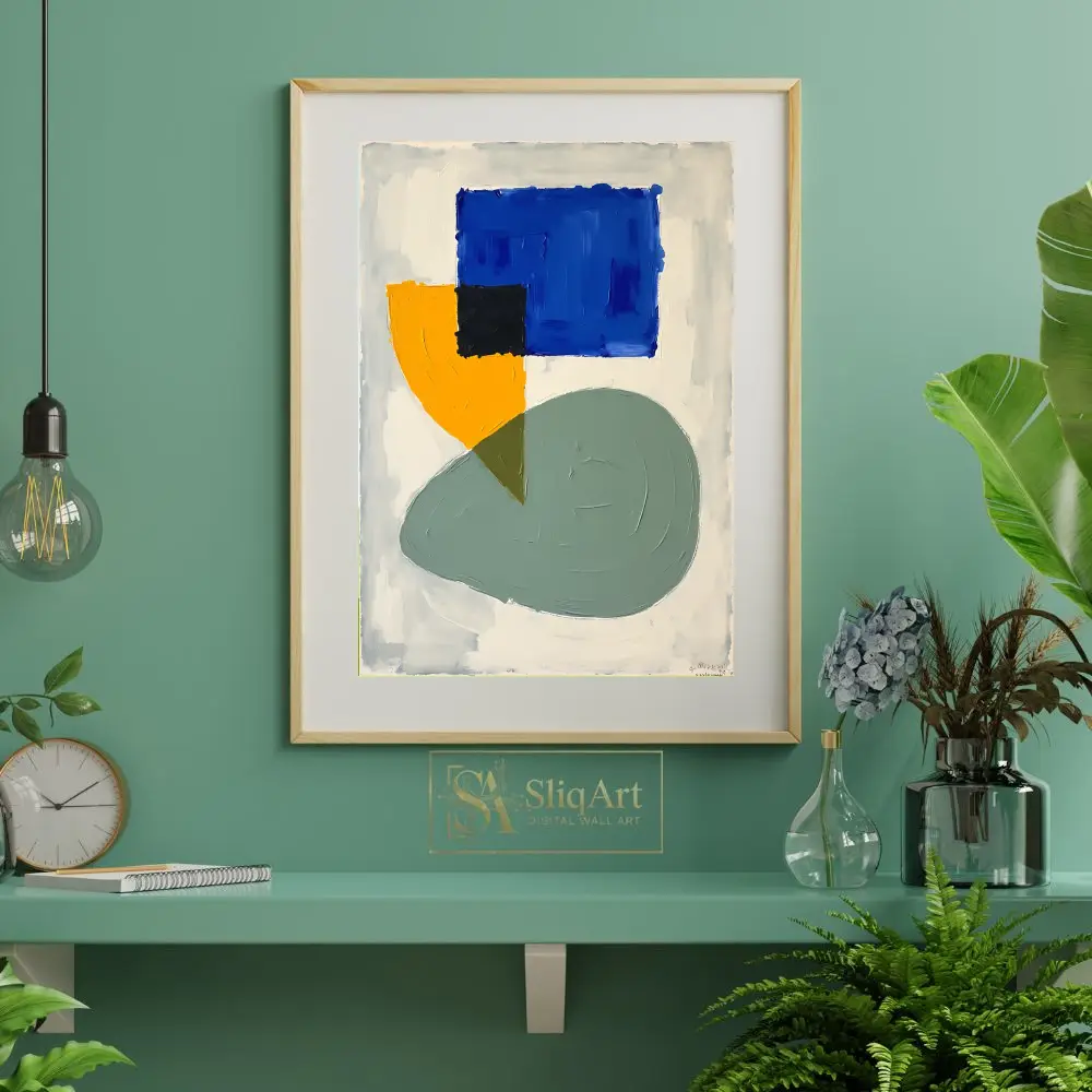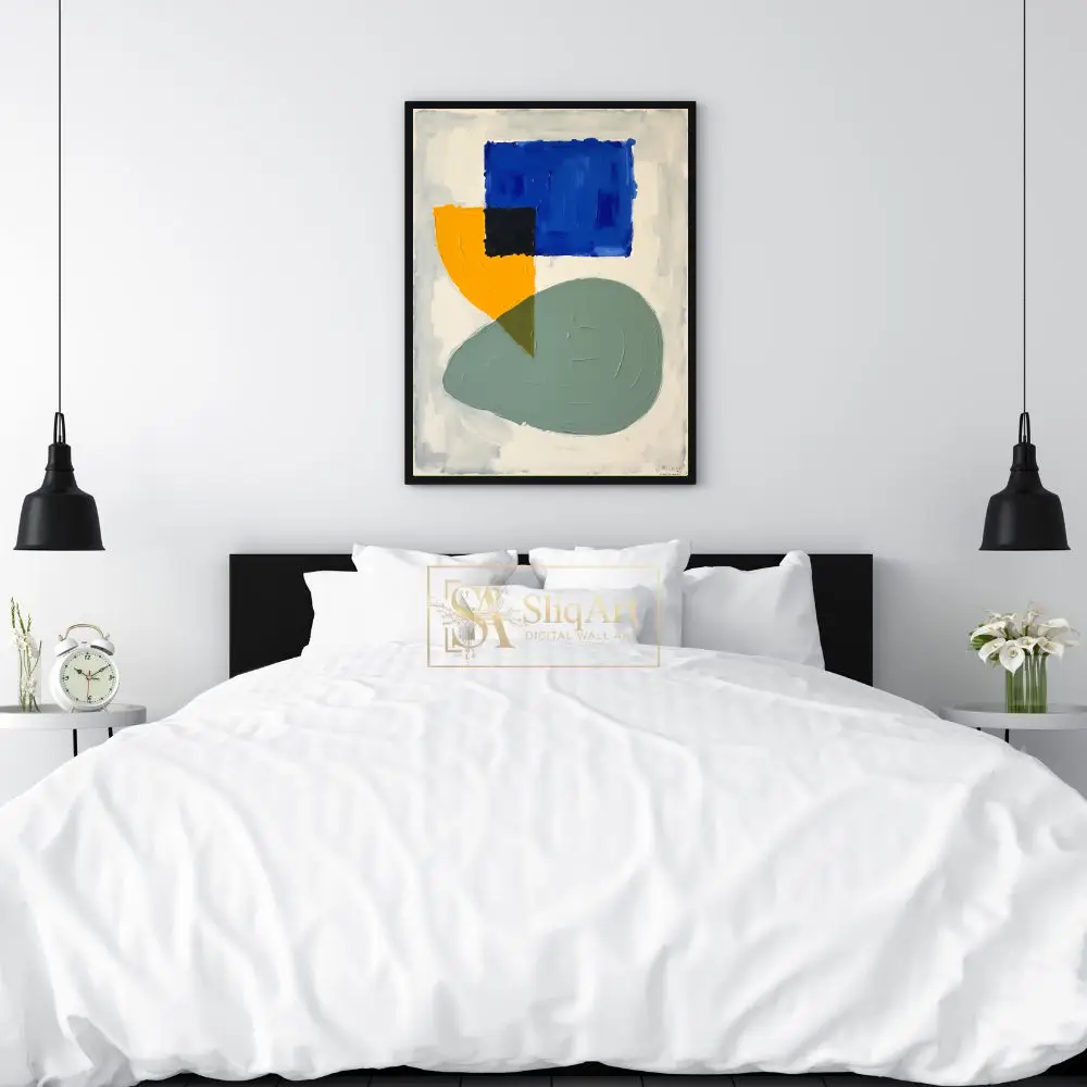 Elevate your interior with this striking abstract composition featuring bold geometric forms and rich textures. A vibrant cobalt blue rectangle anchors the upper frame, contrasted by a sunny yellow arc and a deep black square.