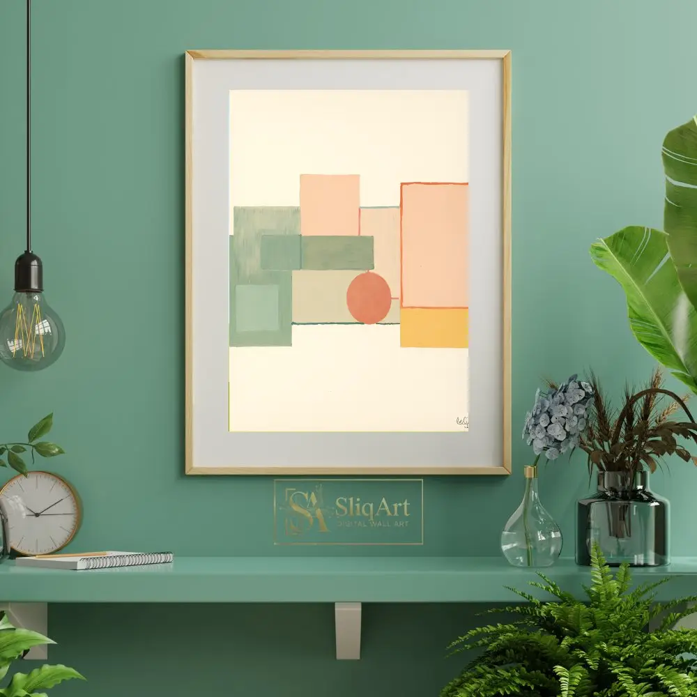 Transform your space with the balanced elegance of this minimalist geometric abstract piece. This artwork features a sophisticated composition of overlapping rectangles and a central circle, rendered in a calming palette of sage green, soft peach, dusty rose, and pale yellow.