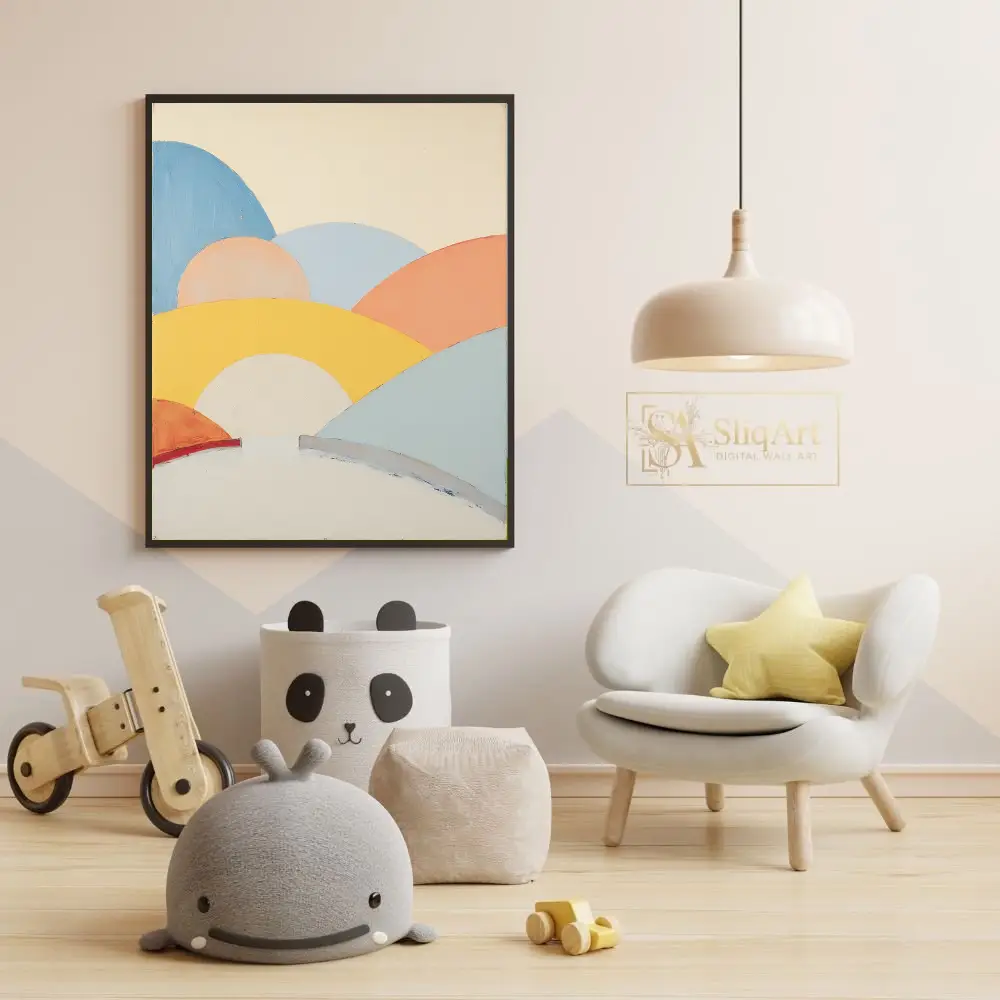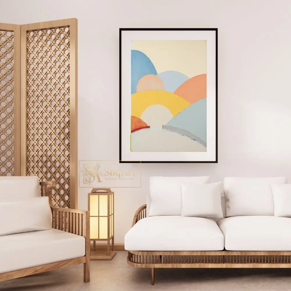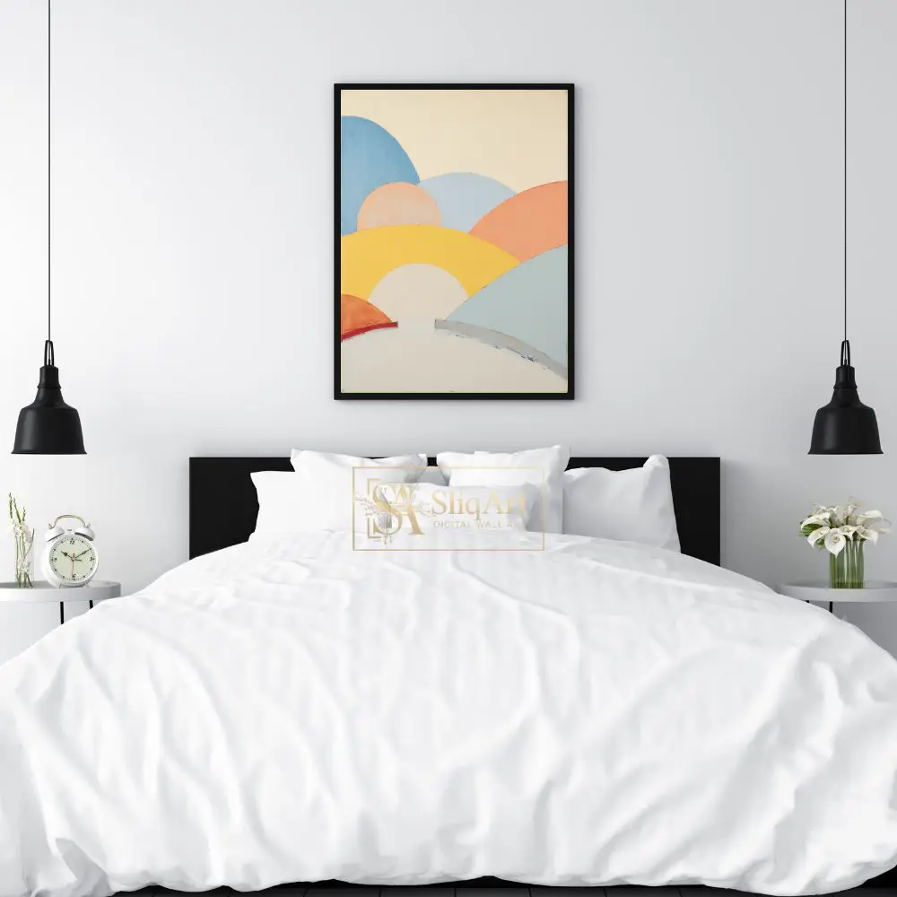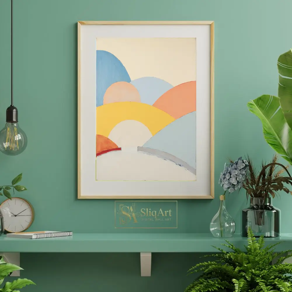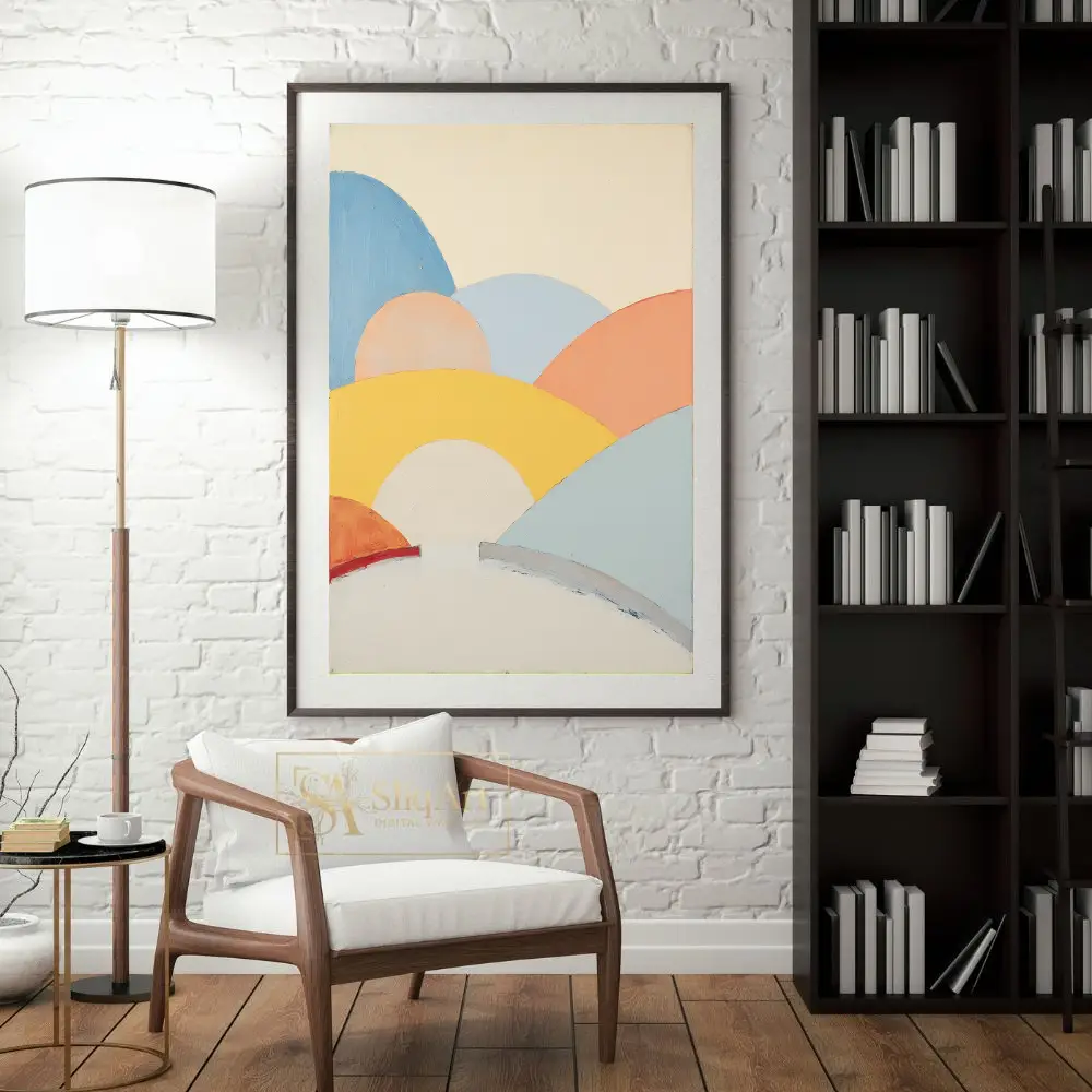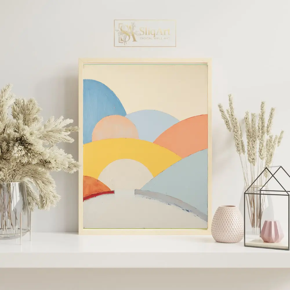 Transform your space with the serene beauty of this abstract landscape art. This piece features a series of soft, rolling hills depicted in a harmonious palette of pastel yellow, peach, sky blue, and warm terracotta.
