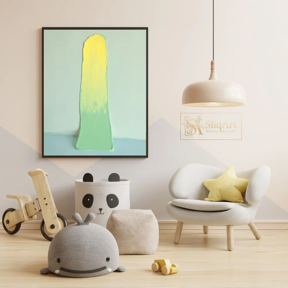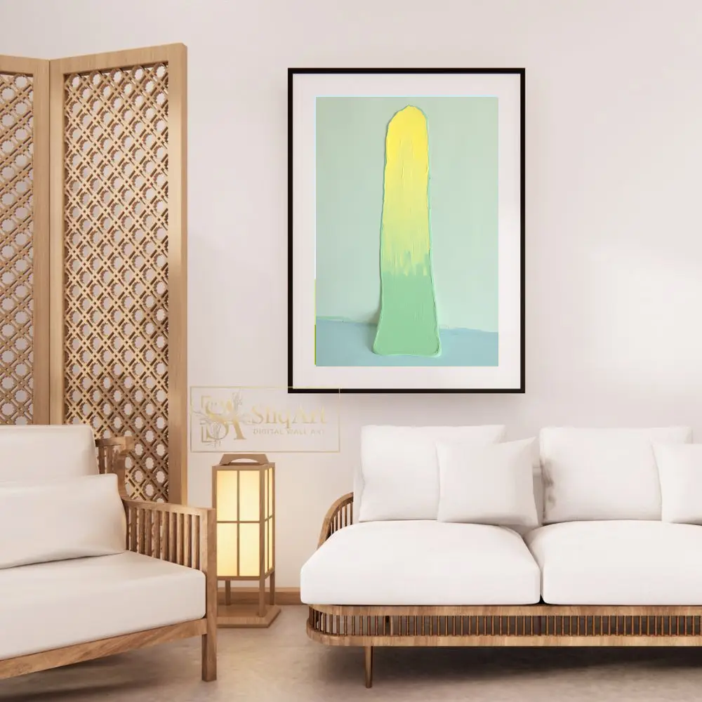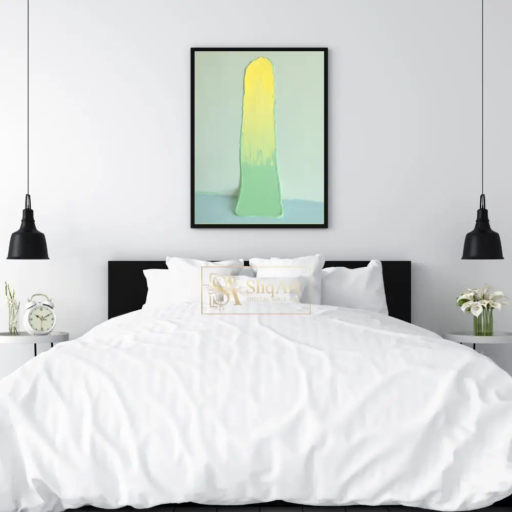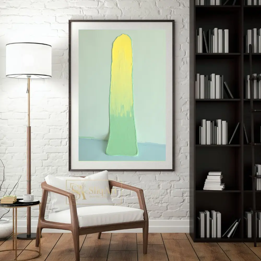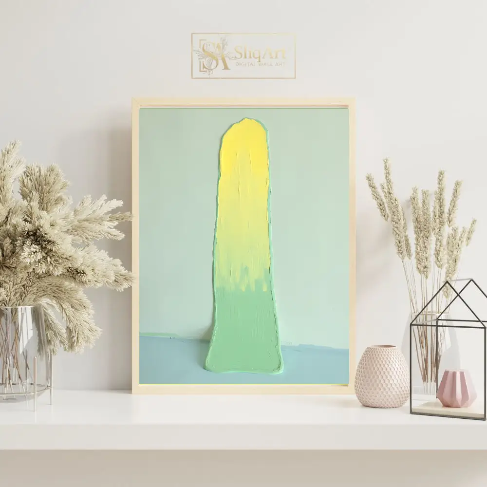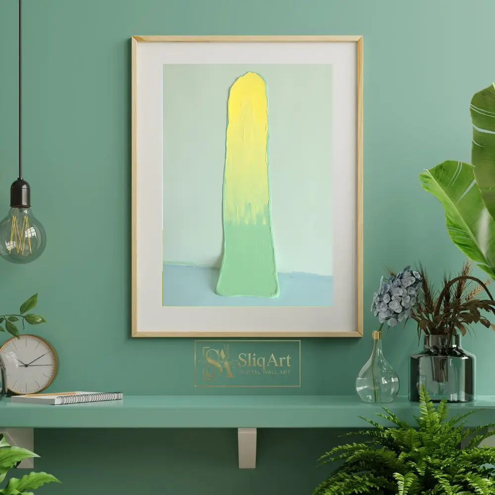 This captivating abstract piece features a bold, vertical impasto stroke that commands attention. A vibrant, sunny yellow at the top gradually blends into a soothing mint green, creating a harmonious gradient.