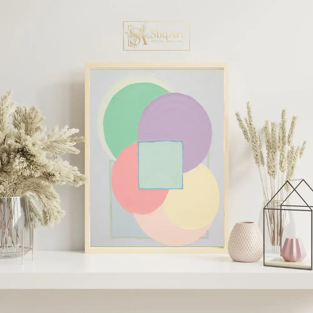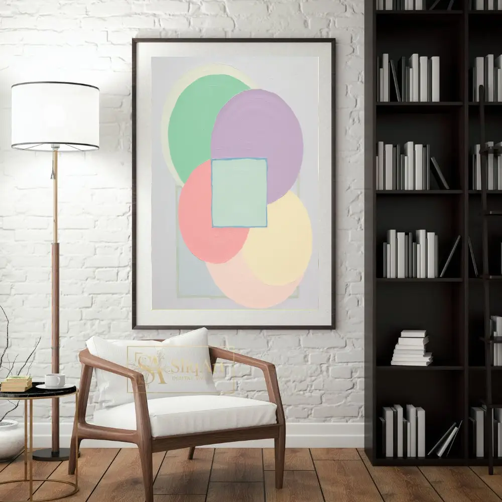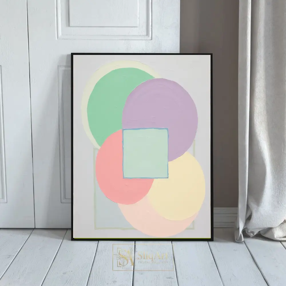 The artwork features a harmonious composition of overlapping pastel circles and a central square, creating a sense of soft balance and modern tranquility. The textured brushwork adds a tactile depth to the soothing palette of mint green, lavender, salmon pink, and pale yellow, making it an ideal choice for contemporary homes looking for a touch of serene elegance.