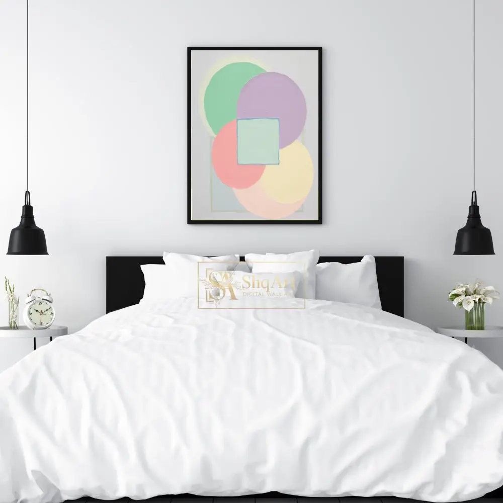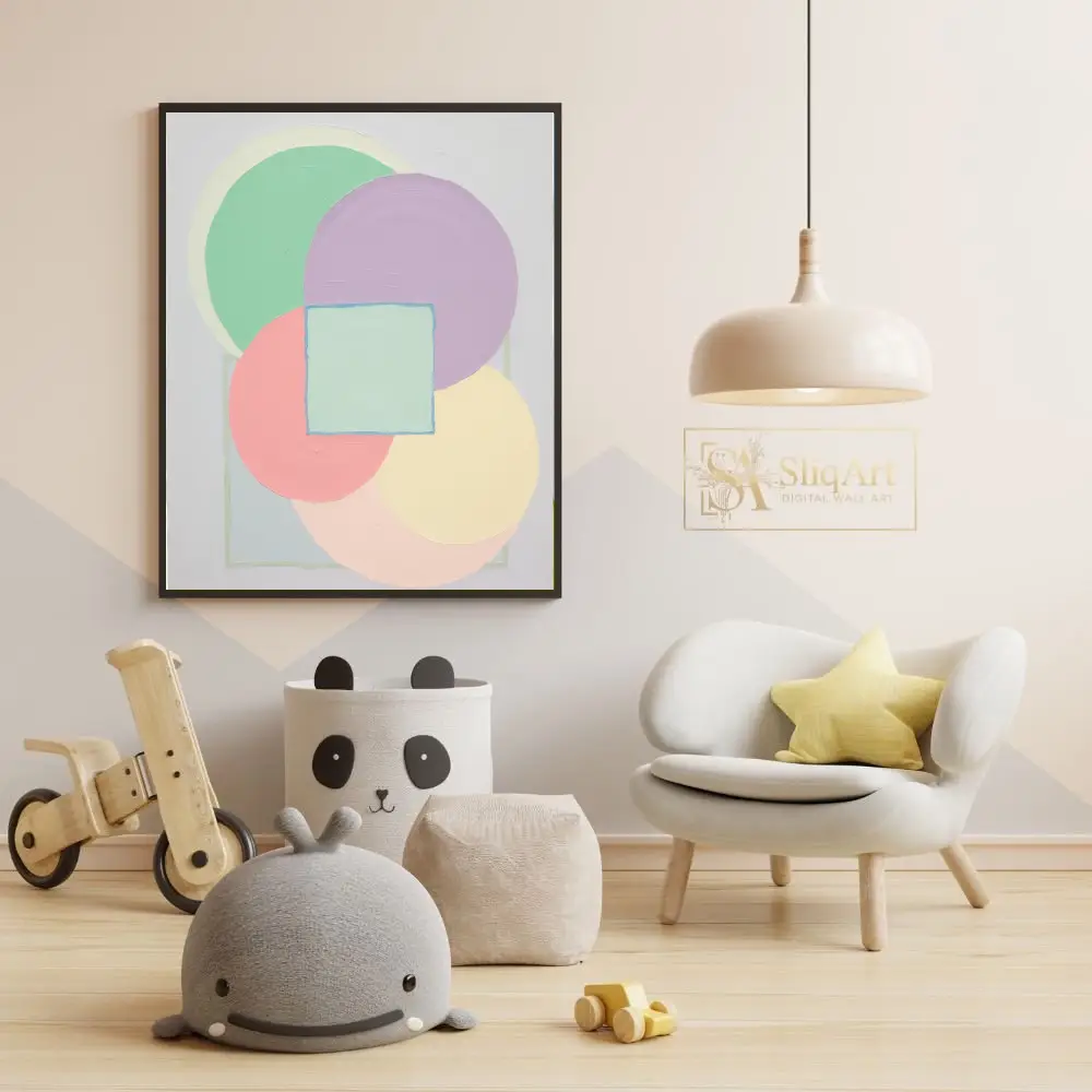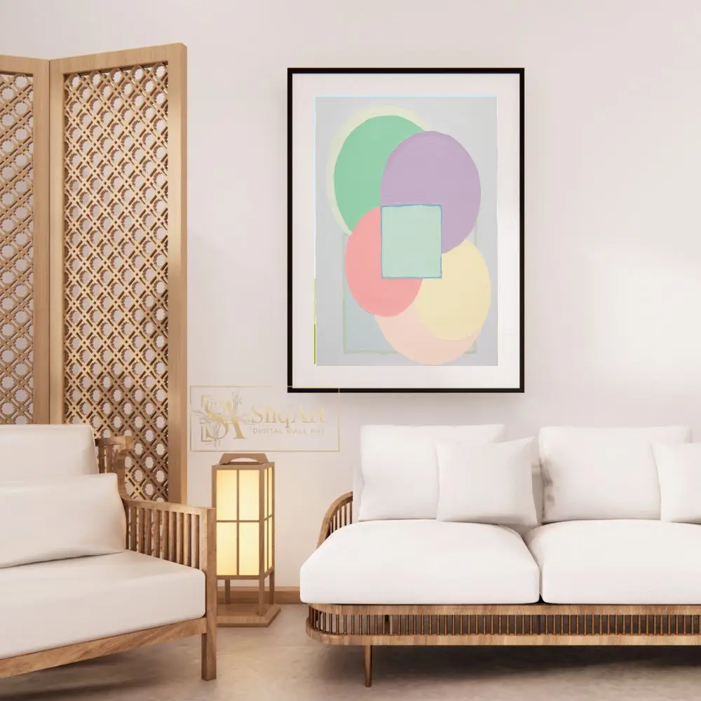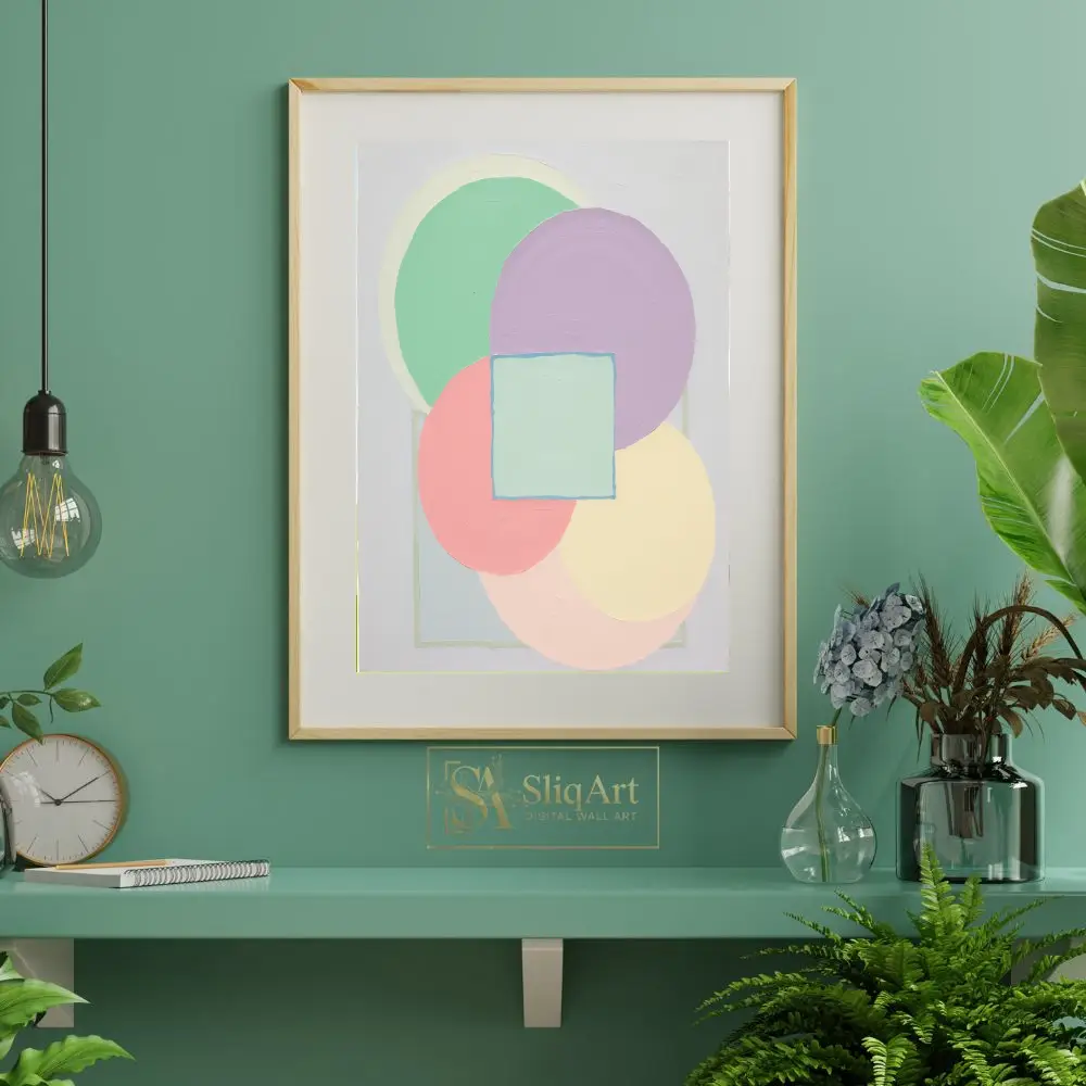 The artwork features a harmonious composition of overlapping pastel circles and a central square, creating a sense of soft balance and modern tranquility. The textured brushwork adds a tactile depth to the soothing palette of mint green, lavender, salmon pink, and pale yellow, making it an ideal choice for contemporary homes looking for a touch of serene elegance.