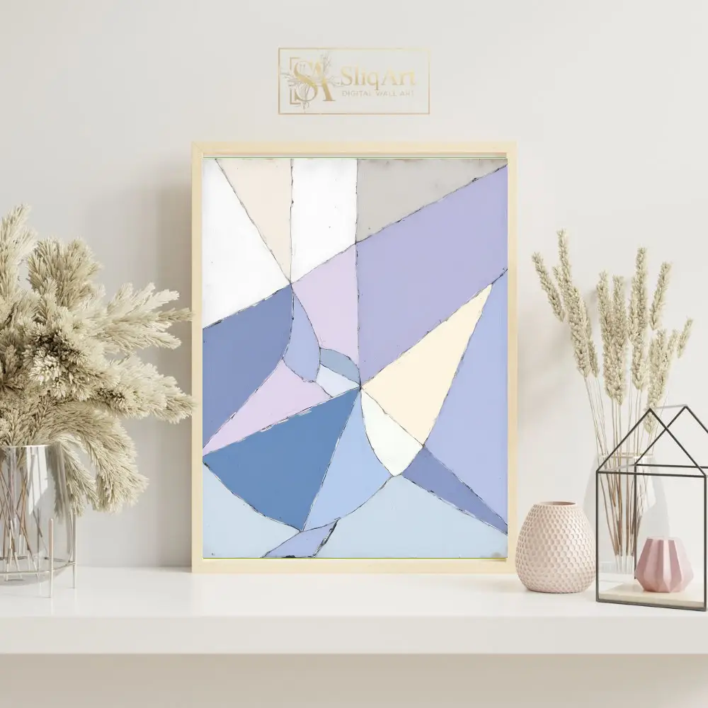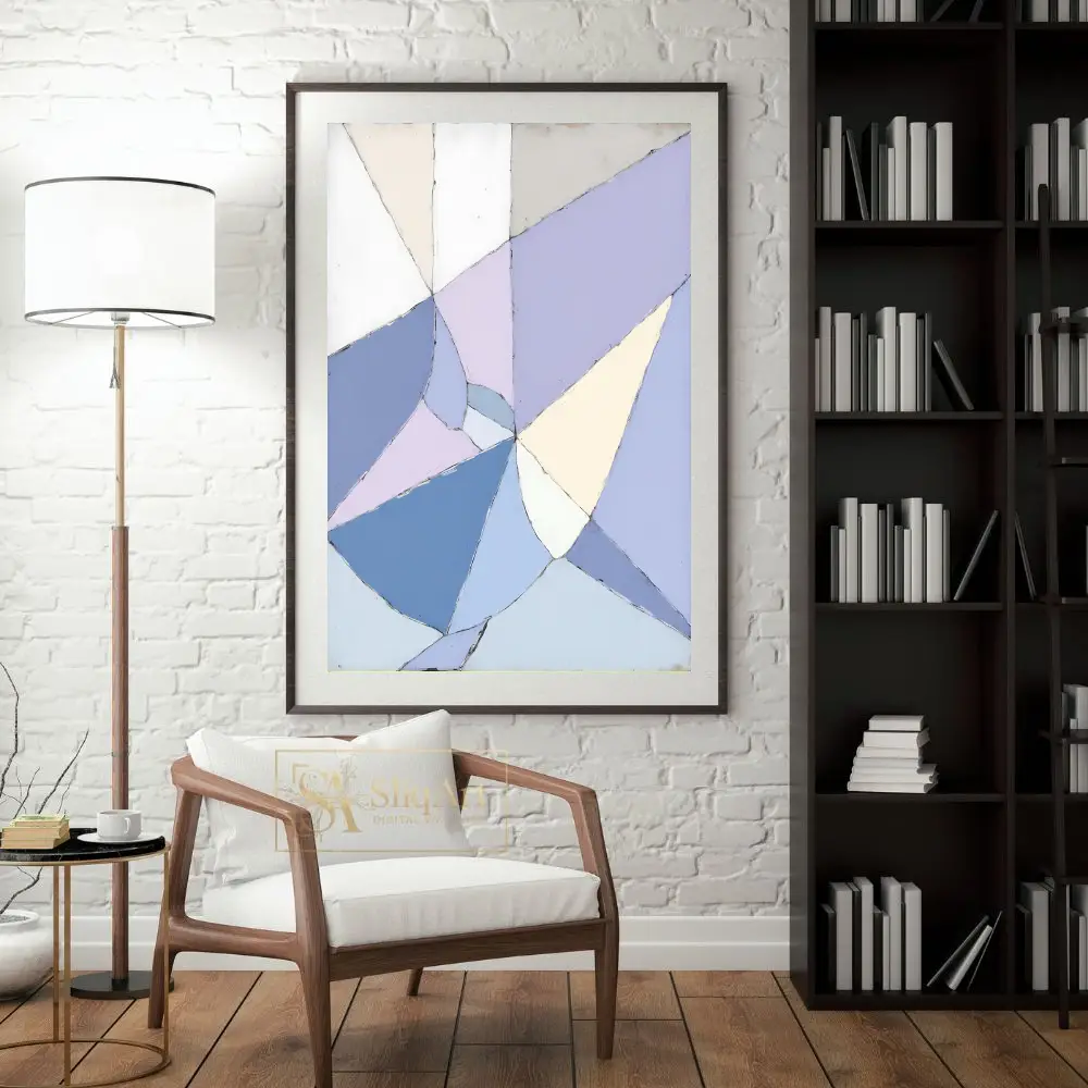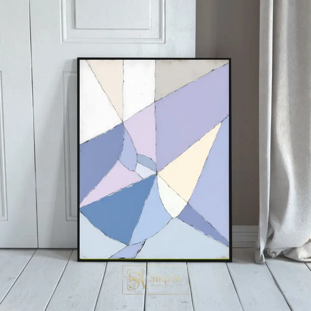 Soft hues of lavender, periwinkle blue, and cream converge at a central point, creating a sense of depth and movement. The textured brushwork adds a tactile quality to the geometric planes, making it a sophisticated addition to any modern interior seeking a sense of calm and structure.