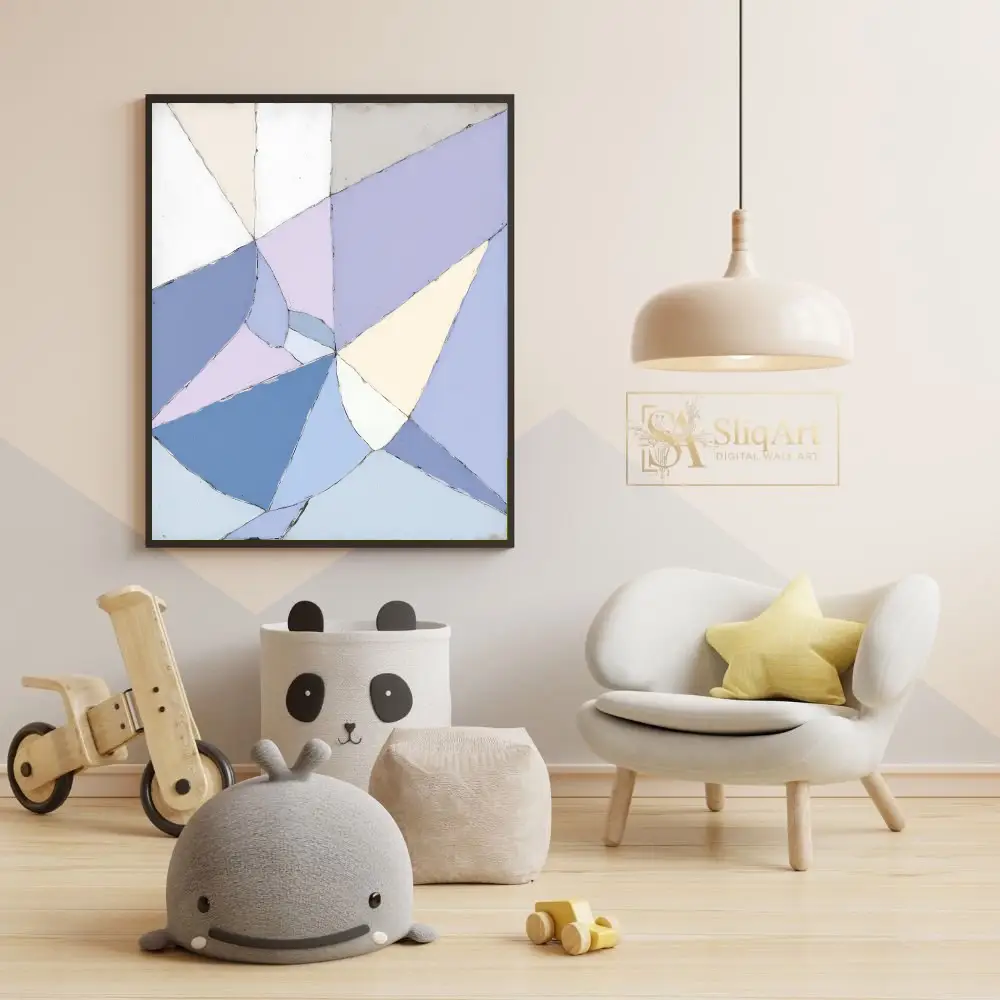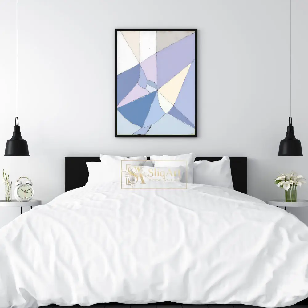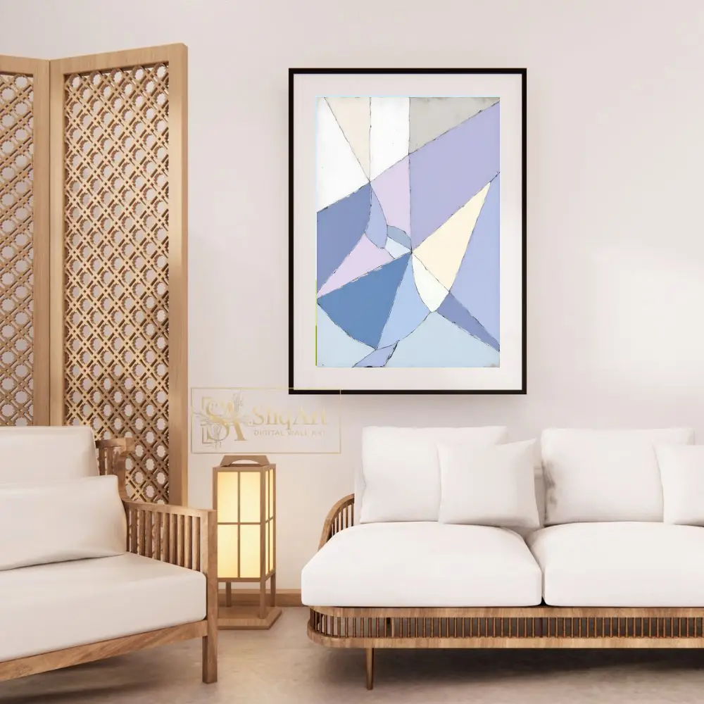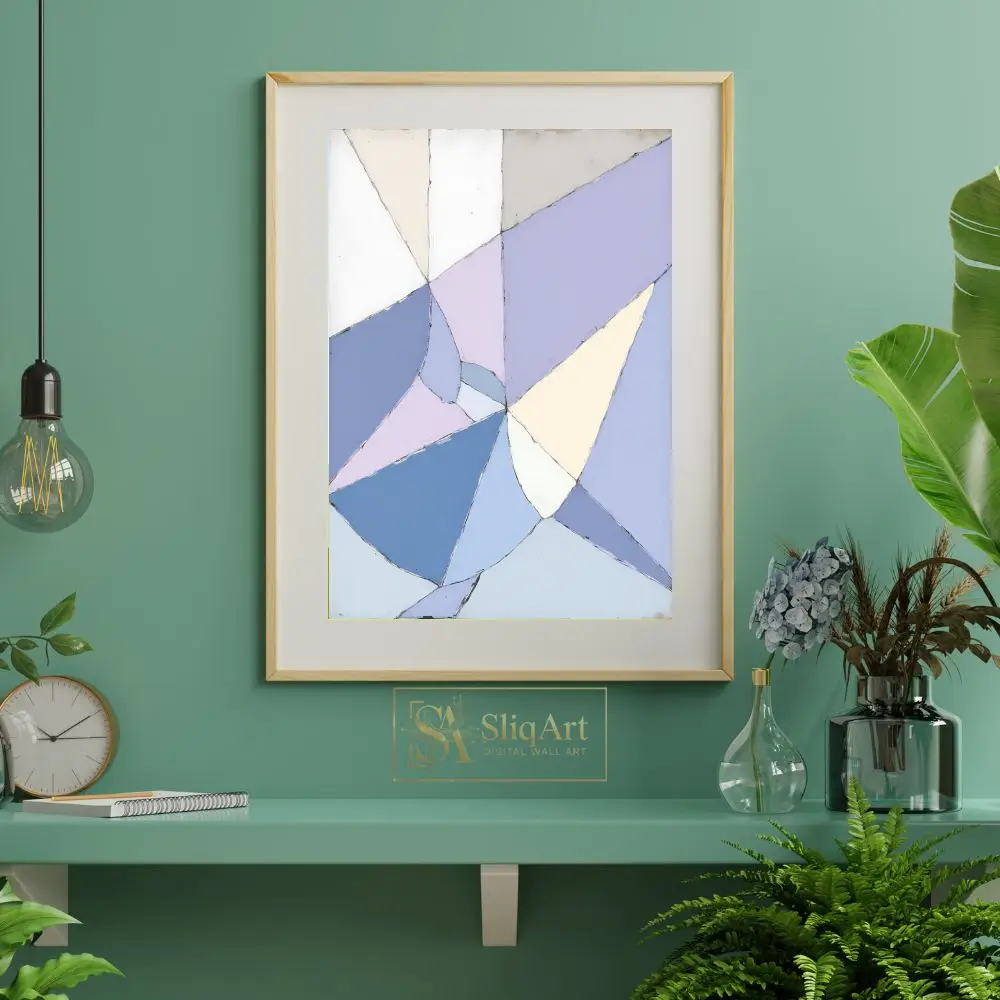 Soft hues of lavender, periwinkle blue, and cream converge at a central point, creating a sense of depth and movement. The textured brushwork adds a tactile quality to the geometric planes, making it a sophisticated addition to any modern interior seeking a sense of calm and structure.
