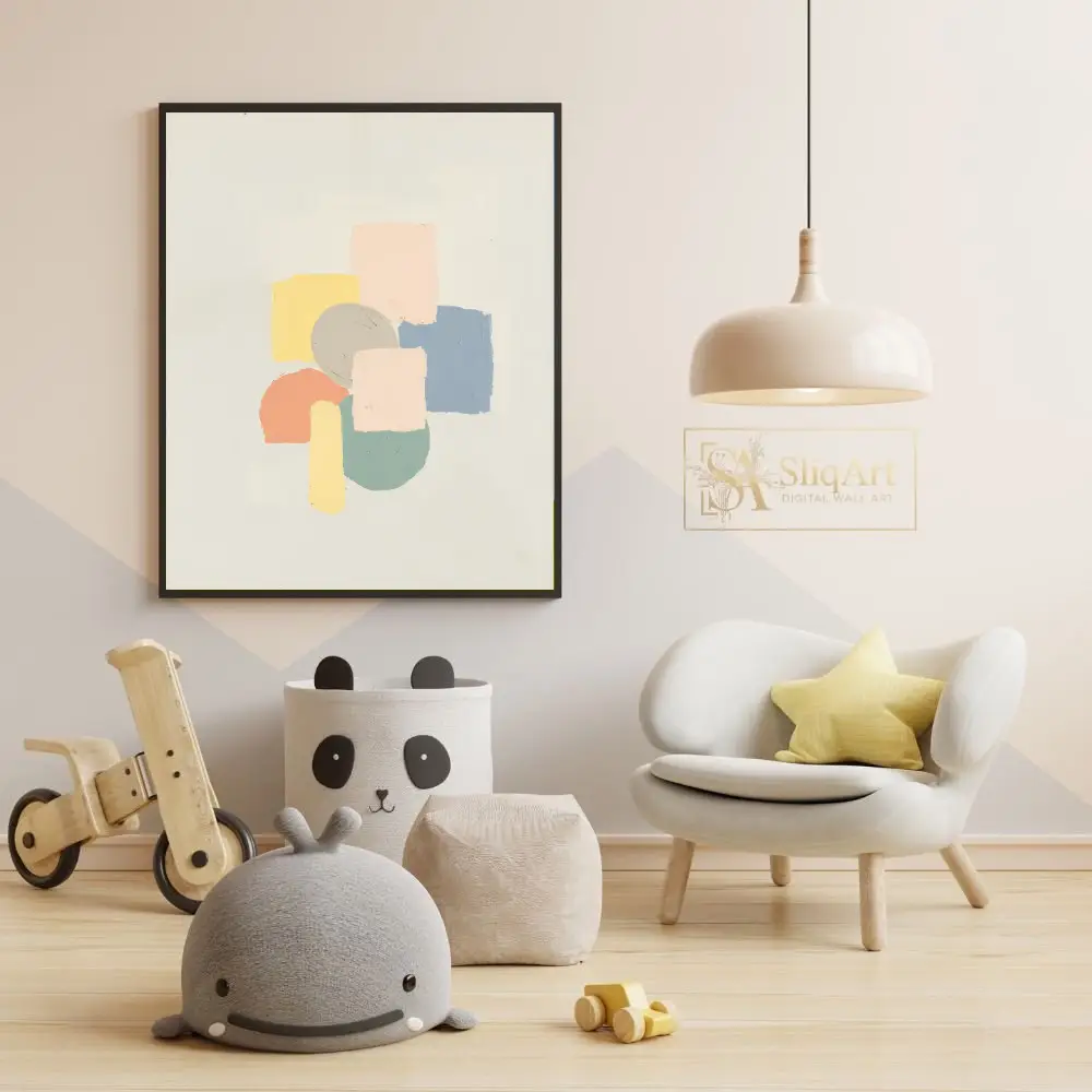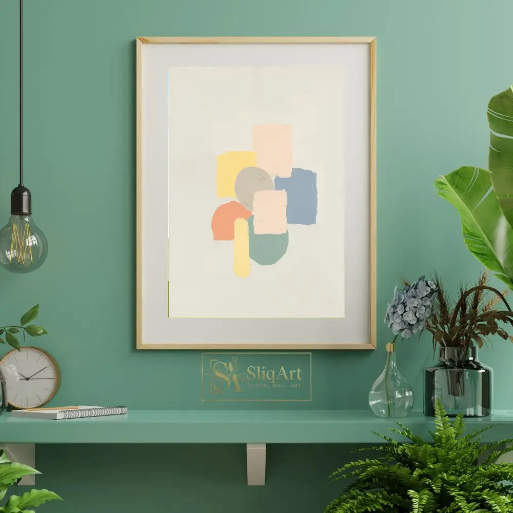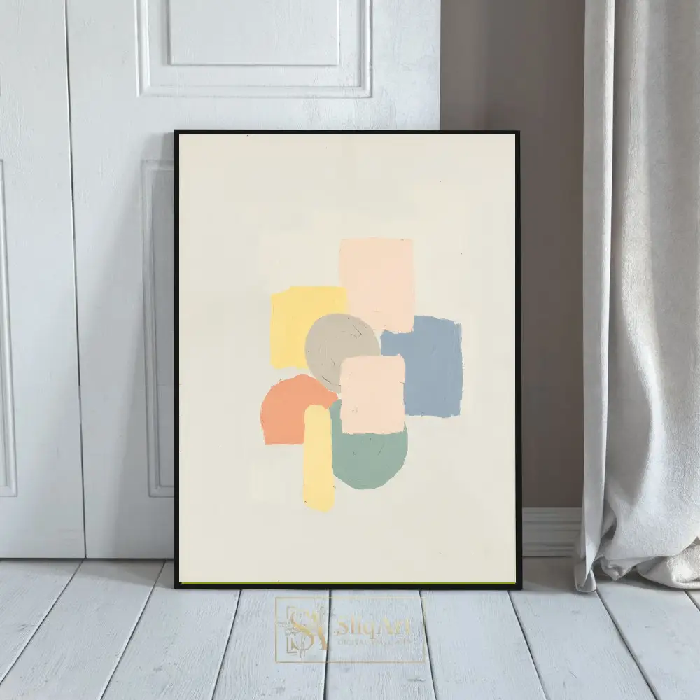 This captivating abstract artwork features a balanced arrangement of geometric and organic forms in a soothing pastel palette. The piece showcases heavy texture and visible brushwork, bringing a tactile, three-dimensional feel to your walls.