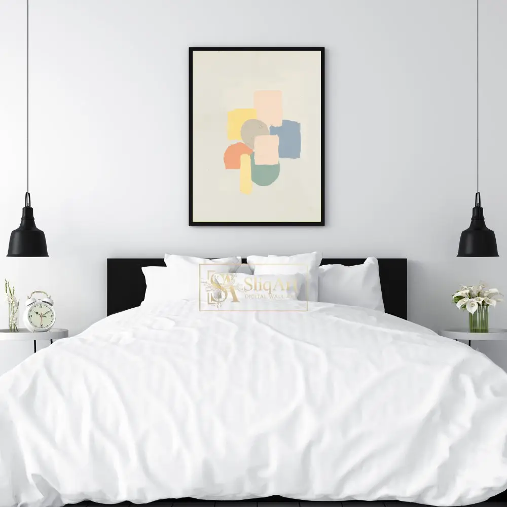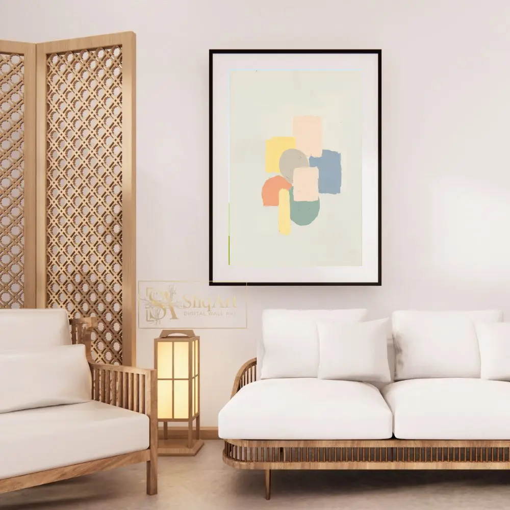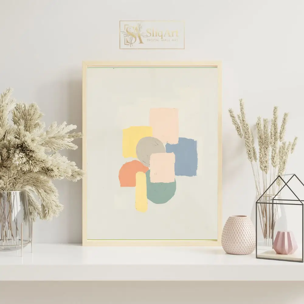 Muted shades of dusty blue, soft peach, mint green, and pale yellow are set against a pristine white background, evoking a sense of modern serenity and artistic sophistication. Its impasto-style application adds depth and character, making it an ideal choice for collectors of contemporary minimalist art.