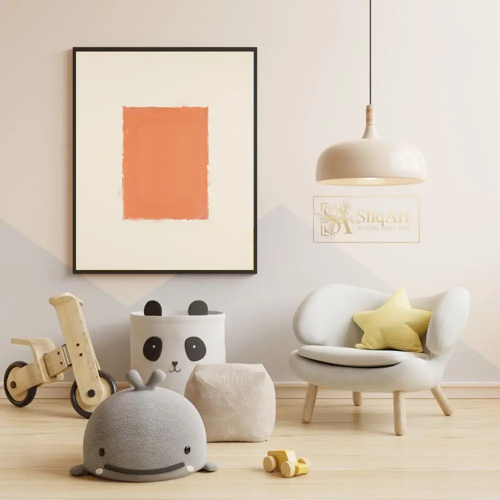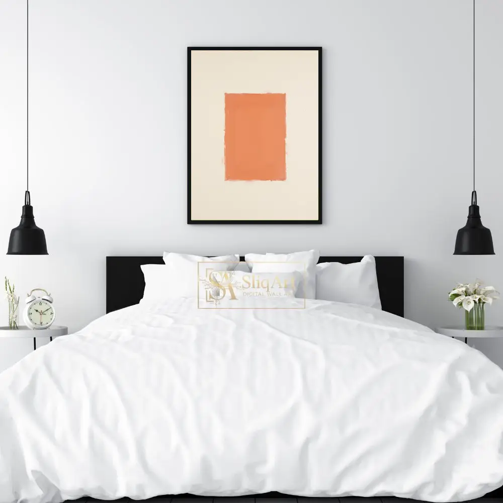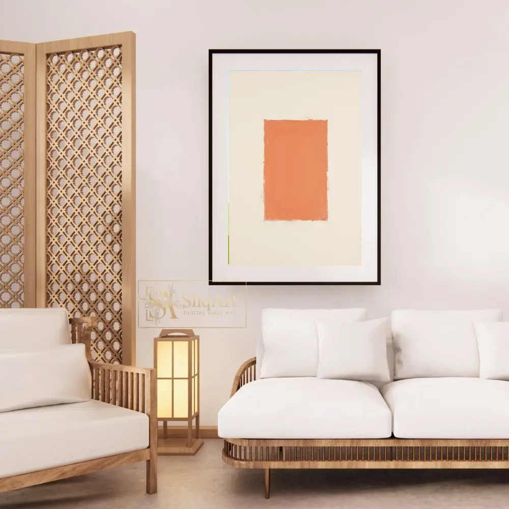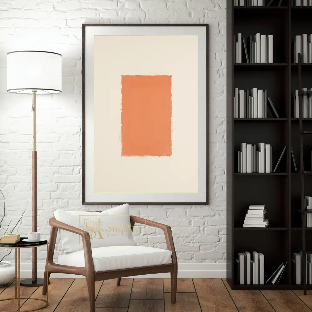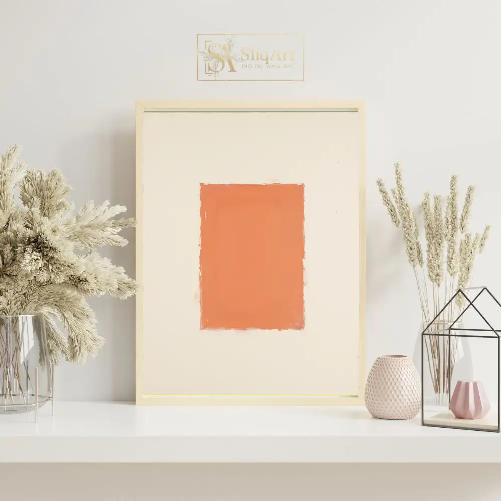 This sophisticated piece features a singular, textured rectangle of warm peach and terracotta tones centered on a serene, cream-colored background.