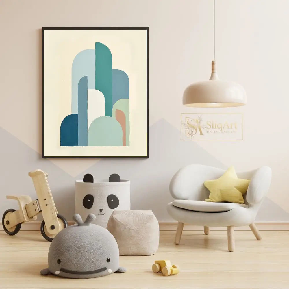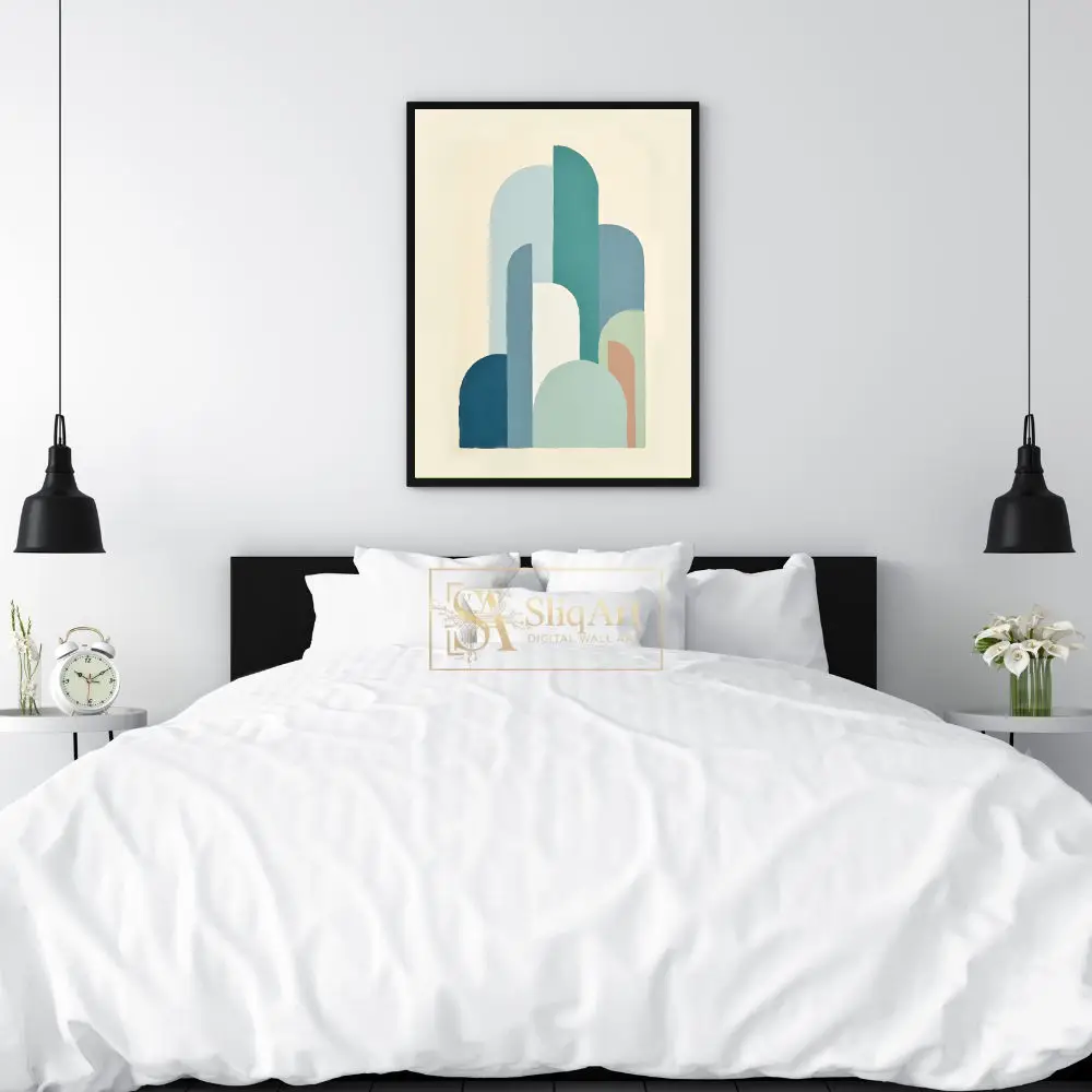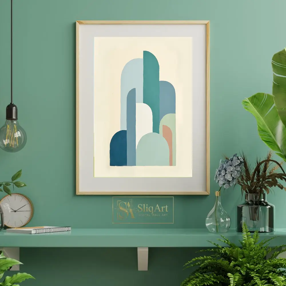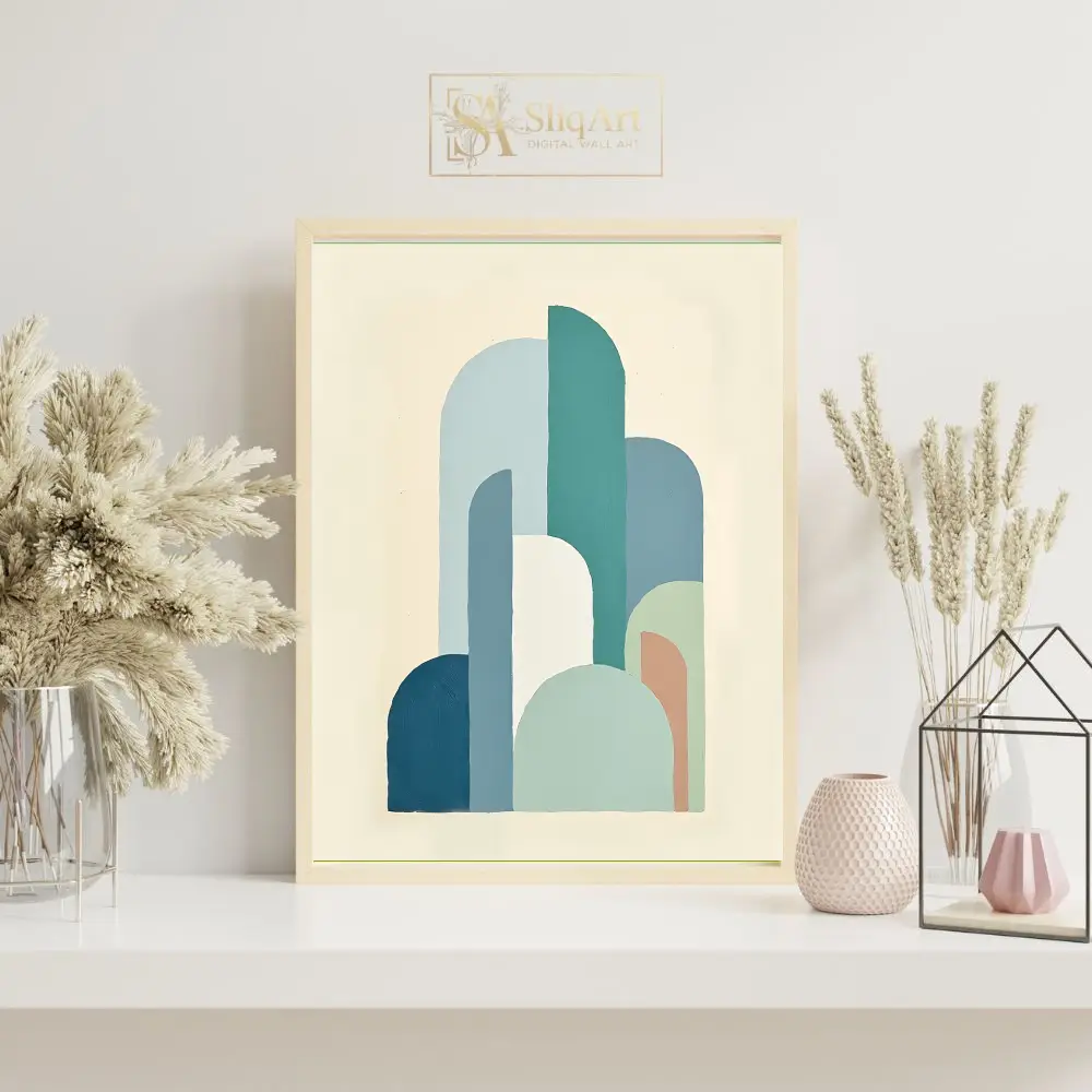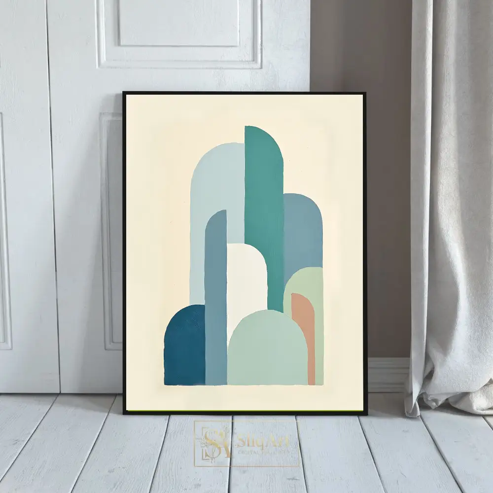 Elevate your interior with this stunning minimalist abstract art piece. Featuring a harmonious arrangement of layered arches in a soothing palette of teal, navy, and soft blues, complemented by earthy terracotta and sage green accents.